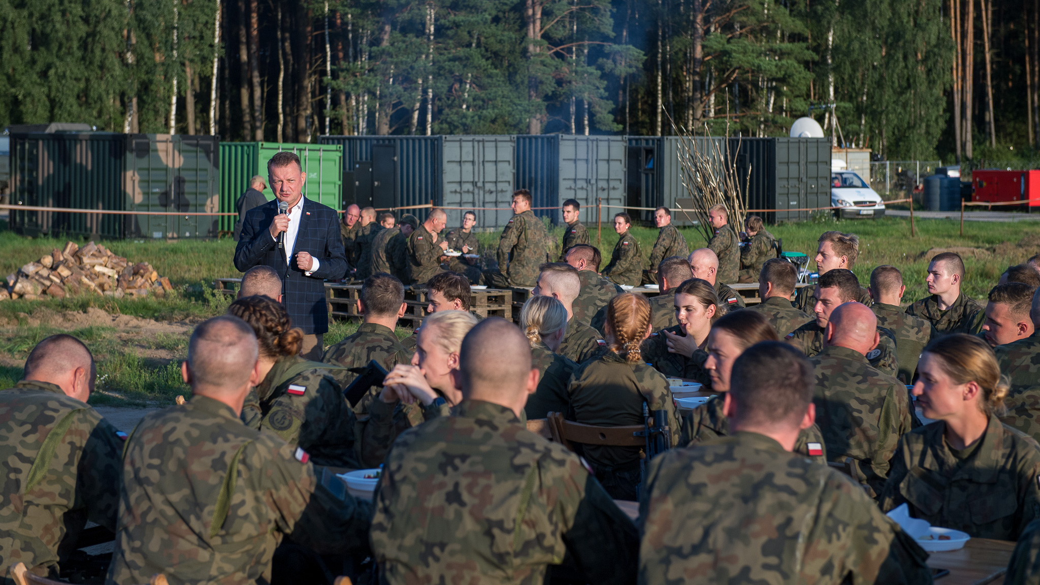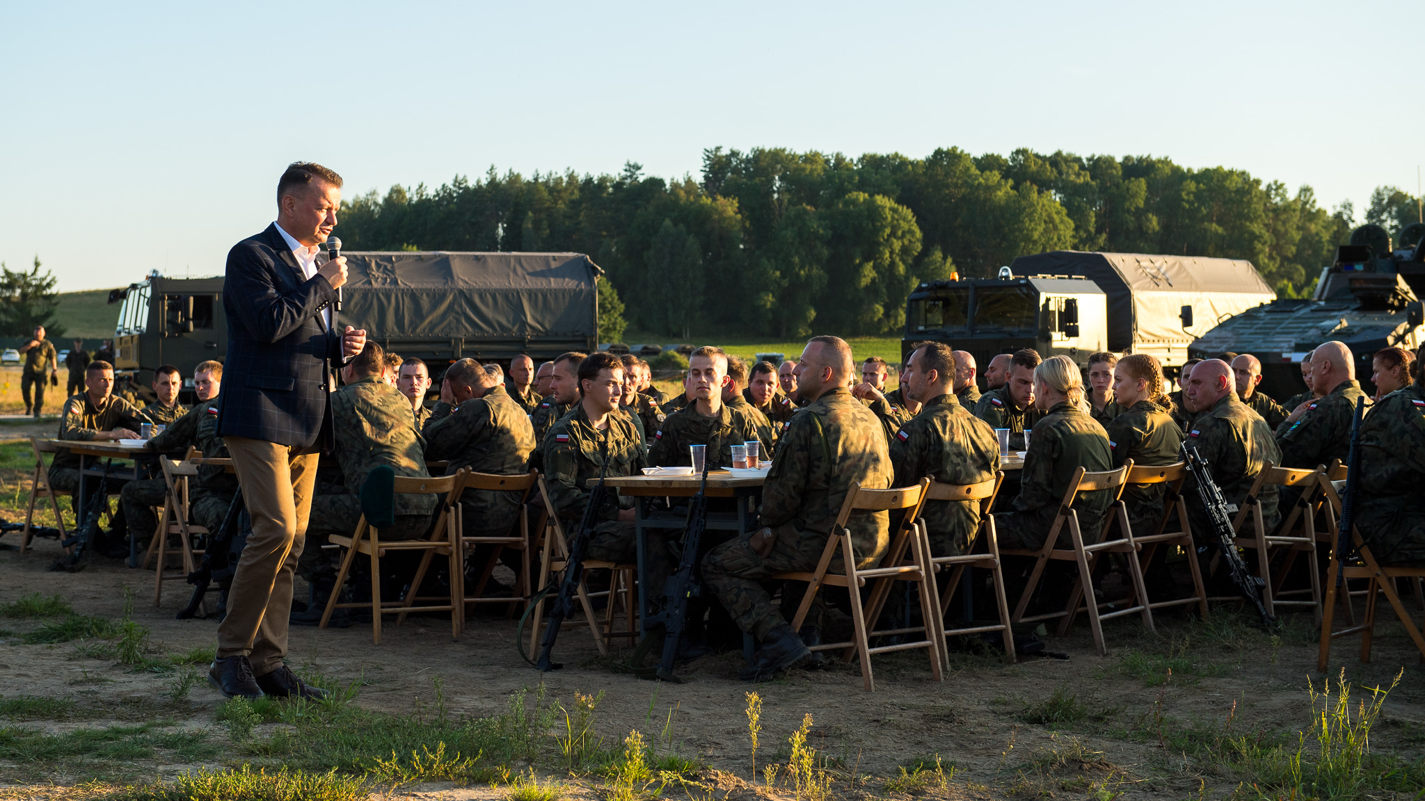 „W waszej grupie są żołnierze z 12 Brygady Zmechanizowanej, a więc przyjechaliście z północno- zachodniej części naszego kraju tutaj, na wschodnią granicę naszego kraju. Dziękuję wam za to, że jesteście zawsze tam, gdzie potrzebne jest wasze wsparcie. Są tu również żołnierze z Wojsk Obrony Terytorialnej, z 1 Podlaskiej Brygady Obrony Terytorialnej. Dlatego też dziękuję wam za tę współpracę, którą tutaj tworzycie dla Polski. To niezwykle istotne dla naszego bezpieczeństwa wspólnego bezpieczeństwa”
