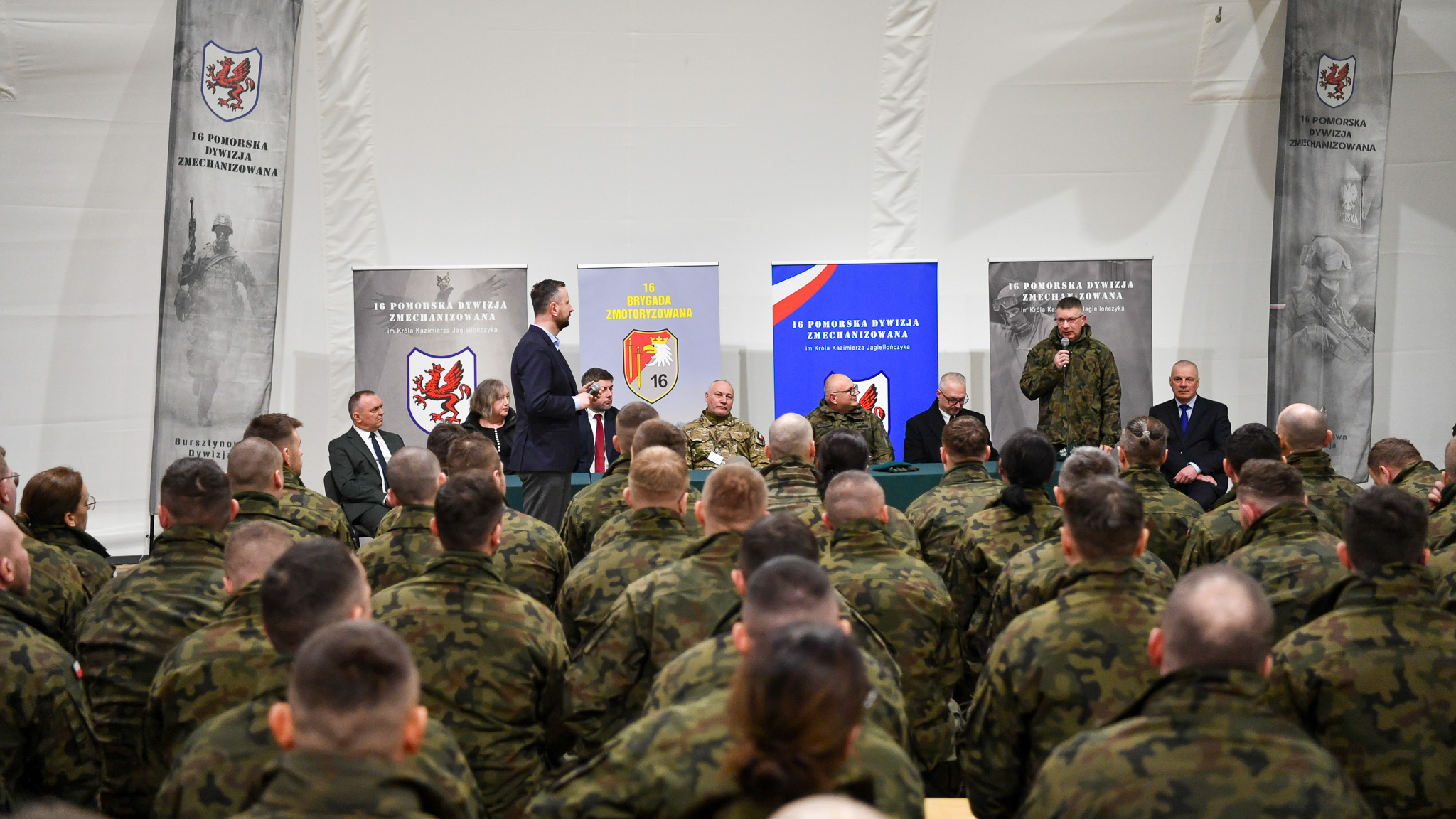 – W tamtym roku udało się wprowadzić kilka zmian dotyczących indywidualnego wyposażenia żołnierzy i ten proces jest kontynuowany. Także tych dotyczących obuwia, zarostu czy kwestii związanych z tatuażami. Może to są dla niektórych drobne rzeczy ale także te sprawy udało się wypracować, zmienić wspólnie z biurem pełnomocnika do spraw jakości służby wojskowej. (…) Obecnie podpisujemy wiele umów dotyczących modernizacji Wojska Polskiego. Cześć z tego zamawianego w przemyśle zbrojeniowym sprzętu i uzbrojenia trafi także do was. Do 16 brygady. (…) Nowy sprzęt wymaga też dobrej infrastruktury, dobrego przechowywania. Nad tymi tematami także pracujemy w ministerstwie. Dzisiaj wojsko jest w powiecie nidzickim największym pracodawcą. Nie ma większego zakładu pracy. Więc tym bardziej nasza współpraca pomiędzy wojskiem, a samorządem, władzami lokalnymi jest dla nas ważna