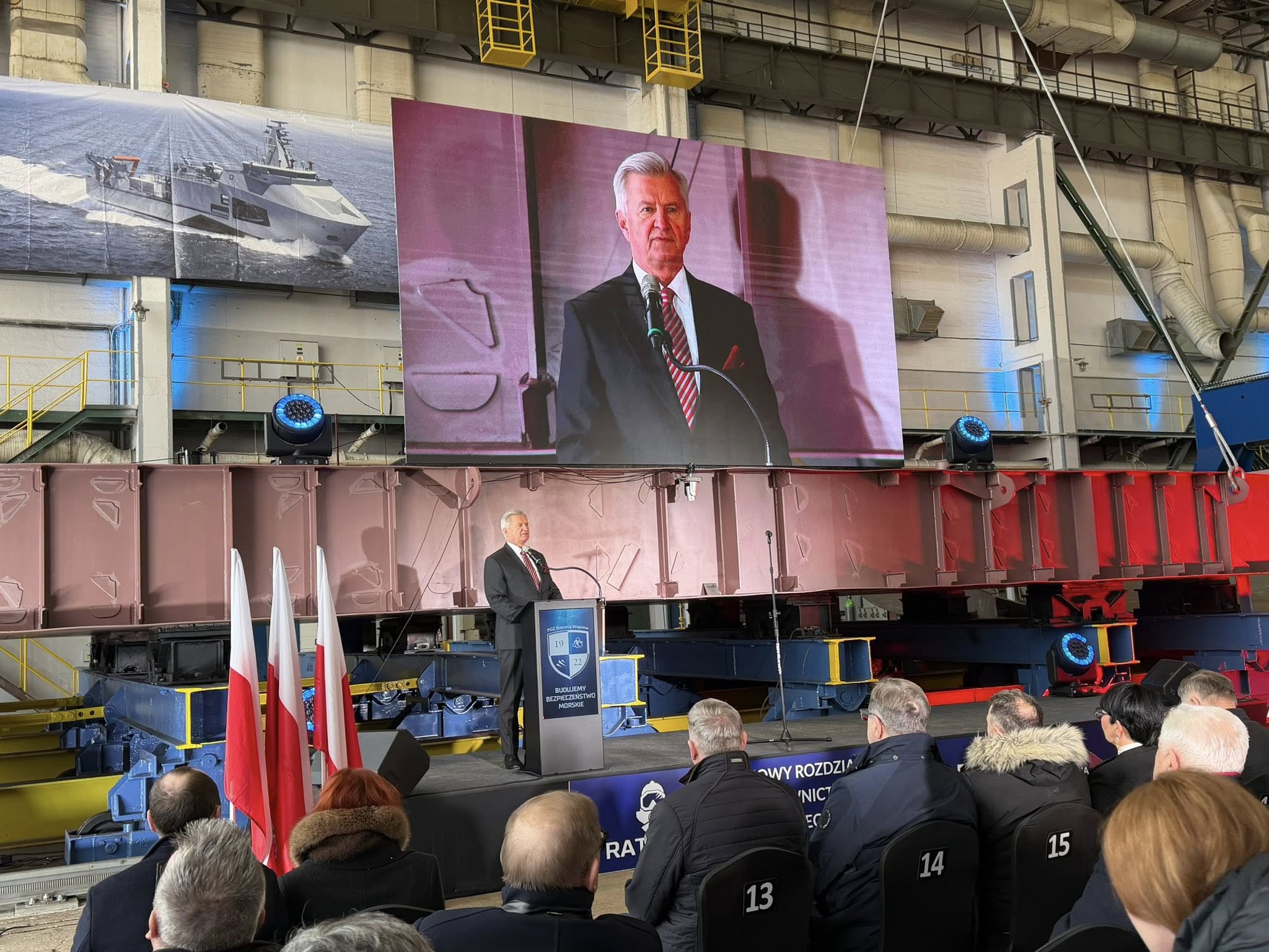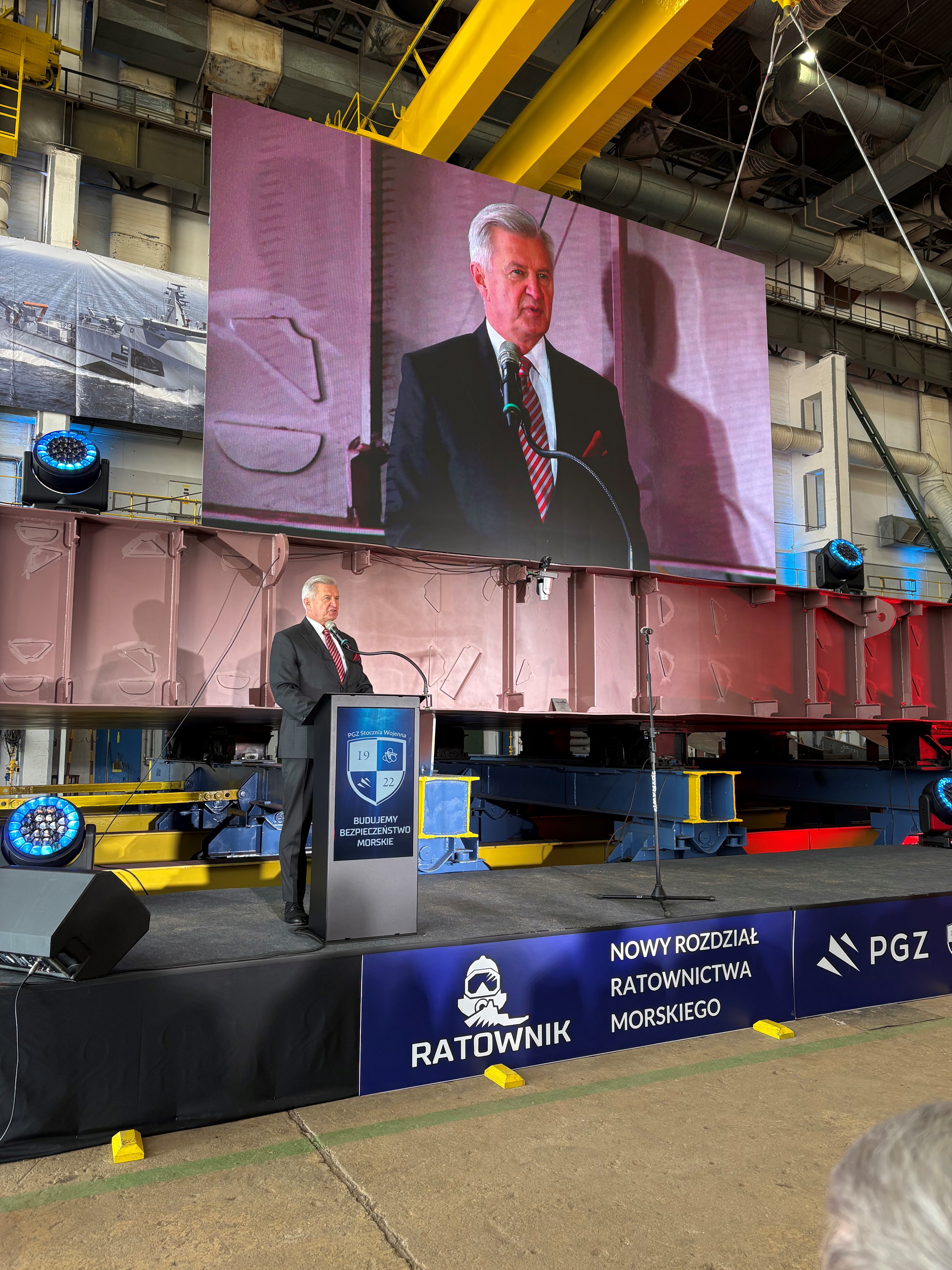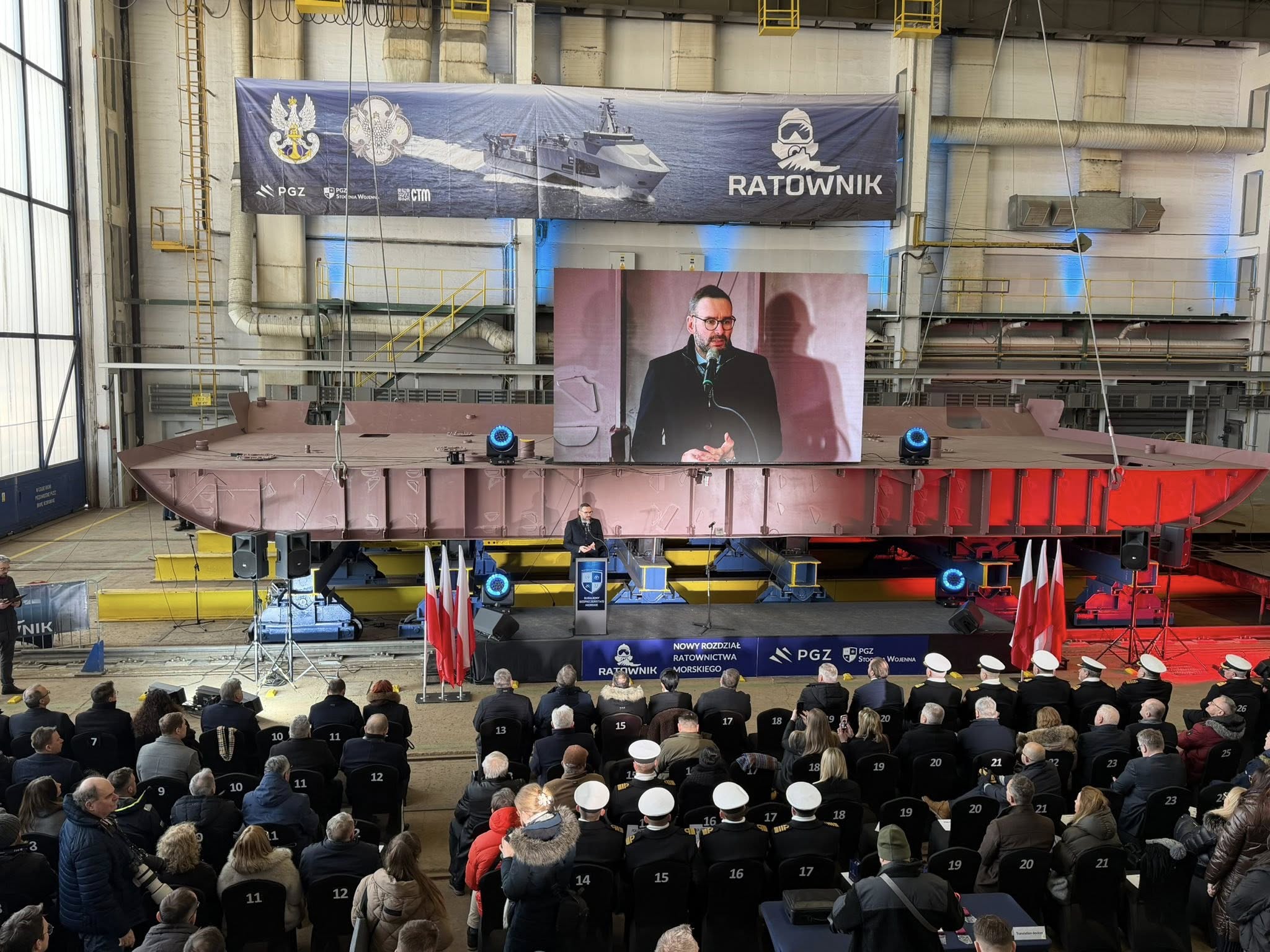 - Okręt „Ratownik” to wyspecjalizowana jednostka wsparcia, kluczowa dla zabezpieczenia działań operacyjnych okrętów podwodnych. Nowoczesne wyposażenie ratownicze, duża autonomiczność oraz możliwości działania na pełnym morzu sprawią, że stanie się jednym z ważnych elementów systemu zapewniania bezpieczeństwa naszym marynarzom i realnym wzmocnieniem zdolności operacyjnych Sił Zbrojnych RP. Pragnę przekazać wyrazy uznania wszystkim, którzy przyczyniają się do realizacji tego przedsięwzięcia: projektantom, inżynierom, stoczniowcom, przedstawicielom przemysłu obronnego oraz Marynarki Wojennej - napisał w liście do uczestników uroczystości położenia stępki pod okręt ratowniczy RATOWNIK wicepremier Władysław Kosiniak-Kamysz. List szefa MON podczas uroczystości odczytał wiceminister Stanisław Wziątek.