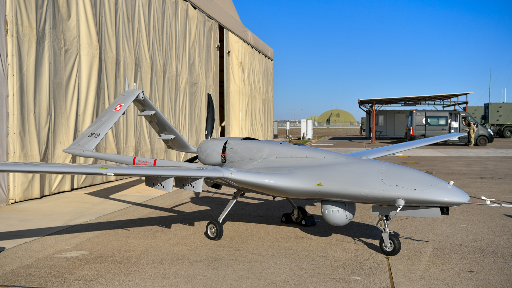 - Stojące za mną Bayraktary są tutaj w bazie – nasze, polskie, produkcji tureckiej. Można więc powiedzieć, że wróciły do domu i są wdrożone do służby. Wcześniej przez kilka lat służyli tutaj polscy żołnierze – piloci operujący na Bryzach, więc cieszę się, że ta misja wdrożenia Bayraktarów do patrolowania Morza Śródziemnego w misji natowskiej, sojuszniczej, misji solidarności, dbania o bezpieczeństwo i odstraszania jest dzisiaj realizowana. Z tego miejsca chciałbym podziękować wszystkim polskim kontyngentom wojskowym – a jest ich kilka w Europie i na świecie, bo to i Łotwa, Rumunia, Irak, Liban, Bośnia i Hercegowina oraz Kosowo. Nie brakuje więc miejsc, w których służą polscy żołnierze. Wszędzie tam, gdzie są, dają najlepszą wizytówkę naszych Sił Zbrojnych RP i Polski. Przed chwilą rozmawiałem z dowódcami tureckimi, amerykańskimi i hiszpańskimi, bo takie trzy nacje tutaj służą. Wszyscy wyrażali się w najlepszych słowach, z wysokim uznaniem dla umiejętności naszych pilotów bezzałogowców, personelu naziemnego oraz całego personelu, który jest tutaj oddany tej misji. Dziękuję gospodarzom – Republice Turcji – za wkład, gościnność i sojusz, który jest nam bardzo potrzebny. Turcja jest drugą co do wielkości armią NATO, Polska trzecią, więc ta współpraca, także w budowie nowej architektury bezpieczeństwa europejskiego, jest dla nas niezwykle istotna