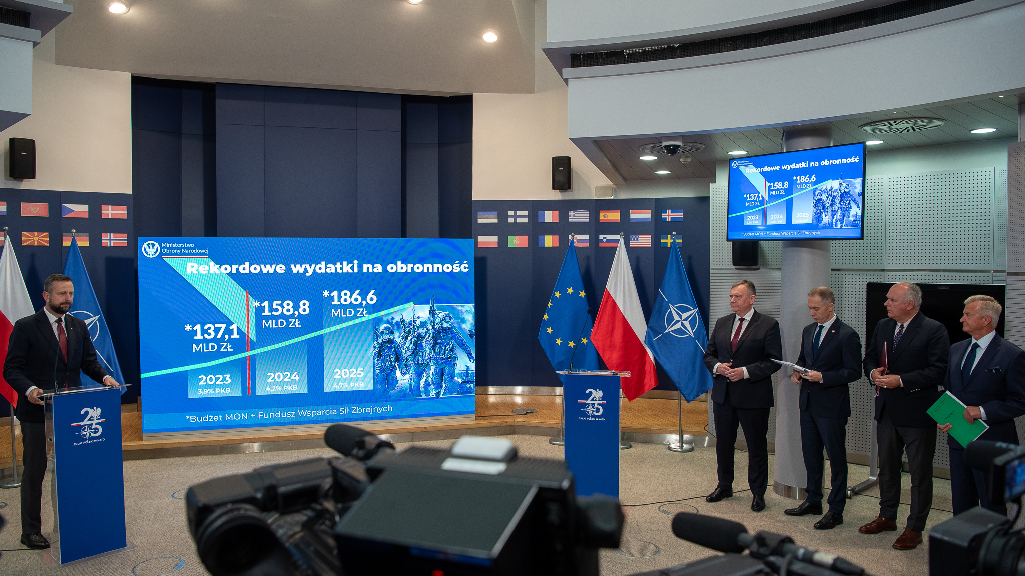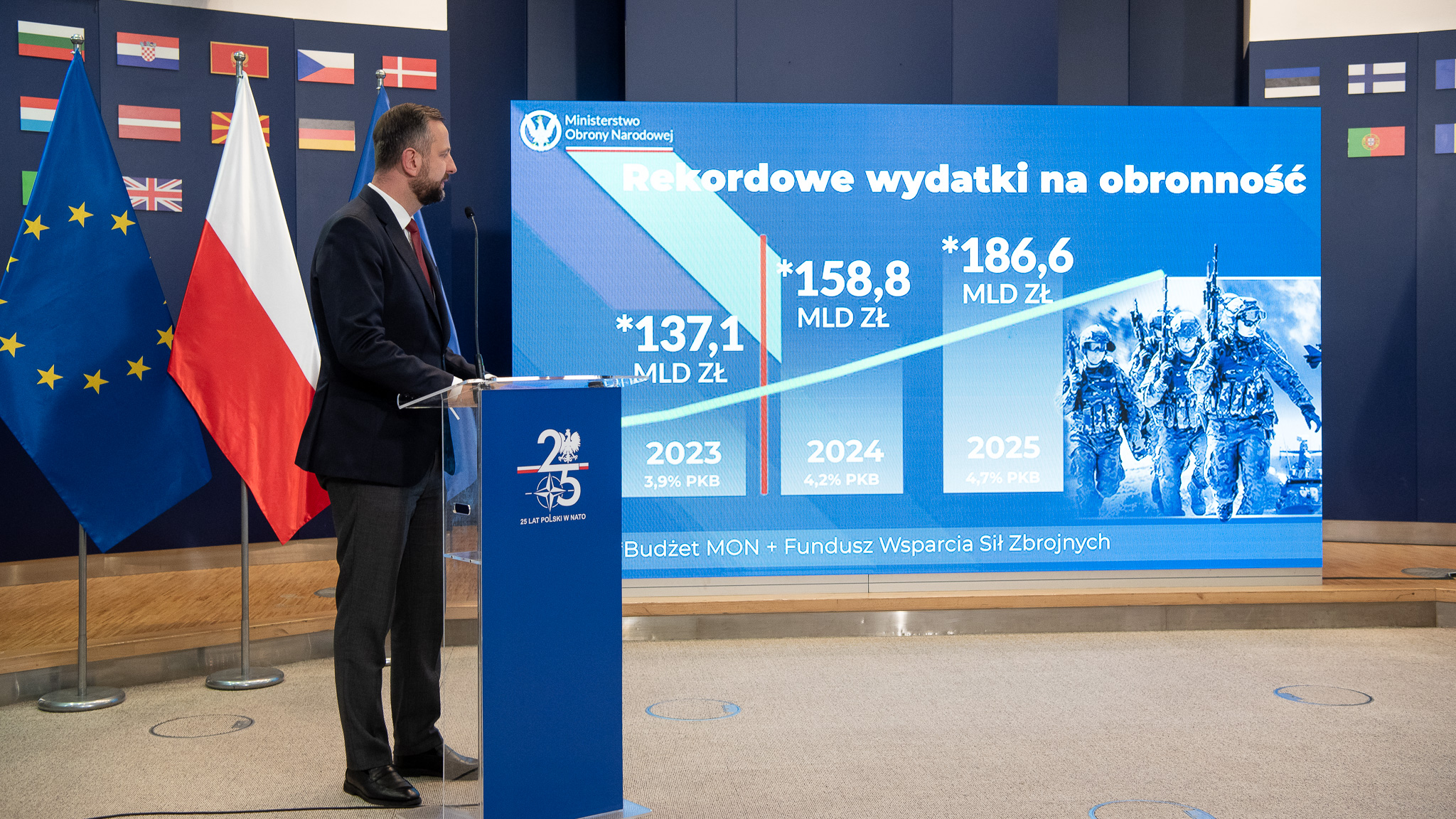 - Kiedy nasi poprzednicy w 2023 roku przygotowywali pełny budżet to było ok. 137 miliardów zł. To są wydatki z budżetu, z części 29. budżetu państwa - wydatki Ministerstwa Obrony Narodowej i Funduszu Wsparcia Sił Zbrojnych, który jest zlokalizowany w Banku Gospodarstwa Krajowego. Z tych dwóch źródeł od kilku lat finansowana jest polska armia, polskie bezpieczeństwo i transformacja. (...) Kolejny rok to jest rok, w którym przejmujemy władzę i przygotowujemy też już swoją część budżetu. Przygotowywaliśmy i nanieśliśmy w tym budżecie istotne poprawki, w tym podwyżki dla wojska i pracowników cywilnych wojska o 20%. To zmieniło też naszą pozycję i spowodowało na pewno jeszcze większe zainteresowanie służbą w siłach zbrojnych. To jest rok rekordowy, w którym jesteśmy. Na dzień dzisiejszy to prawie 159 miliardów zł, 4,2% PKB - numer jeden spośród państw NATO. (…) Rada Ministrów przyjęła rekordowy budżet na obronność i na bezpieczeństwo państwa polskiego. 186 miliardów 600 milionów zł, można zaokrąglając powiedzieć 187 miliardów złotych na bezpieczeństwo państwa polskiego. To są wydatki z budżetu i z Funduszu Wsparcia Sił Zbrojnych, podkreślamy to, bo też niektórzy mówili, że będziemy likwidować, zwijać armię, że będzie mniejsza jej liczebność, że będziemy zmniejszać wydatki. Niektórzy dzisiaj próbują to jeszcze powiedzieć i ordynarnie kłamią. Polska będzie wydawać w przyszłym roku 4,7% PKB na zbrojenia i tyle będzie zapisane w budżecie