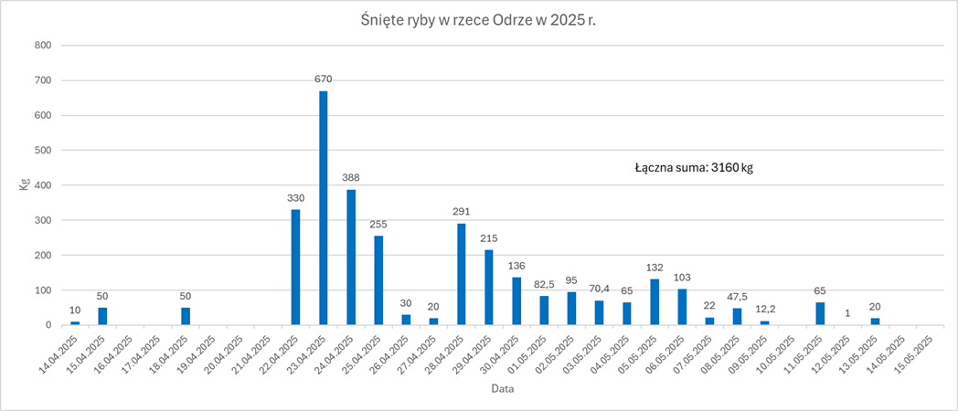 - Z Odry w województwie opolskim, pomiędzy stopniami Koźle oraz Januszkowice, od 14 kwietnia do 15 maja odłowiono łącznie około 3160 kg śniętych ryb.