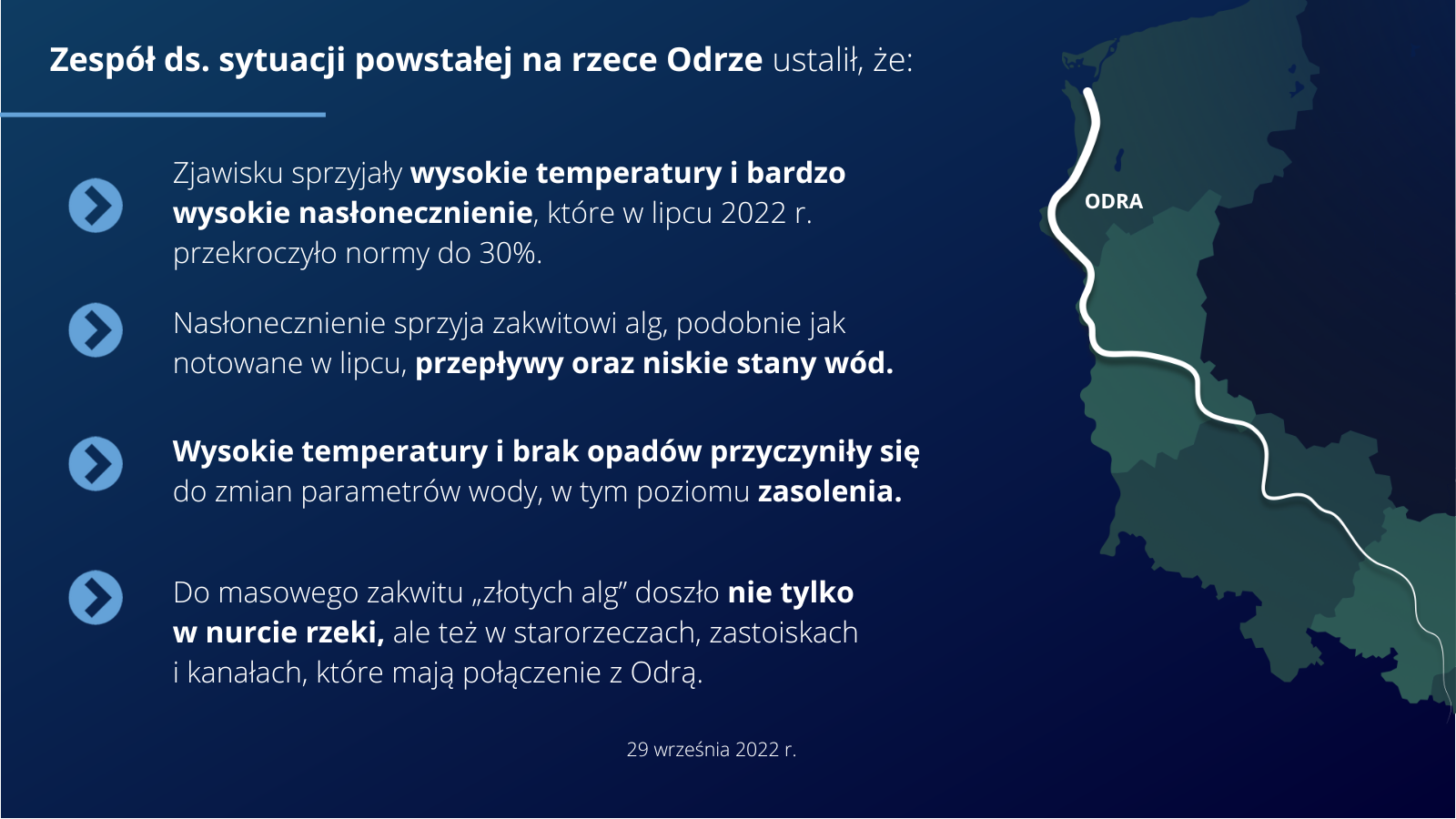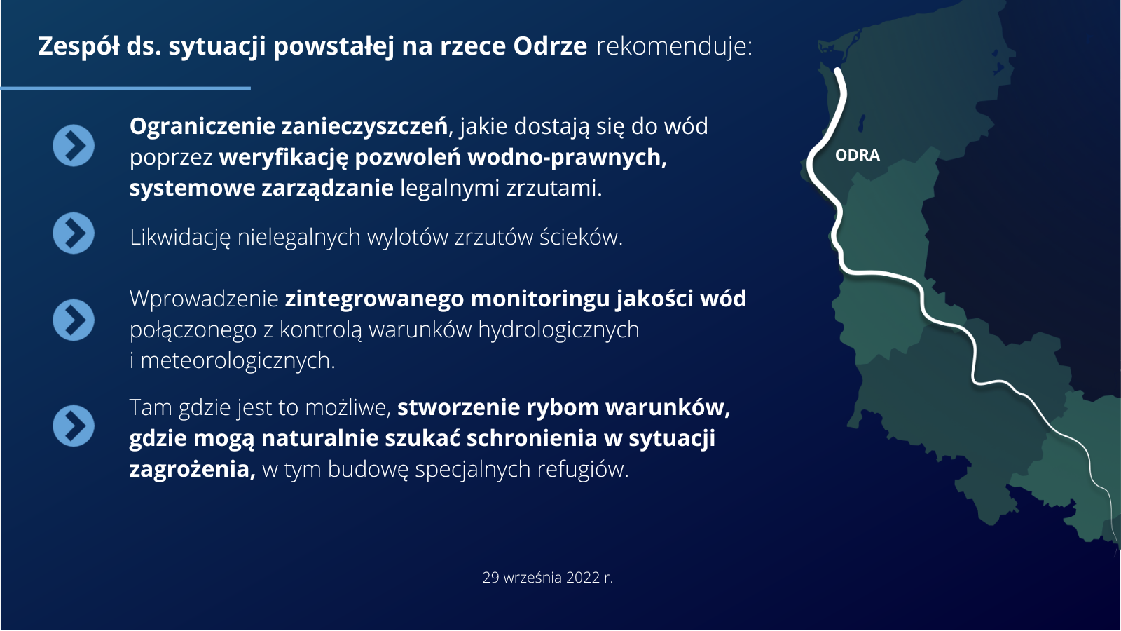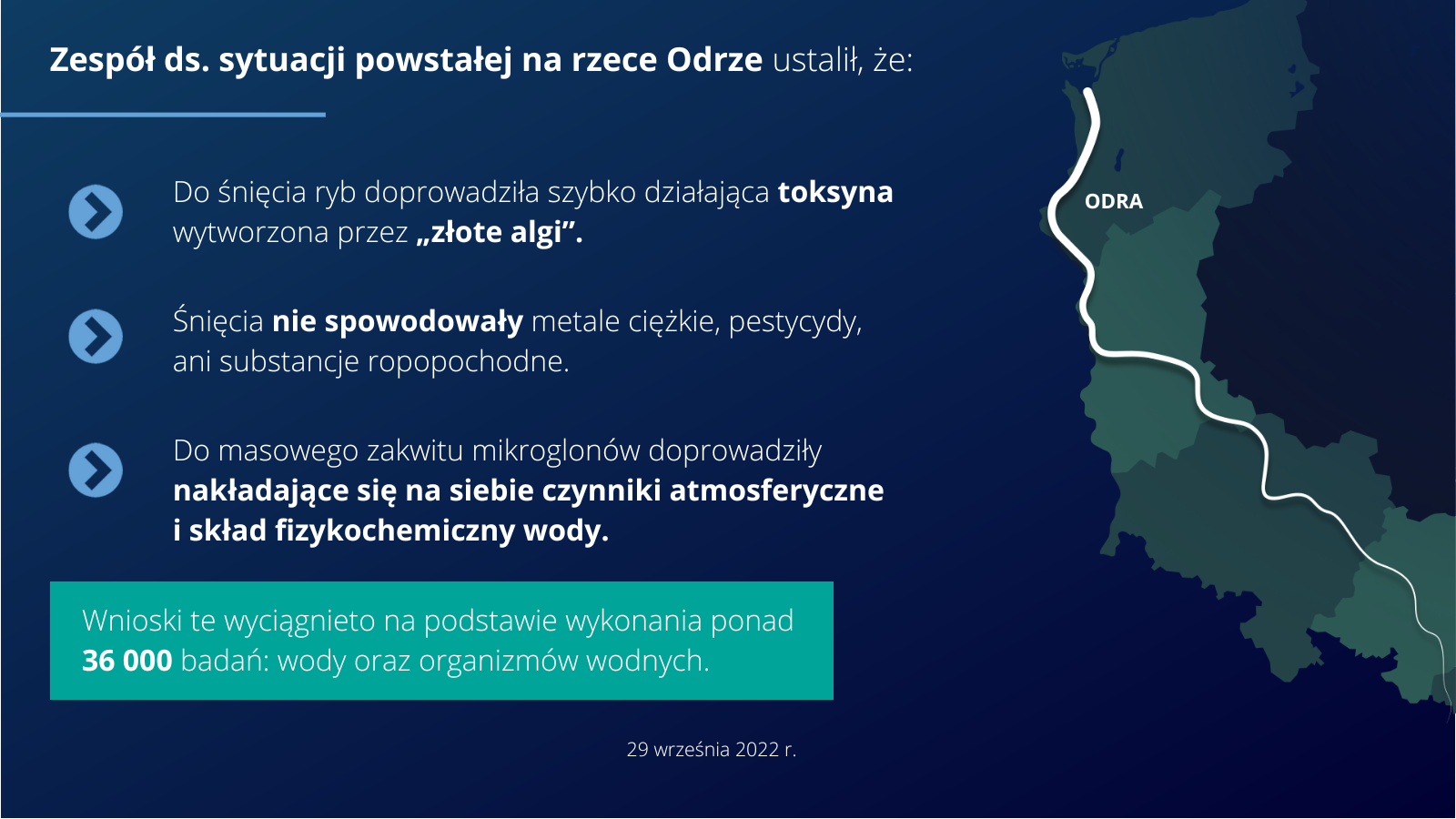Eksperci z powołanego przez minister klimatu i środowiska Zespołu do spraw sytuacji powstałej na rzece Odrze 29 września 2022 r. podsumowali prace nad ostateczną wersją raportu. Blisko 300-stronicowy dokument zawierający analizy, wyniki badań i przypisy naukowe, zgodnie z zapowiedziami zostanie opublikowany 30 września.