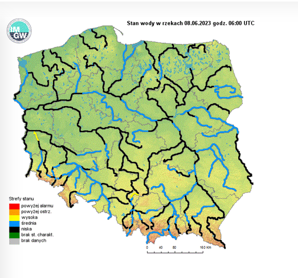 Jak podaje IMGW – PIB, obecnie stany wody w dorzeczu Odry układają się w strefie wody średniej i niskiej, lokalnie wysokiej. Stan niski obserwowano na Kłodnicy, Małej Panwi, Warcie, Widawce, Nerze, Drawie i Inie oraz lokalnie na Odrze, Nysie Kłodzkiej, Bystrzycy, Strzegomce, Widawie, Kaczawie, Baryczy, Bobrze, Kwisie, Nysie Łużyckiej, Prośnie i Noteci. Stan wysoki obserwowano lokalnie na Bobrze. Z kolei w dorzeczu Wisły stany wody układają się głównie w strefie wody średniej i niskiej, lokalnie wysokiej. Stan niski zanotowano na Brynicy, Sanie, Radomce, Pilicy, Biebrzy, Pisie, Omulwi, Orzycu, Nurcu, Wkrze i Brdzie oraz lokalnie na Wiśle, Przemszy, Sole, Skawie, Rabie, Dunajcu, Popradzie, Białej Tarnowskiej, Wisłoce, Wisłoku, Kamiennej, Narwi, Bugu, Liwcu, Bzurze i Drwęcy.