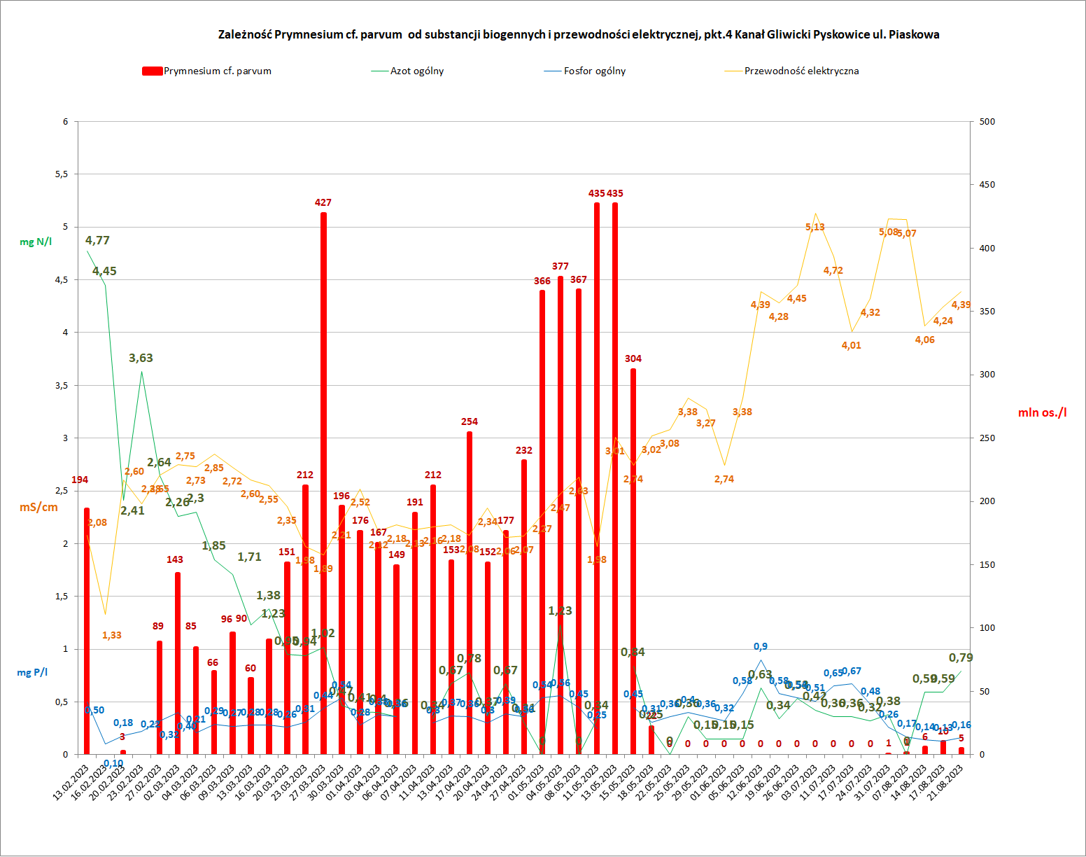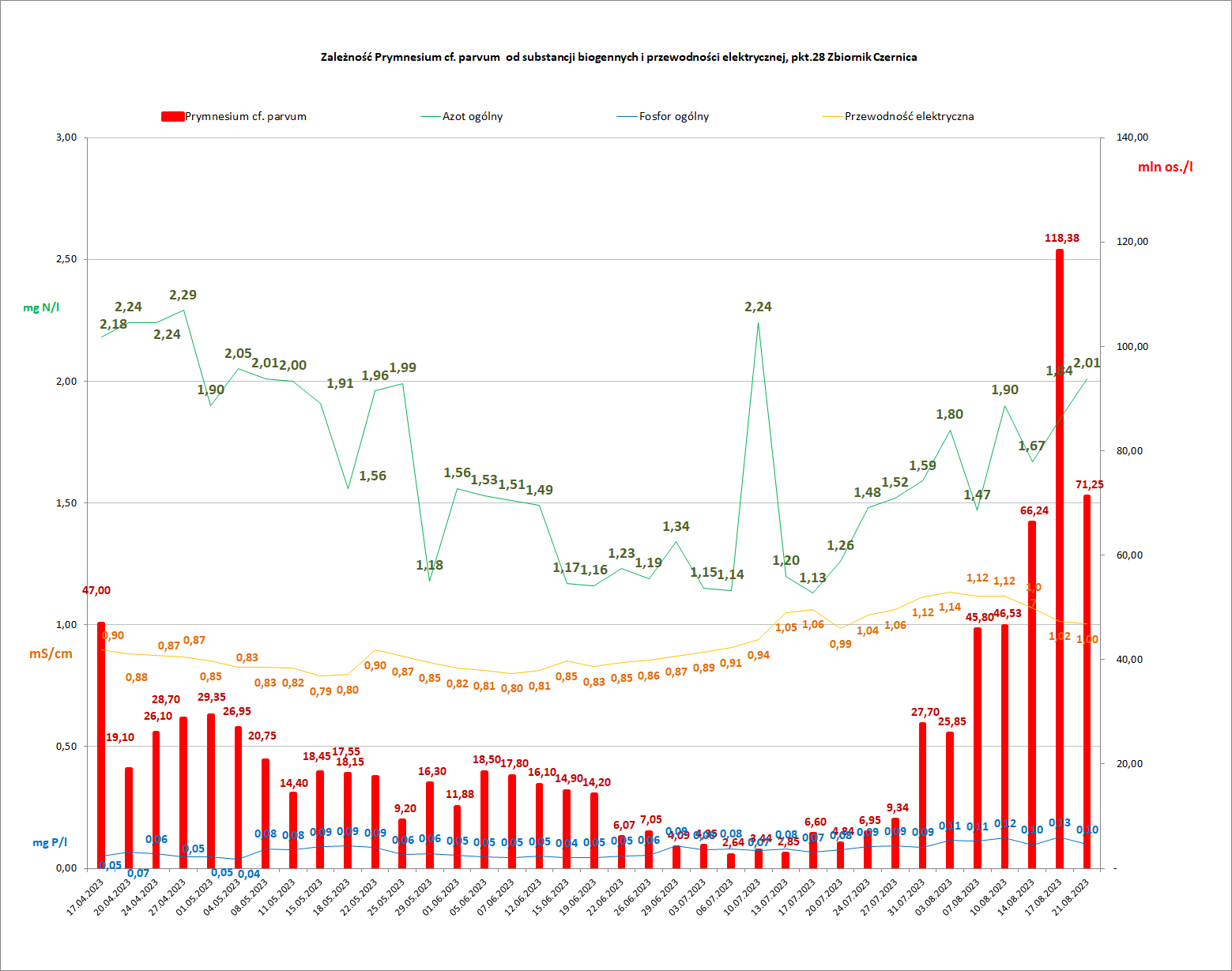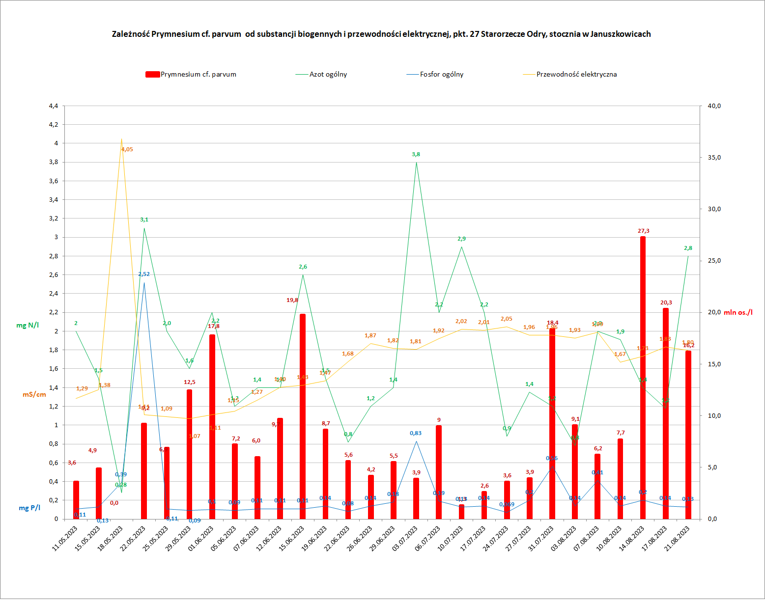 Prymnesium cf. parvum – liczebność złotej algi w milionach osobników na litr wody