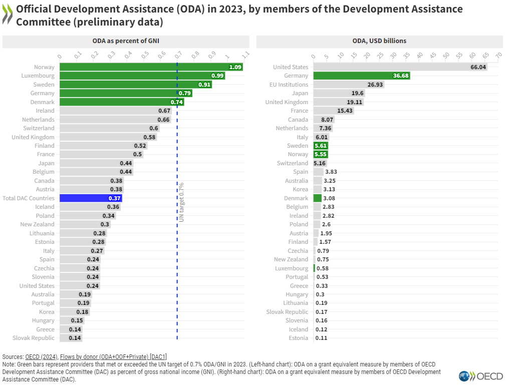 Tegoroczny wzrost oficjalnej pomocy rozwojowej (ODA) dostarczanej przez członków Komitetu Pomocy Rozwojowej (DAC) OECD wyniósł 1,8%, co stanowi zarazem piąty rok z rzędu, w którym ustanowiono rekordową wysokość ODA. Całkowita suma ODA w 2023 r. wzrosła o jedną trzecią w porównaniu z poziomami z 2019 r.