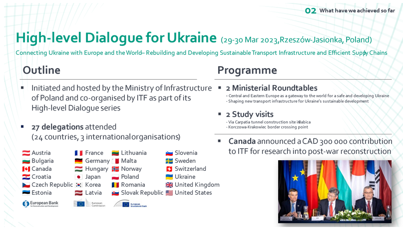 ITF organizuje cykliczne regionalne i tematyczne dialogi wysokiego szczebla. Przykładem takiej współpracy jest zorganizowany w Rzeszowie-Jasionce w marcu 2023 r. wspólnie z Ministerstwem Infrastruktury Polski pierwszy High-Level Dialogue on Ukraine pt. “Connecting Ukraine with Europe and the World: Rebuilding and Developing Sustainable Transport Infrastructure and Efficient Supply Chains”.
