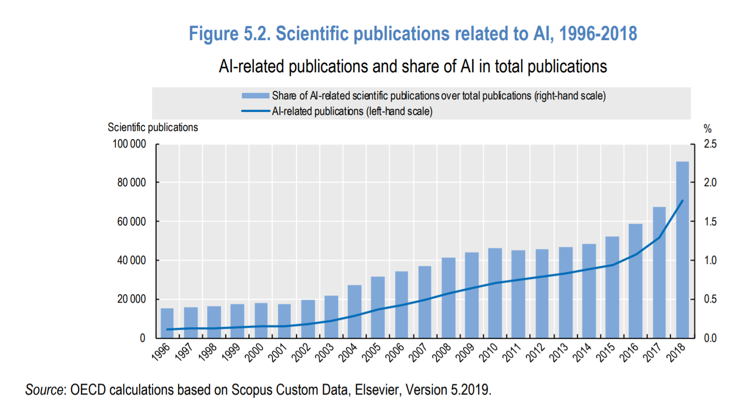 Wykres 5.2 przedstawia ewolucję publikacji naukowych w AI od 1996 r. Na początku 2000 r. liczba publikacji dot. AI znacznie przyspieszyła. Od 2015 r. liczba dokumentów związanych z AI ponownie znacząco wzrosła, średnio o 23% rocznie.