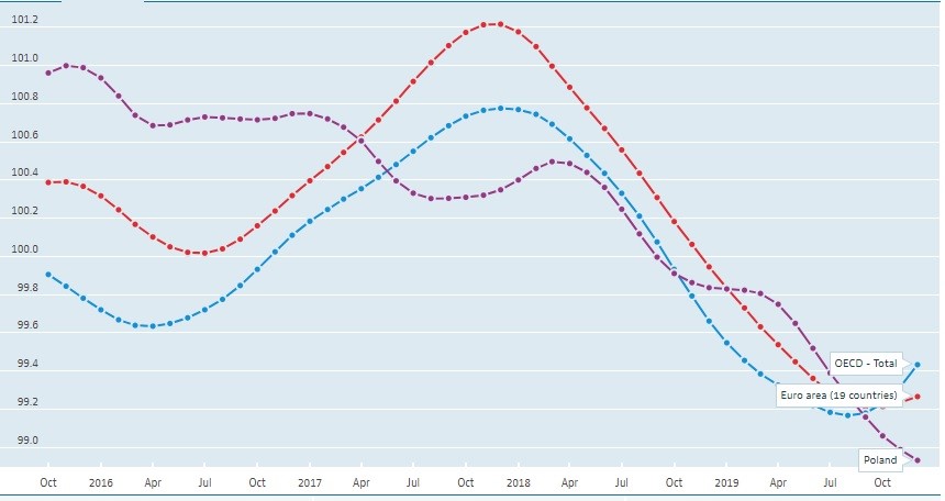Według ostatniego, styczniowego odczytu wskaźnik dla Polski spadł poniżej 99 i wynosi 98,9. Spada on od dłuższego czasu, co zwiastuje stopniowe wyhamowanie polskiego wzrostu. Presje płacowe ciągle się nasilają (szybko podnoszona jest pensja minimalna, odmrożone zostały wynagrodzenia