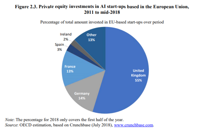 Raport wskazuje na techniczne i ekonomiczne, warunki efektywnego użytkowania AI, identyfikując przy tym główne kwestie polityk publicznych. Opracowanie przytacza przykład znaczącego wpływu AI na biznes, w tym działalność start-upów. Prywatne inwestycje kapitałowe w sztuczną inteligencję szybko rosną. W 2017 r. Unia Europejska odpowiadała za 8% globalnych inwestycji kapitałowych w AI, co stanowi istotny wzrost w porównaniu do 2013 roku, gdzie odnotowano jedyne 1% tego typu inwestycji. Jednak państwa członkowskie znacznie się różniły pod względem poziomu inwestycji (graf 2.3). Start-upy w Wielkiej Brytanii otrzymały 55% łącznej kwoty, następnie niemieckie (14%) i francuskie (13%).