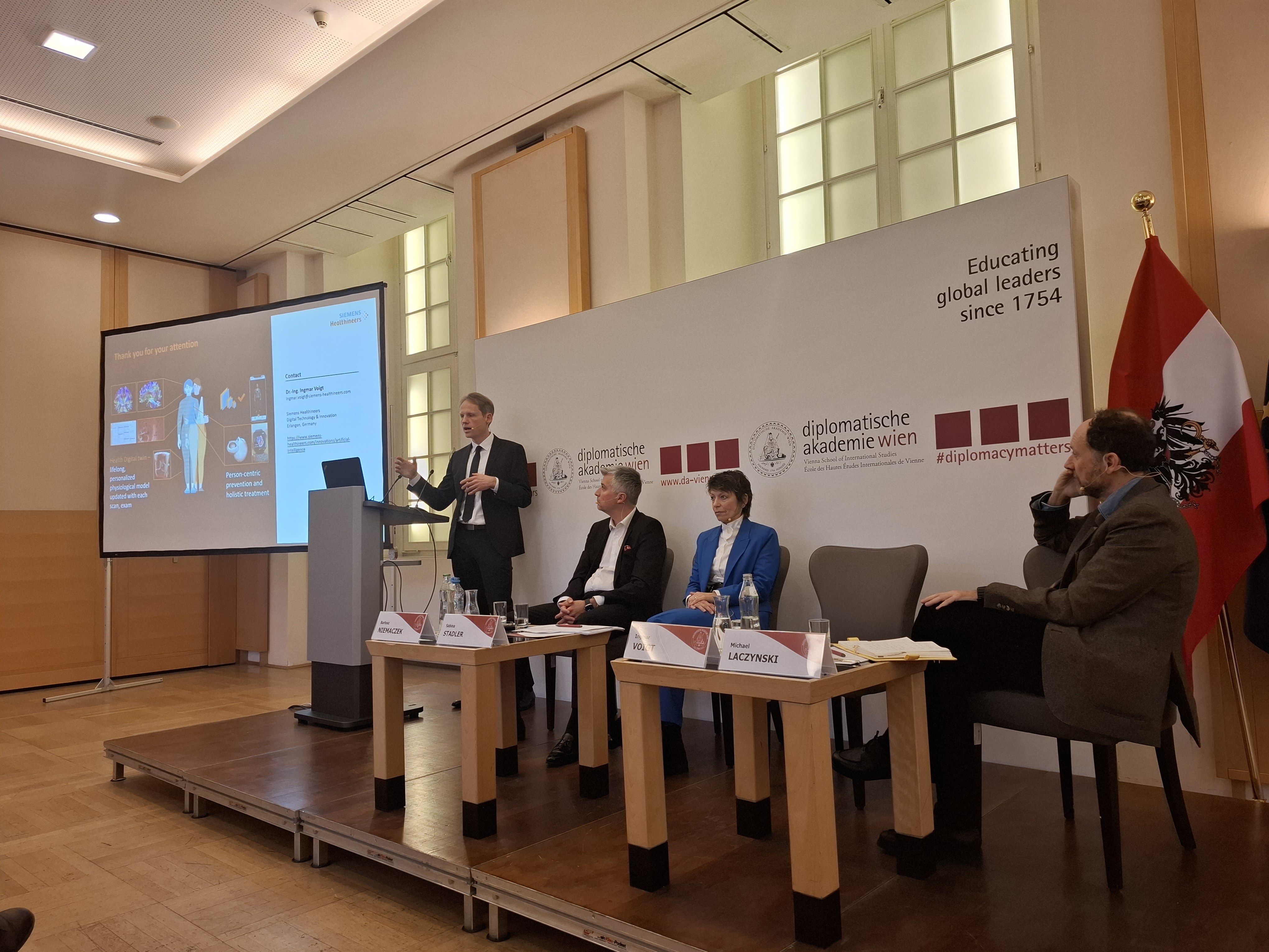 Die angeregten Diskussionen der Teilnehmer fanden großen Anklang beim Publikum, zu dem Vertreter des diplomatischen Korps, der Wissenschaft und Studierende der Diplomatischen Akademie Wien gehörten. Zu den besprochenen Themen gehörten unter anderem folgende: Fragen der Wettbewerbsfähigkeit der EU im Bereich der KI-Entwicklung im Vergleich zu asiatischen Ländern und den USA sowie die möglichen Auswirkungen der künstlichen Intelligenz auf den Arbeitsmarkt.