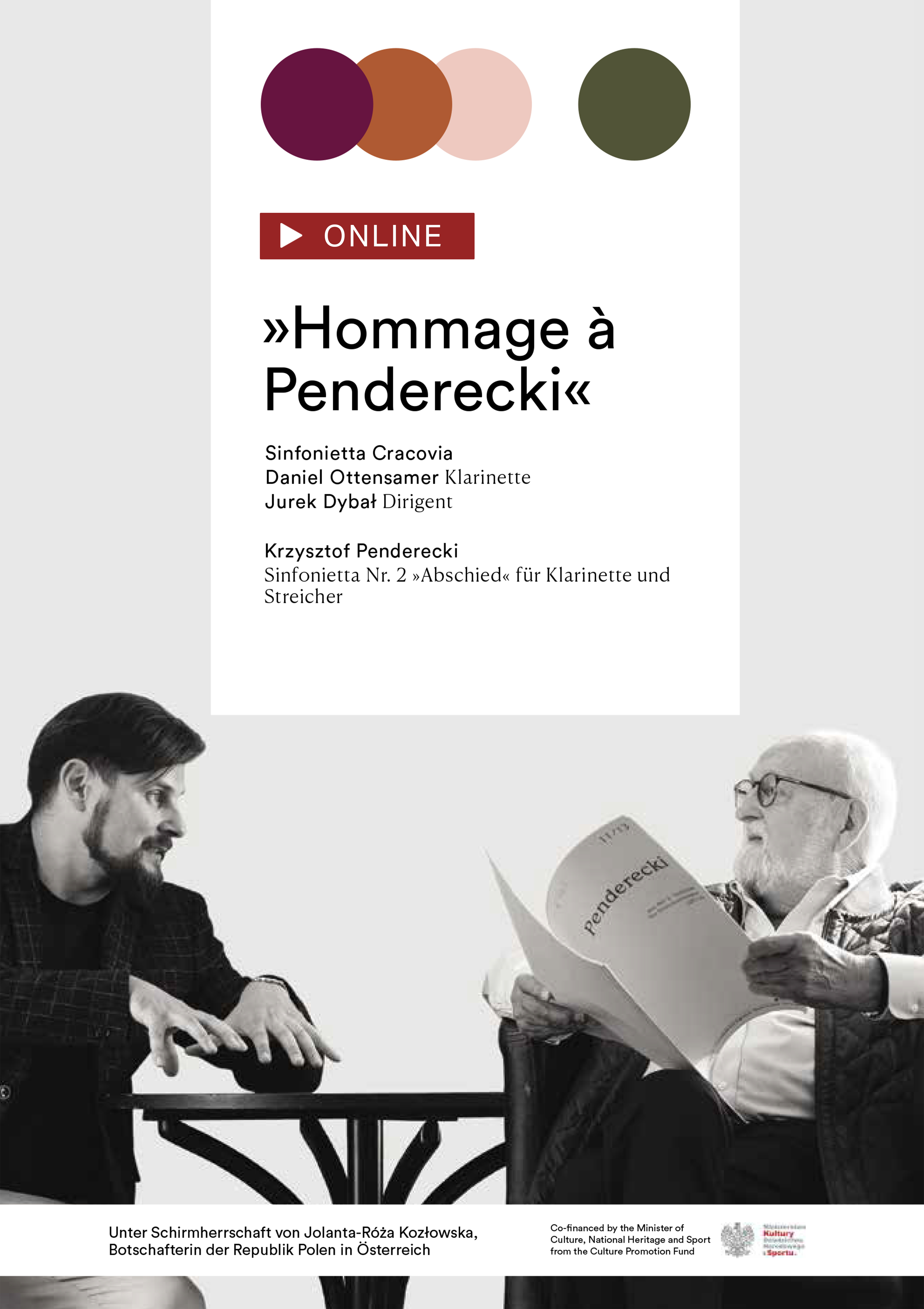 Wir laden Sie herzlich ein, die symbolische Online-Version des Konzertes „Hommage á Penderecki“ anzuschauen, das ursprünglich für den 06.12. 21 im Wiener Konzerthaus geplant war und aufgrund des Lockdowns nicht stattfinden konnte. Die Veranstaltung mit dem Solisten Daniel Ottensamer und der Sinfonietta Cracovia unter der Leitung von Jurek Dybał steht unter der ehrenamtlichen Schirmherrschaft von Jolanta Róża Kozłowska, Botschafterin der Republik Polen in Österreich. Kofinanziert wird dieses Konzert vom polnischen Ministerium für Kultur, nationales Erbe und Sport, als auch von der Stadt Krakau.