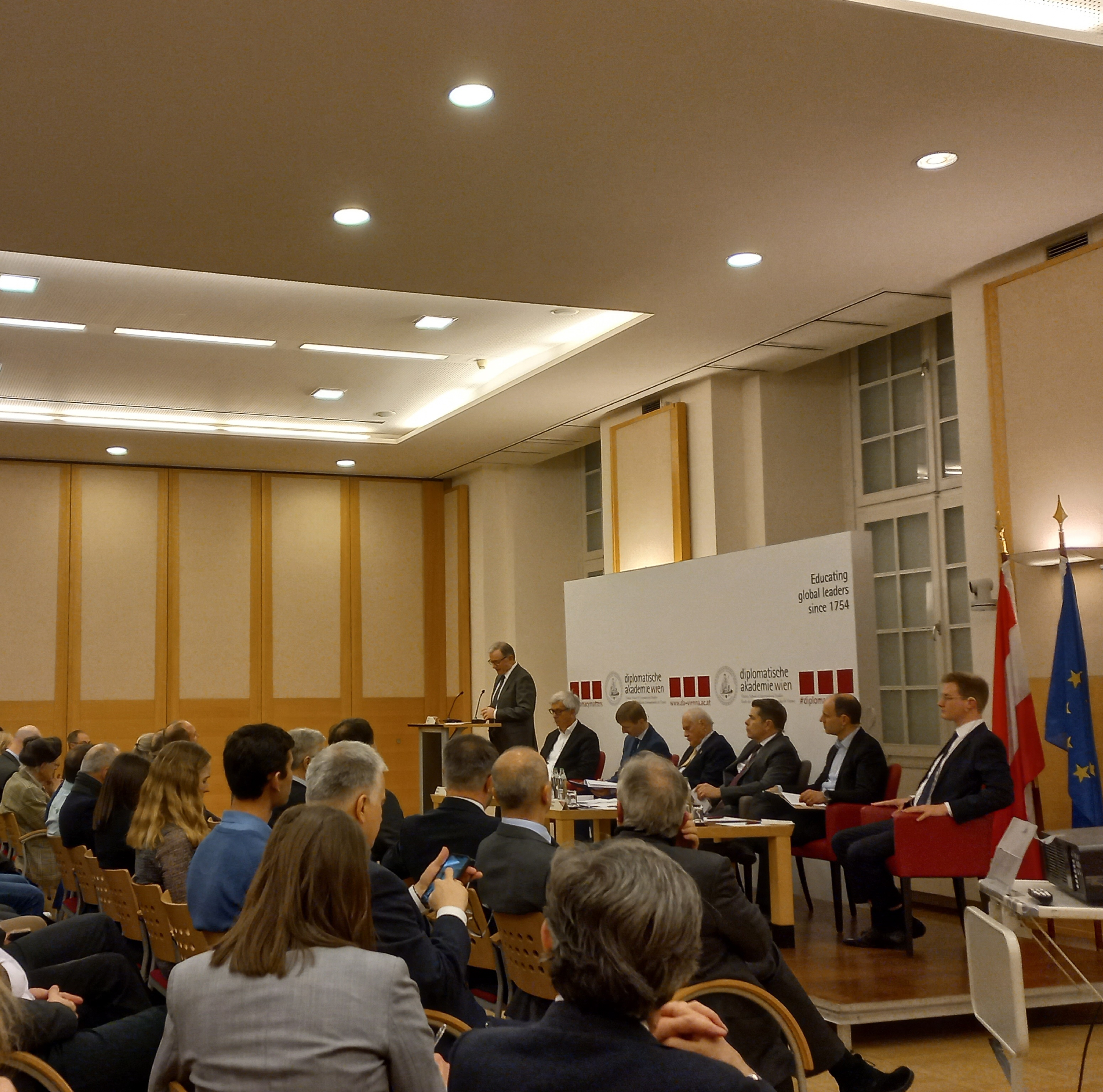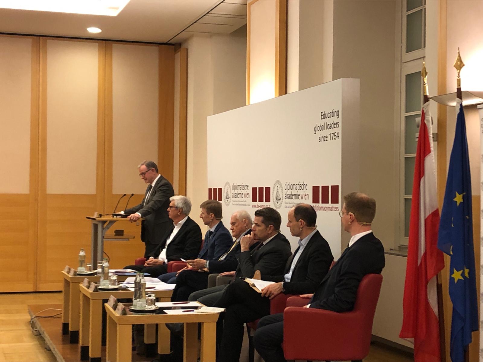 Am 27. Februar fand in der Diplomatischen Akademie in Wien das Seminar „Energy (In)Security in Central Europe?" statt, welches sich der Energiesituation in den Ländern der Region nach dem zweijährigen Angriffskrieg Russlands gegen die Ukraine widmete. Im Rahmen der Podiumsdiskussion wurden die Perspektiven Polens, Österreichs, Deutschlands, der Tschechischen Republik und Sloweniens im Zusammenhang mit der geopolitischen Lage und den Herausforderungen bezgl. der Veränderungen im Energiemix der jeweiligen Länder vorgestellt. Die Republik Polen wurde im Panel von Hrn. Jakub Gibek, Direktor der Abteilung für internationale Angelegenheiten im Ministerium für Klima und Umwelt, vertreten. Die Veranstaltung wurde in Zusammenarbeit mit der polnischen Botschaft in Wien organisiert und vom Außenministerium der Republik Polen kofinanziert.