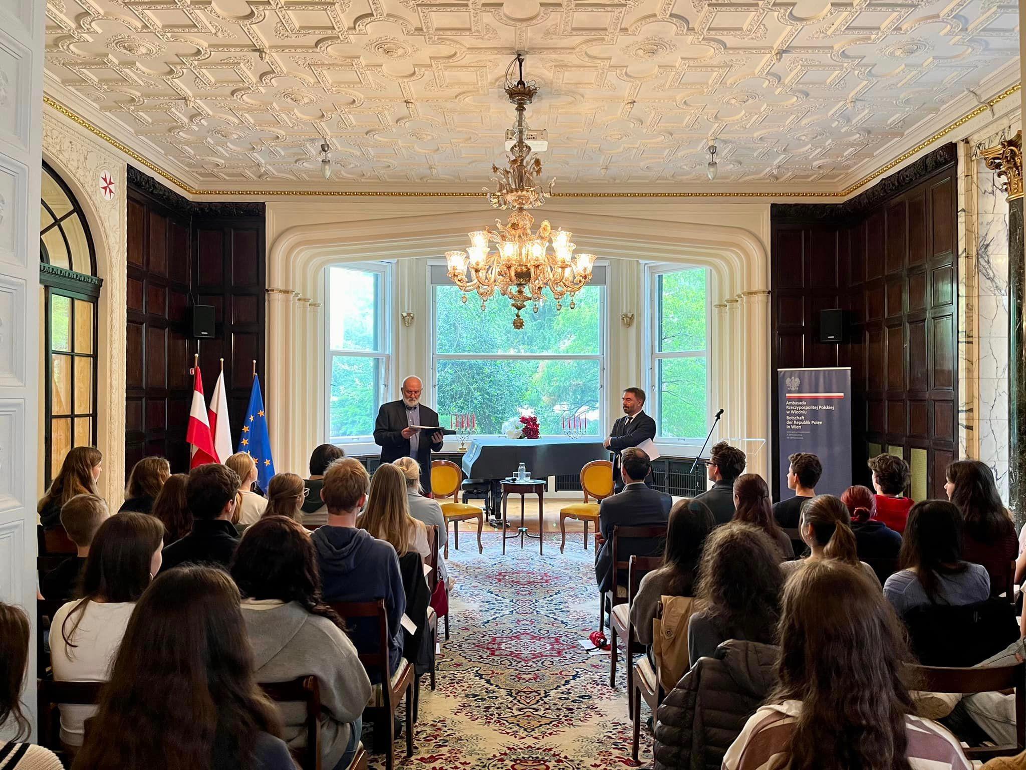 Am 4.06. lud Minister Janusz Styczek zwei Klassen von wahlberechtigten Schülern des Bundesgymnasiums Fichtnergasse in die Botschaft ein. Das Treffen fand im Zusammenhang mit den bevorstehenden Wahlen zum Europäischen Parlament statt und hatte zum Ziel, sowohl die österreichische Jugend zur Wahl zu ermutigen als auch die polnische Perspektive auf die europäische Politik zu präsentieren. Der Minister sprach kurz über die Funktionsweise der polnischen diplomatischen Vertretungen in AT, d.h. über die wichtigsten Aufgaben der Botschaft, einschließlich der Konsularabteilung, und der Ständigen Vertretungen bei internationalen Organisationen. J. Styczek betonte die Rolle, die die Mitgliedschaft Polens in der EU und die gegenseitigen Beziehungen zwischen Polen und der EU spielen. Er wies auf die bedeutende Entwicklung hin, die PL seit dem EU-Beitritt auf vielen Ebenen genommen hat, vor allem auf wirtschaftlicher, aber auch auf sozialer und psychologischer Ebene. Er sprach über die Beziehungen zwischen PL und AT - welchen Einfluss österreichische Unternehmen auf die Entwicklung der polnischen Wirtschaft haben und welche Rolle polnische Arbeitnehmer auf dem österreichischen Markt spielen. Der Minister sprach auch über die Vor- und Nachteile der EU-Erweiterung und die Debatte über die EU-Reform.