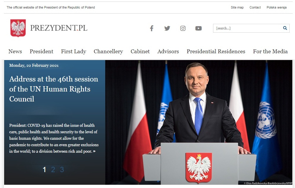 Segment Wysokiego Szczebla rozpoczyna 46. sesję Rady Praw Człowieka, która ma miejsce w dniach 22 lutego - 23 marca w Pałacu Narodów w Genewie. Ze względu na ograniczenia związane z pandemią COVID-19, sesja odbędzie się głównie w formie wirtualnej. W nagranym wcześniej wystąpieniu Prezydent RP p. Andrzej Duda mówił m.in. o konsekwencjach pandemii dla praw człowieka na świecie, sytuacji na Białorusi, ostatnich wydarzeniach w Rosji oraz prawach człowieka na okupowanych terenach Ukrainy.