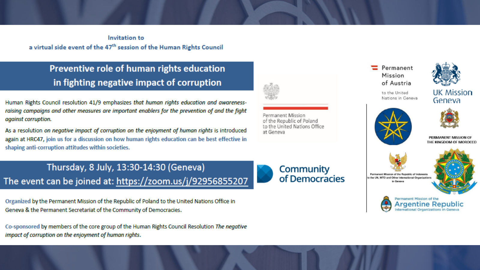 Podczas trwania sesji Polska zorganizowała dwa wirtualne wydarzenia. Pierwsze z nich pt „Silenced rights, persecuted freedoms in Russia” dotyczyło ograniczania podstawowych wolności i praw społeczeństwa obywatelskiego w Rosji. Inicjatywa ta stanowiła kontynuację działań podjętych przez Polskę podczas wcześniejszej sesji RPCz, kiedy to Polska wygłosiła w imieniu 45 państw oświadczenie dot. pogarszającej się sytuacji praw człowieka w Rosji w kontekście aresztowania A. Nawalnego. Kolejne wydarzenie towarzyszące zatytułowane „Preventive Role of Human Rights Education in Fighting Negative Impact of Corruption”, zorganizowane zostało z inicjatywy Polski we współpracy ze Wspólnotą Demokracji, przy wsparciu państw-inicjatorów rezolucji dotyczącej negatywnego wpływu korupcji na korzystanie z praw człowieka (do grupy tej należy również Polska).