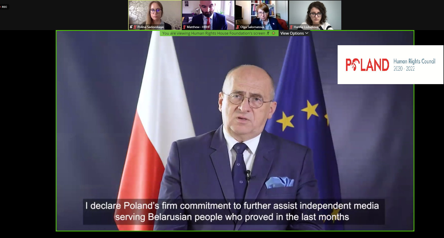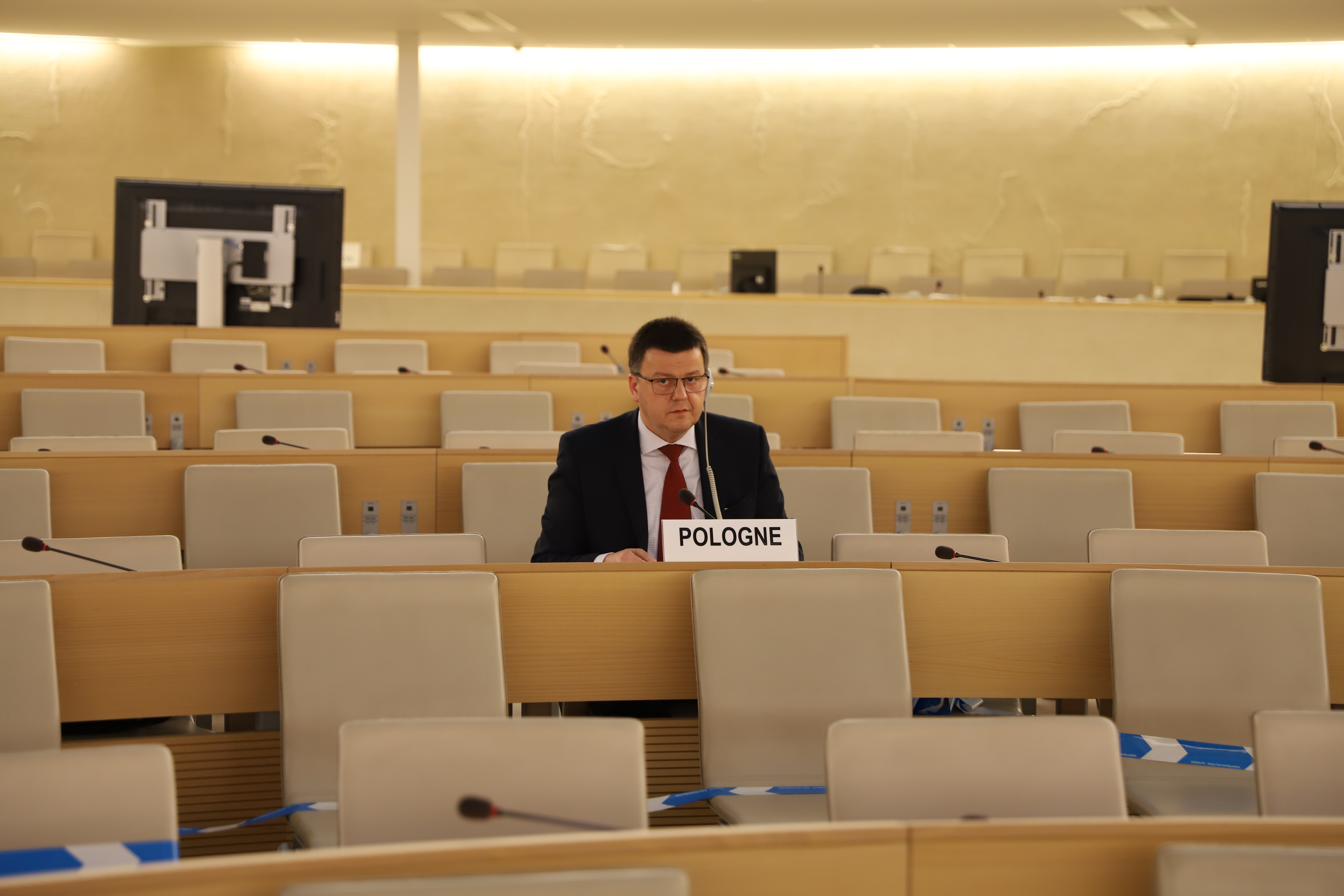 Podczas interaktywnego dialogu ze Specjalną Sprawozdawczynią ds. sytuacji praw człowieka na Białorusi, p. Anaïs Marin, Polska wygłosiła w imieniu 46 państw (w tym wszystkich państw członkowskich UE) oświadczenie potępiające przymusowe lądowanie pasażerskiego samolotu w Mińsku w dniu 23 maja br. oraz wezwała władze Białorusi do natychmiastowego uwolnienia p. Ramana Pratasewicza, jego partnerki oraz wszystkich niesprawiedliwie przetrzymywanych, w tym więźniów politycznych.