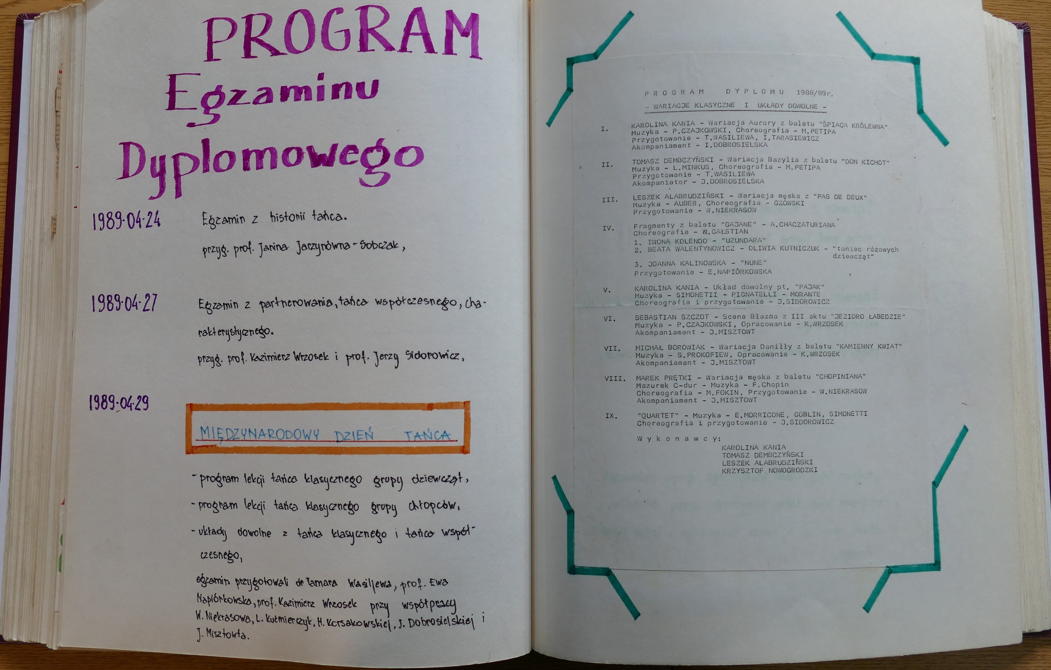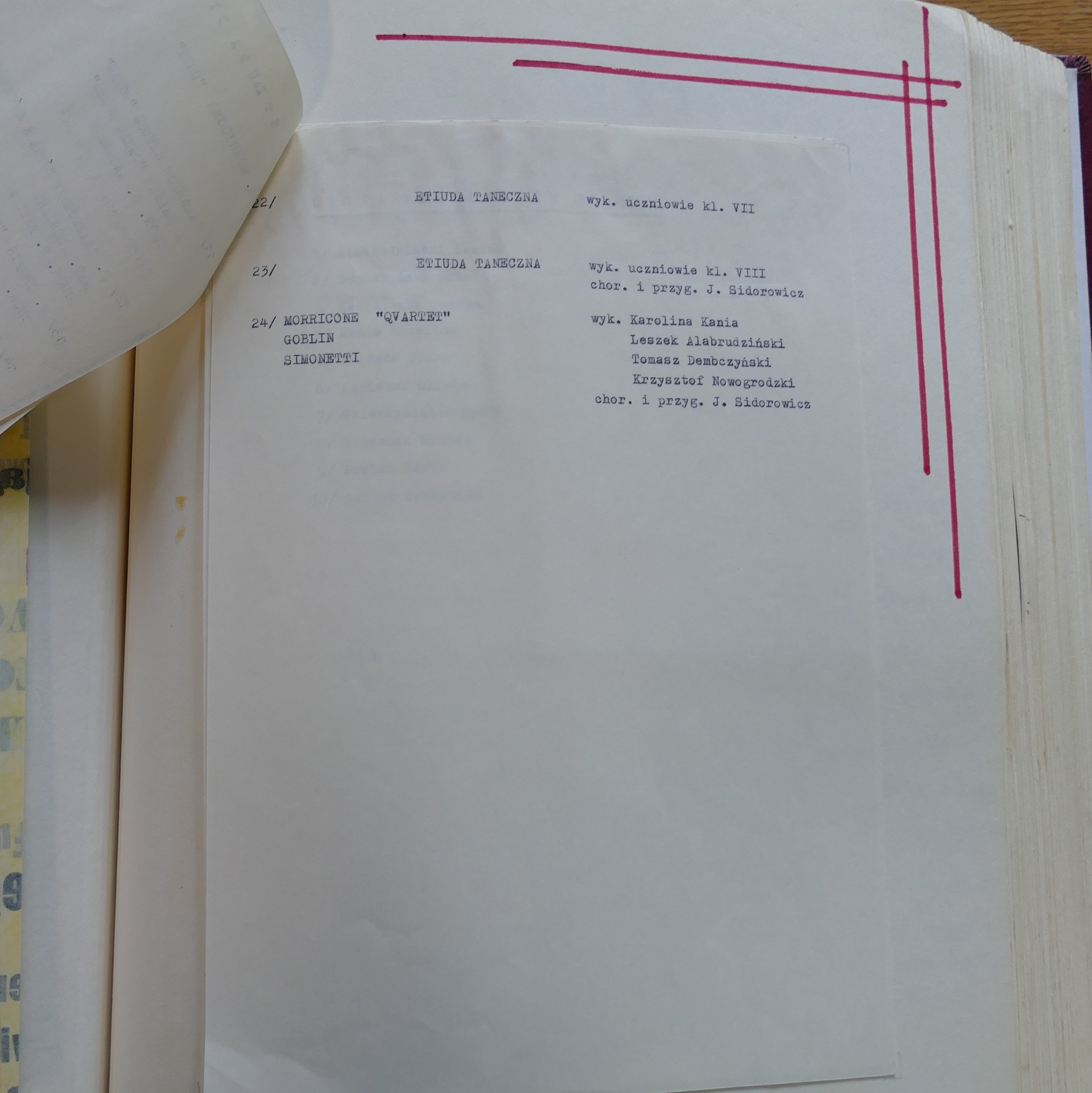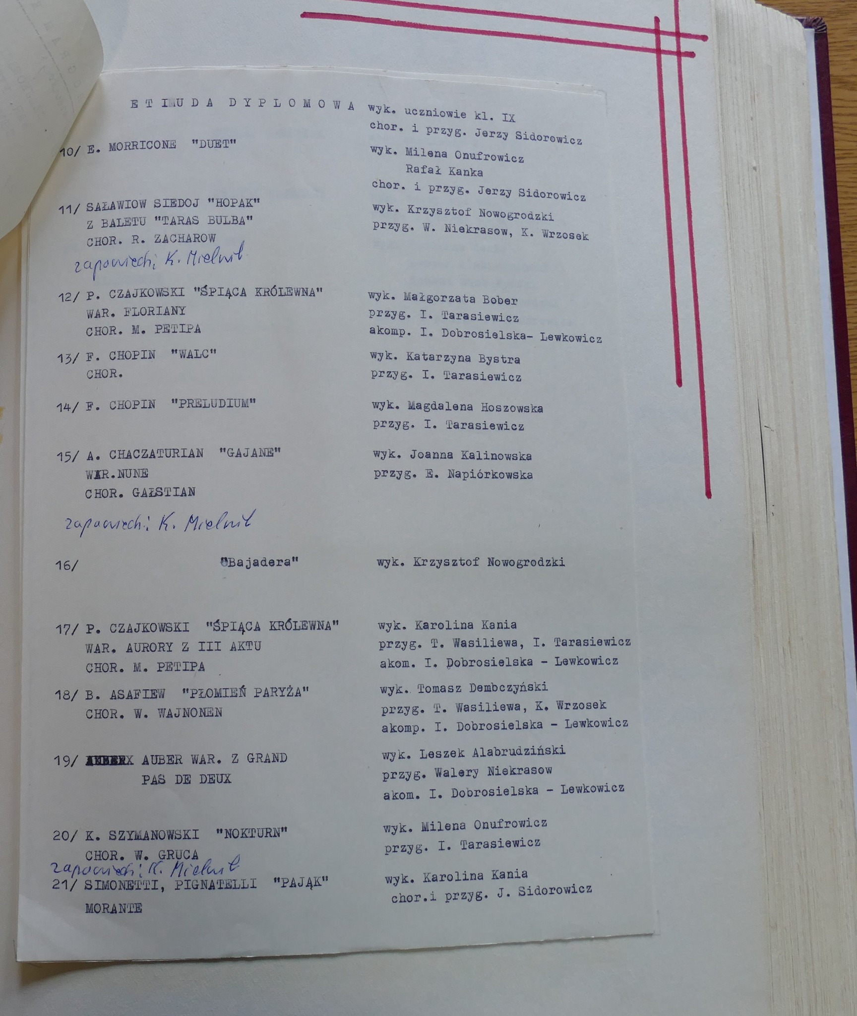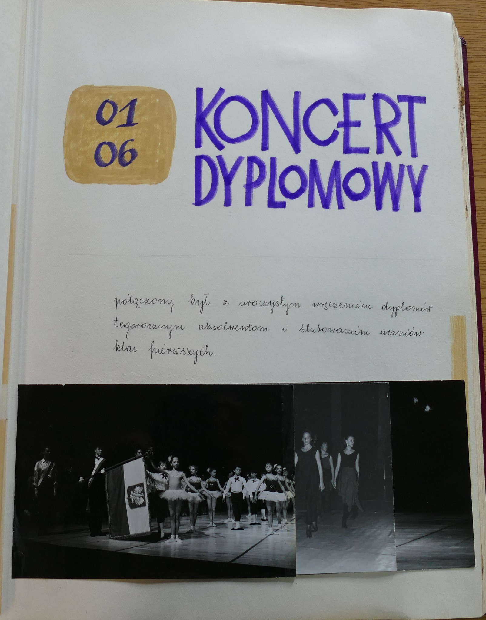W galerii zamieszczamy zdjęcia kroniki szkolnej. Zachowały się w niej scenariusze Koncertów Dyplomowych z odręcznymi notatkami dla prowadzącego. Możemy zobaczyć i przeczytać szczegółowy repertuar nie tylko klasy dziewiątej ale także młodszych kolegów dyplomantów.