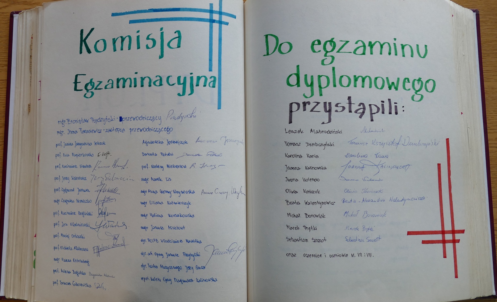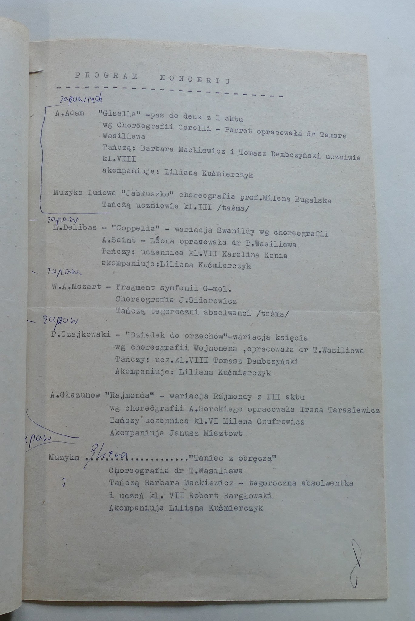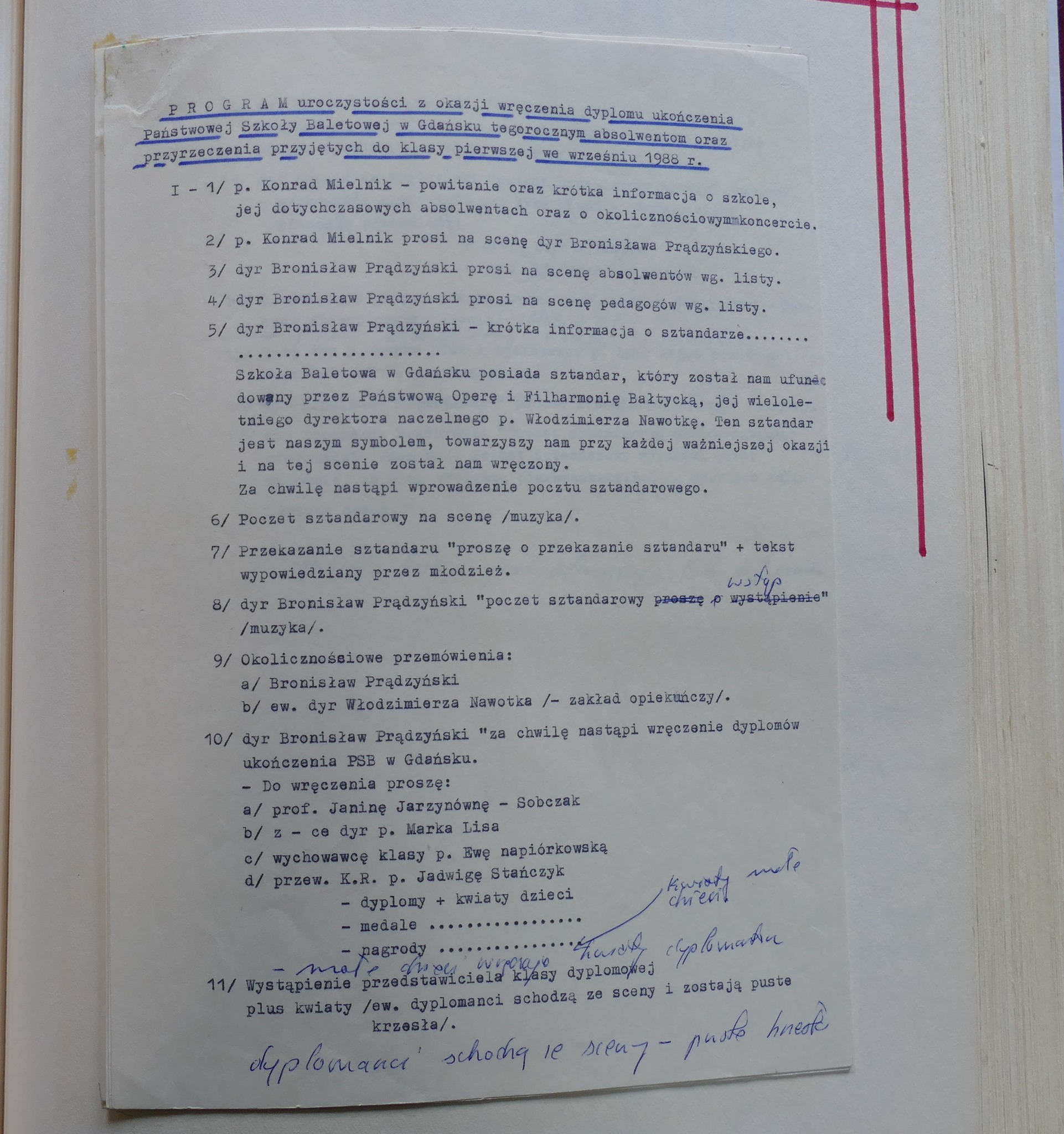 W galerii zamieszczamy zdjęcia kroniki szkolnej. Zachowały się w niej scenariusze Koncertów Dyplomowych z odręcznymi notatkami dla prowadzącego. Możemy zobaczyć i przeczytać szczegółowy repertuar nie tylko klasy dziewiątej ale także młodszych kolegów dyplomantów.