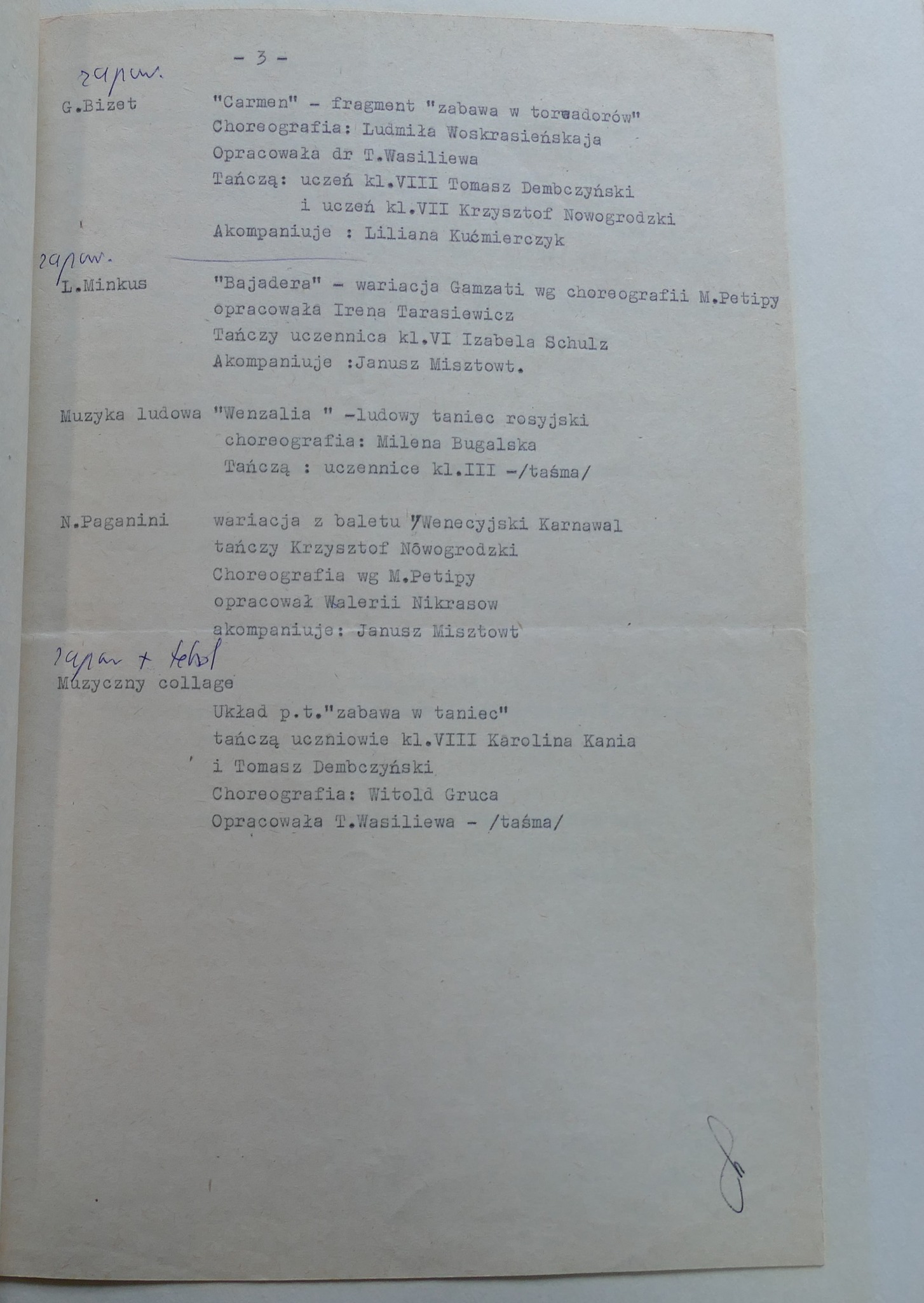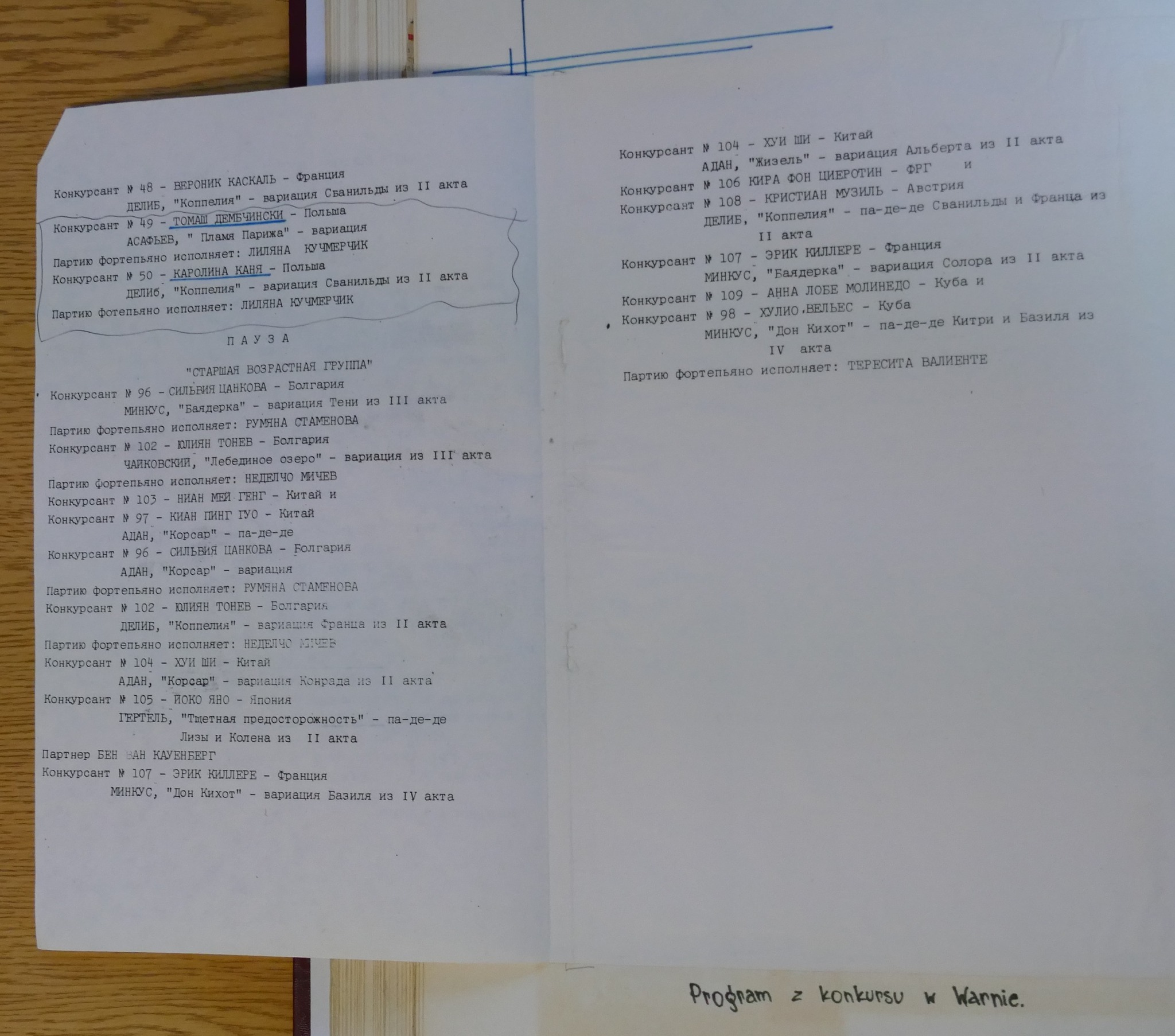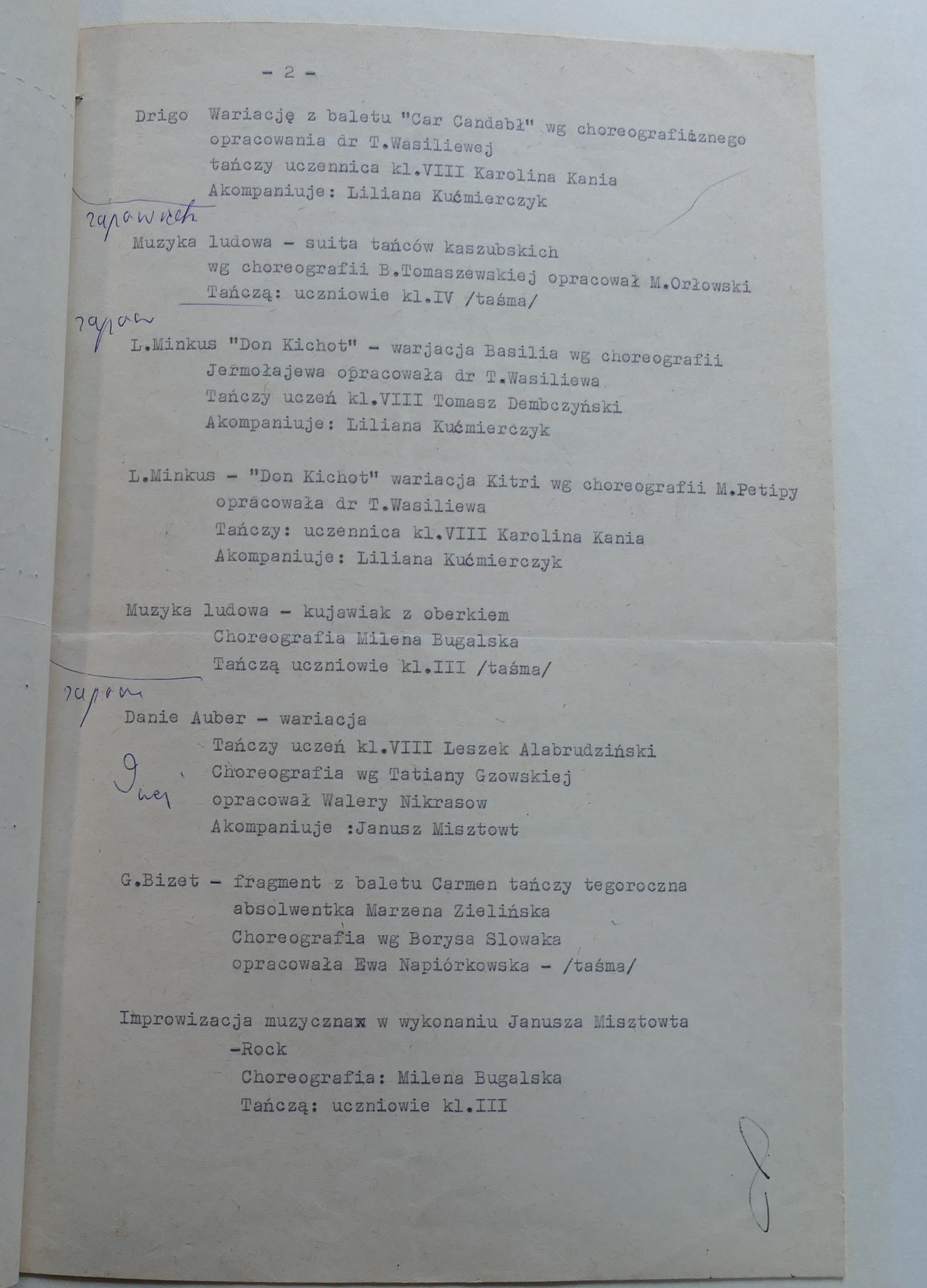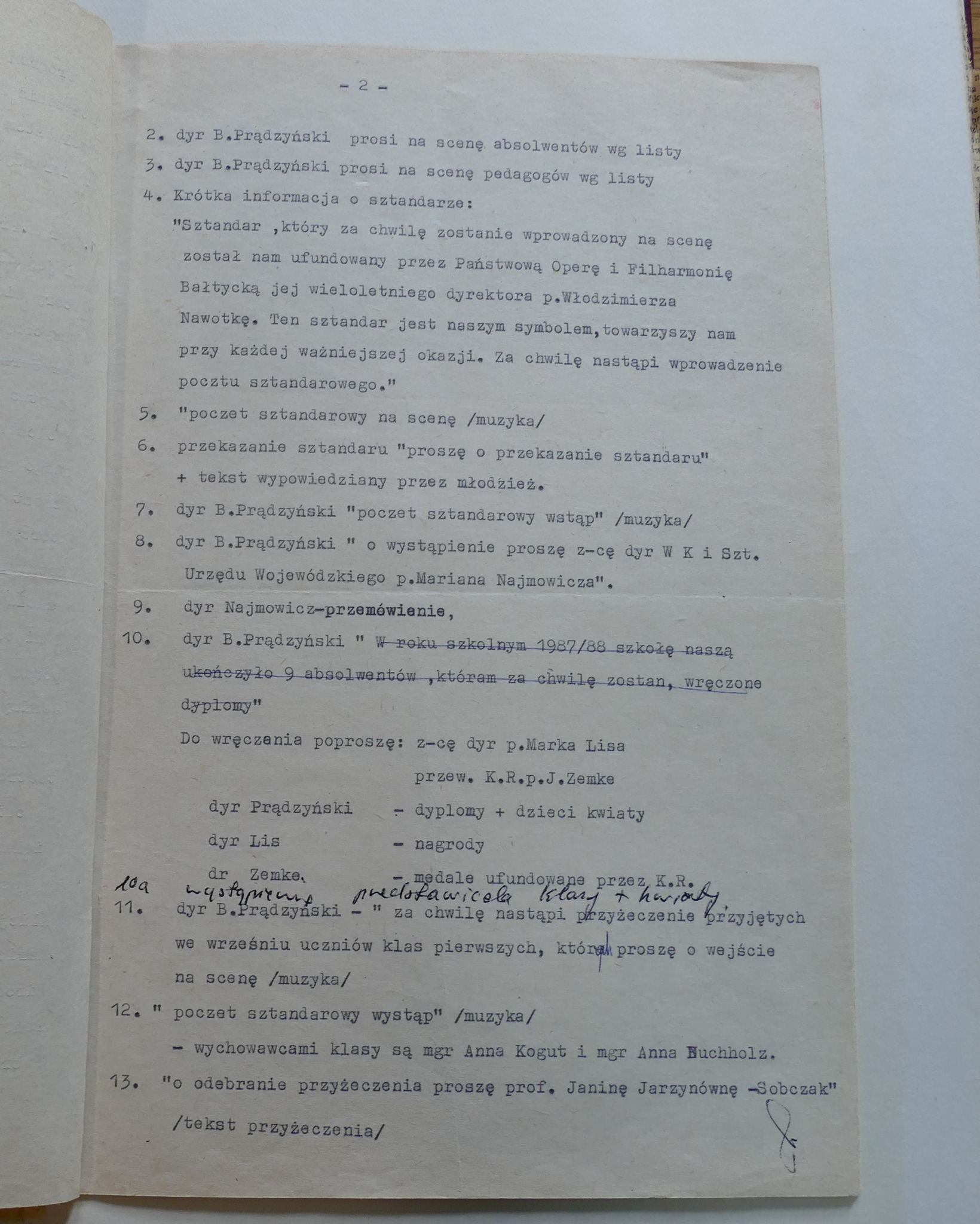 W galerii zamieszczamy zdjęcia kroniki szkolnej. Zachowały się w niej scenariusze Koncertów Dyplomowych z odręcznymi notatkami dla prowadzącego. Możemy zobaczyć i przeczytać szczegółowy repertuar nie tylko klasy dziewiątej ale także młodszych kolegów dyplomantów.