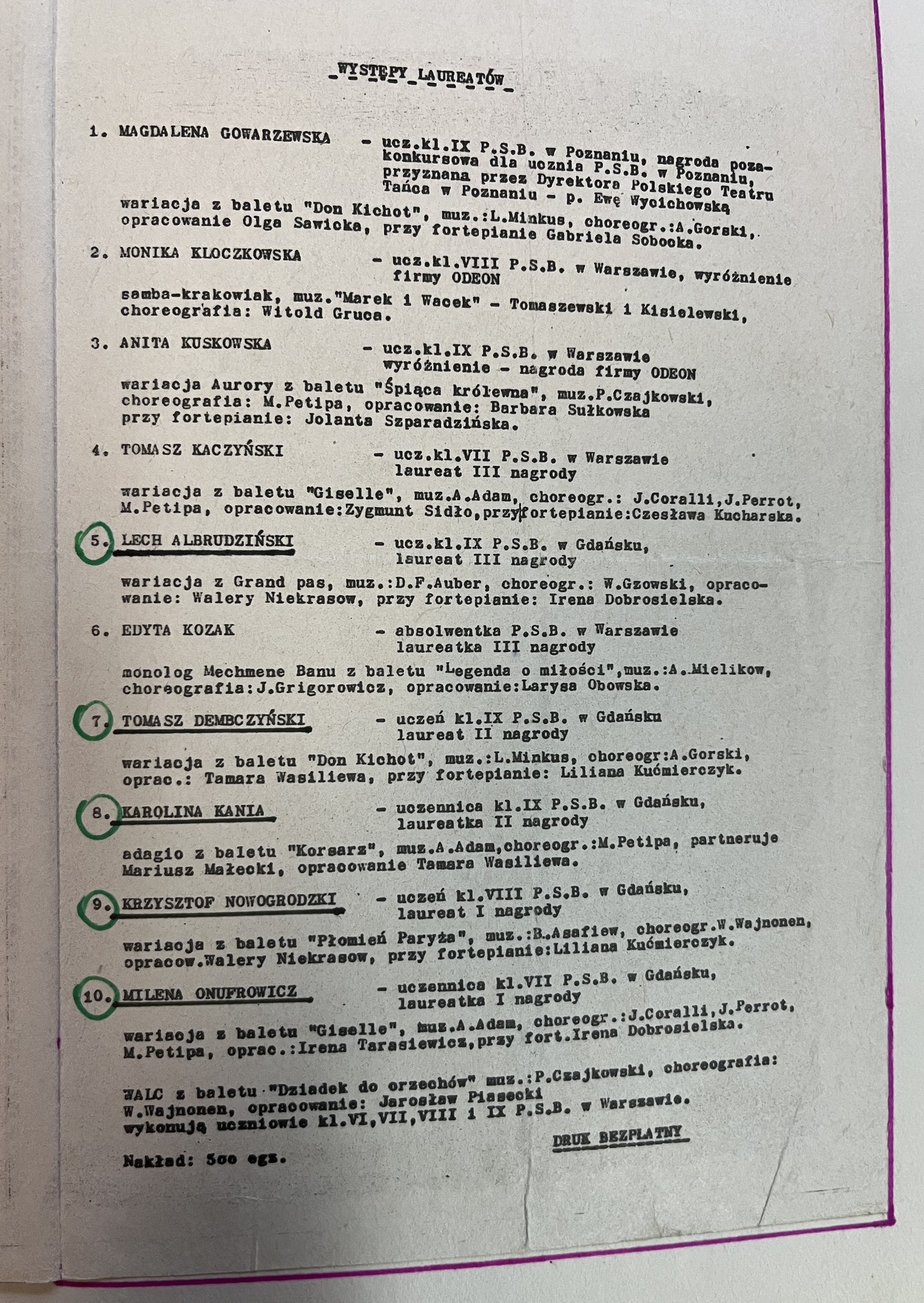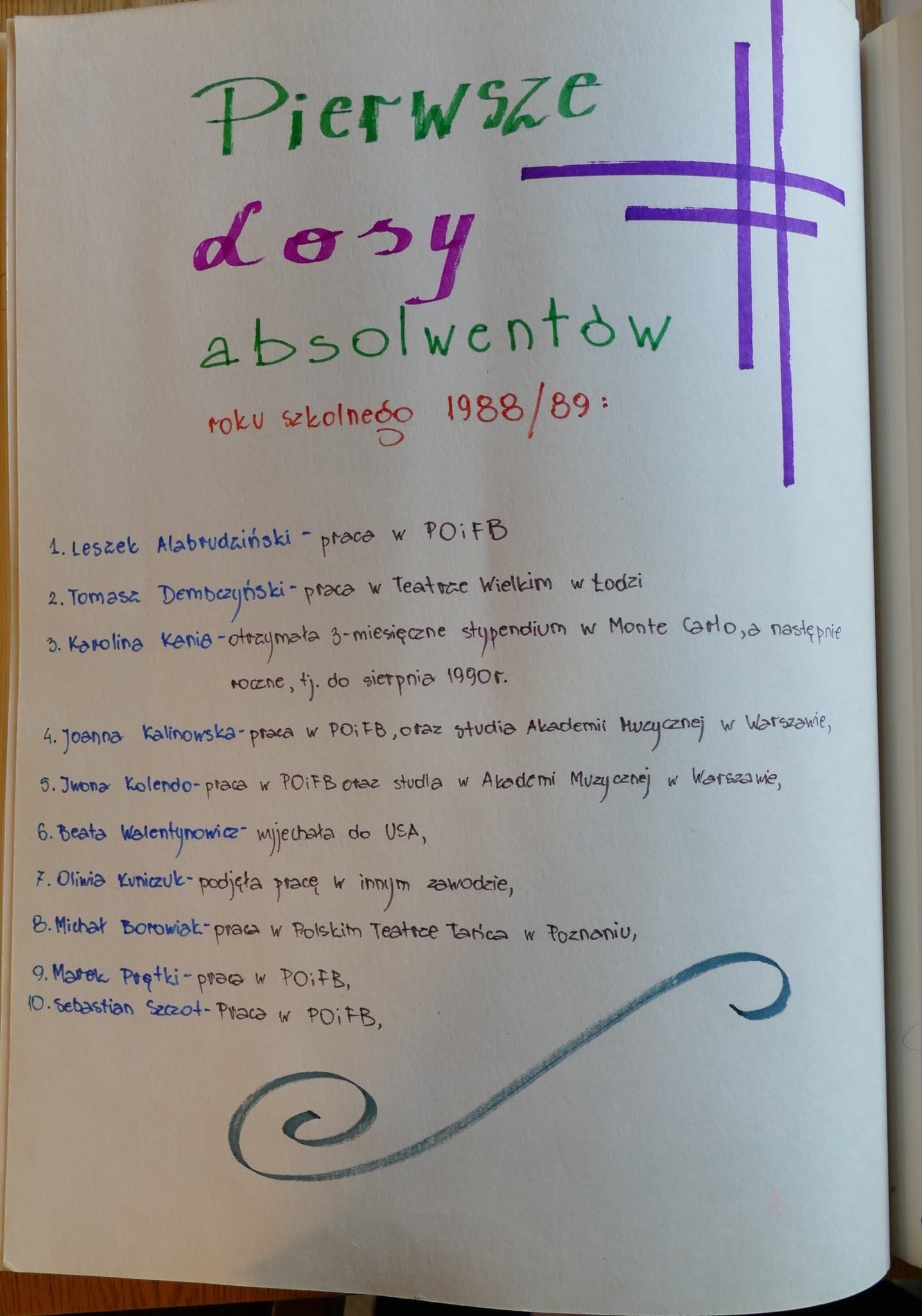 1989: Leszek Alabrudziński, Michał Borowiak, Tomasz Dembczyński, Joanna Kalinowska, Karolina Kania, Iwona Kolendo, Oliwia Kuniczuk, Marek Prętki, Beata Walentynowicz, Sebastian Szczot.