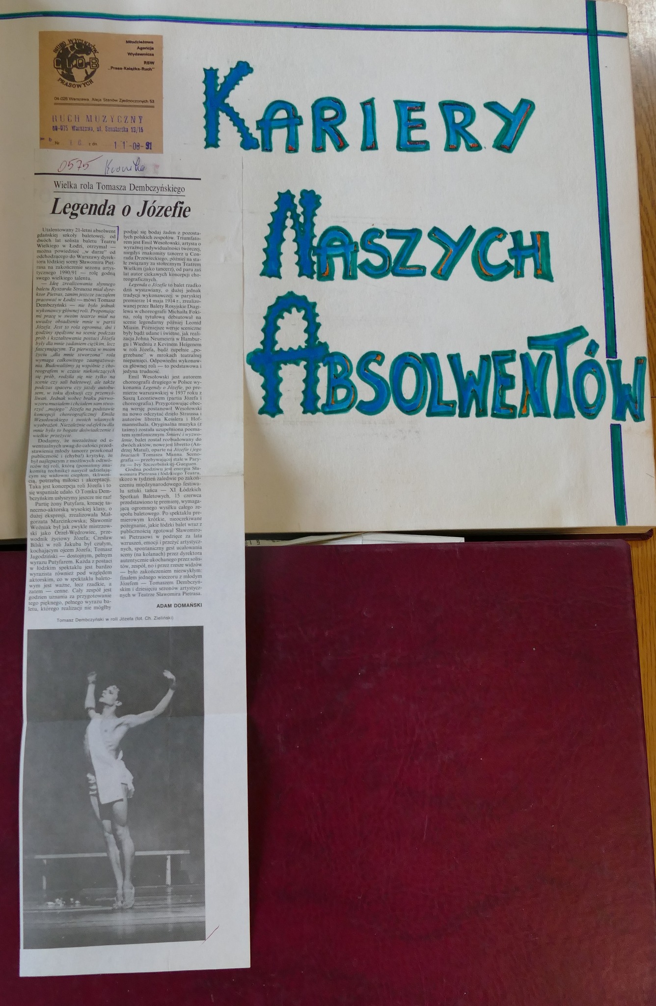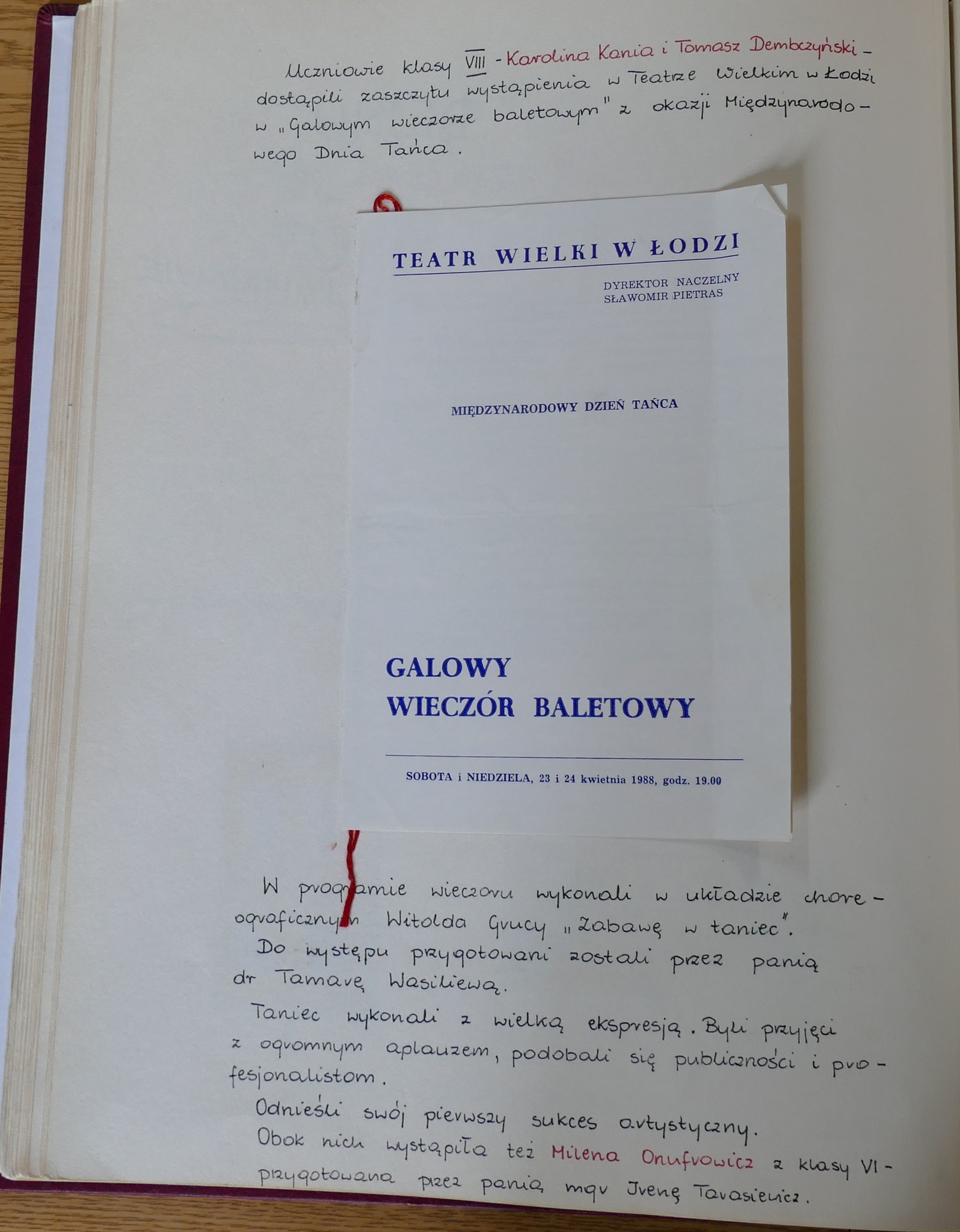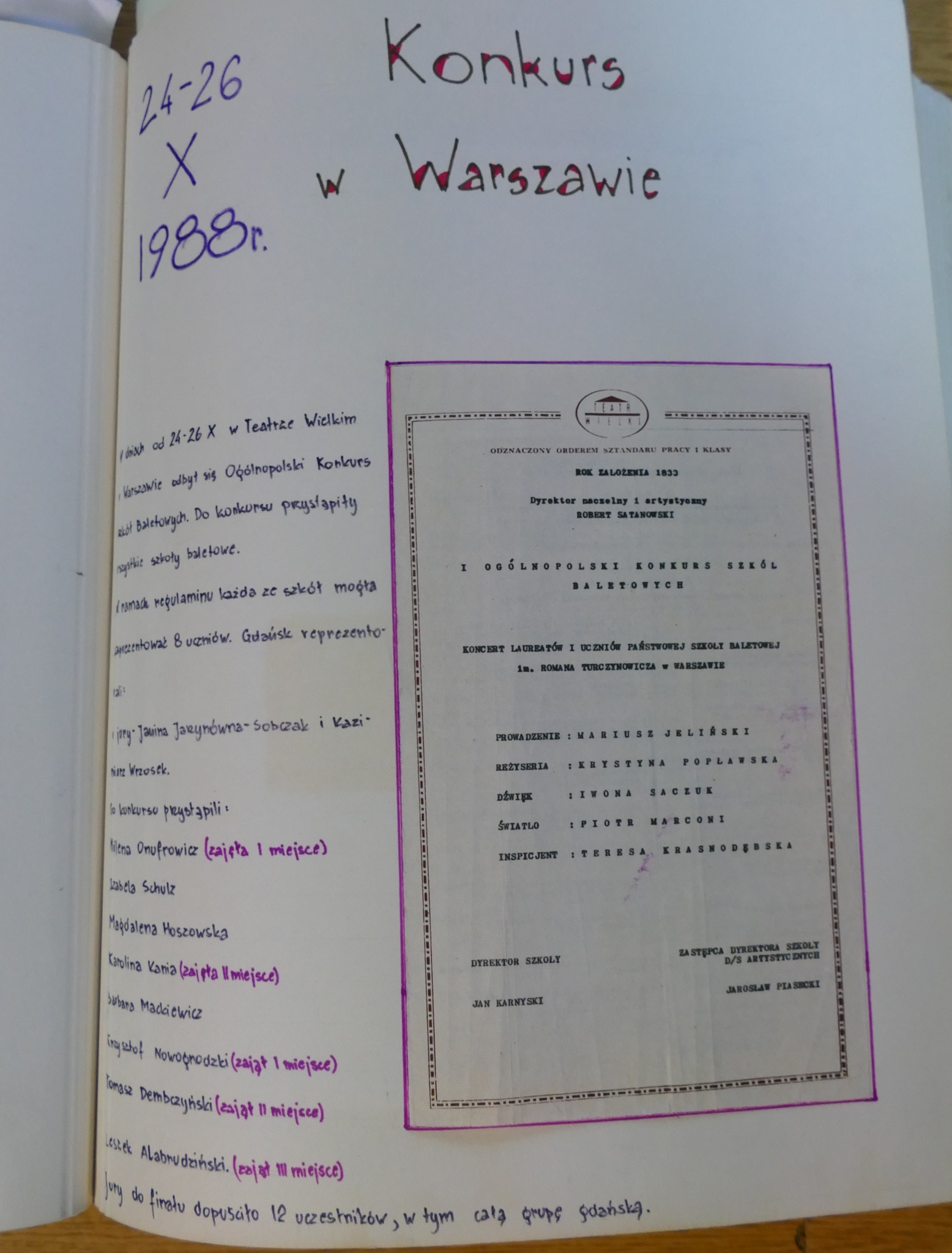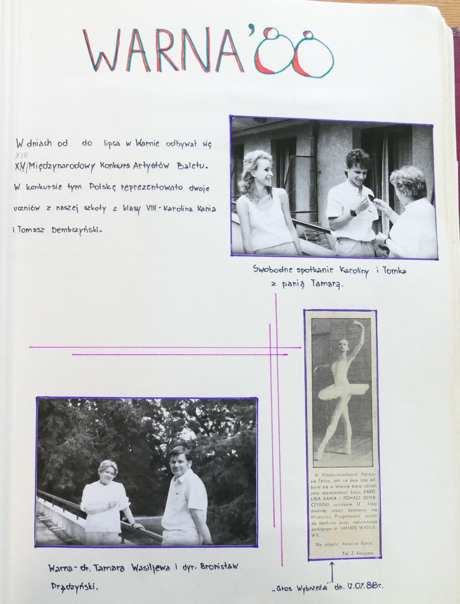 Z pewnością ten czas był intensywny dla absolwentów z wymienionych roczników i ich troszkę młodszych koleżanek i kolegów. Jak czytamy w wycinkach prasowych i w kronice - od lata 1988 roku do lata 1989 gdańska młodzież brała udział w ogólnopolskim i dwóch międzynarodowych konkursach baletowych. Do Warny Dyrektor Prądzyński wysłał Karolinę Kanię i Tomasza Dembczyńkiego. W Moskwie towarzyszyli Im również Milena Onufrowicz i Krzysztof Nowogrodzki - o nich szerzej pisać będziemy w kolejnym poście. Podczas VI Ogólnopolskiego Konkursu Szkół Baletowych, który odbył się jesienią 1988 roku II nagrodę wytańczyli: Karolina Kania, Tomasz Dembczyński a III: Leszek Alabrudziński.