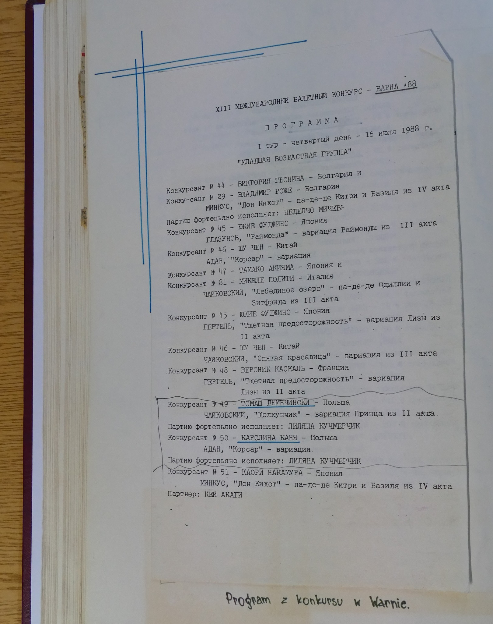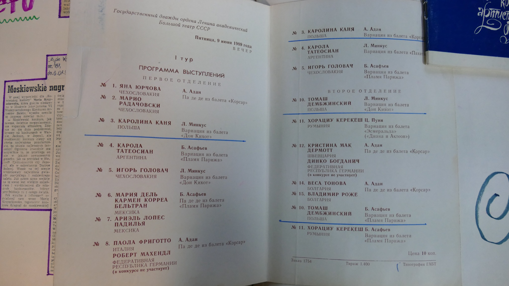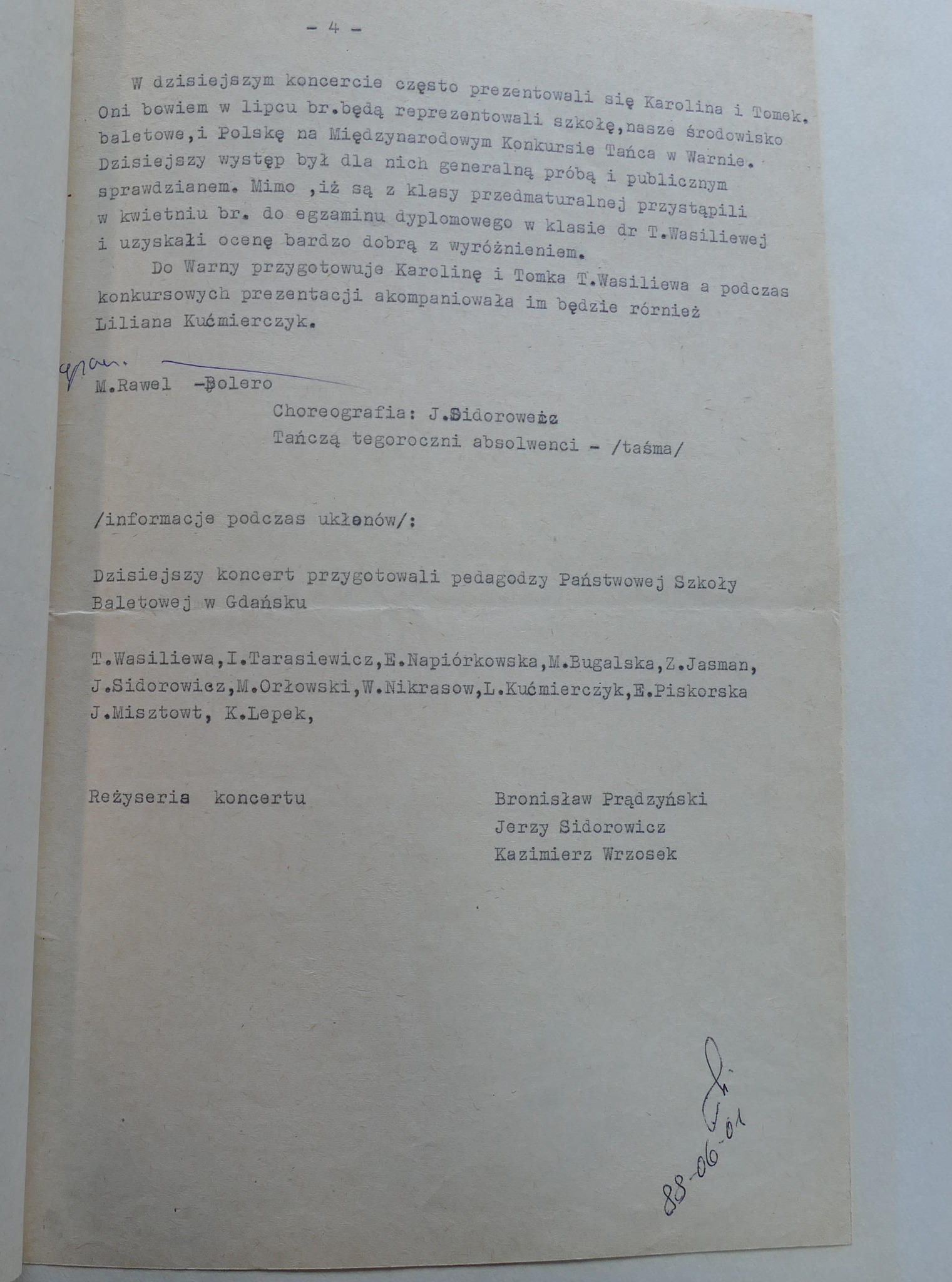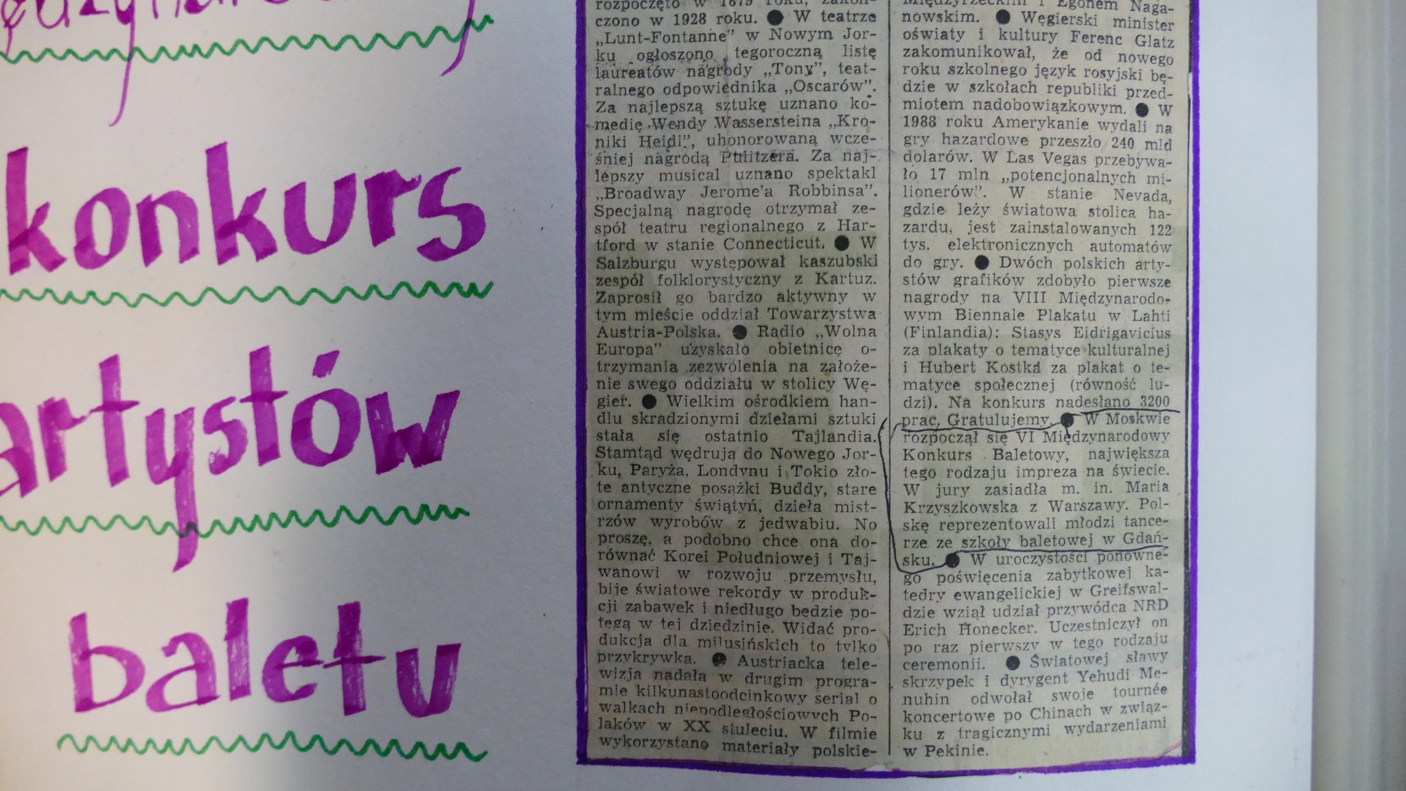 Z pewnością ten czas był intensywny dla absolwentów z wymienionych roczników i ich troszkę młodszych koleżanek i kolegów. Jak czytamy w wycinkach prasowych i w kronice - od lata 1988 roku do lata 1989 gdańska młodzież brała udział w ogólnopolskim i dwóch międzynarodowych konkursach baletowych. Do Warny Dyrektor Prądzyński wysłał Karolinę Kanię i Tomasza Dembczyńkiego. W Moskwie towarzyszyli Im również Milena Onufrowicz i Krzysztof Nowogrodzki - o nich szerzej pisać będziemy w kolejnym poście. Podczas VI Ogólnopolskiego Konkursu Szkół Baletowych, który odbył się jesienią 1988 roku II nagrodę wytańczyli: Karolina Kania, Tomasz Dembczyński a III: Leszek Alabrudziński.