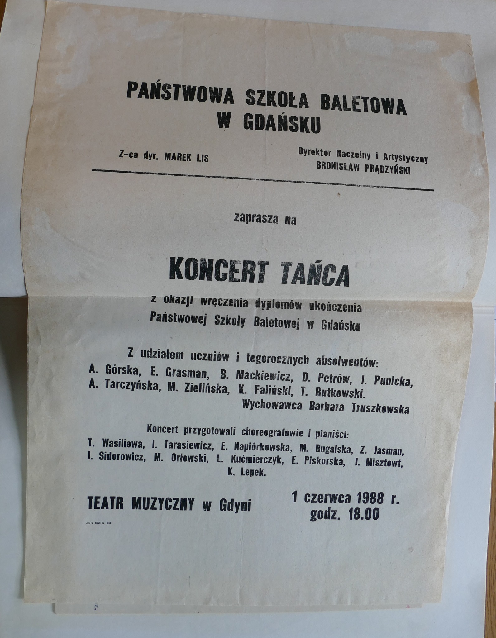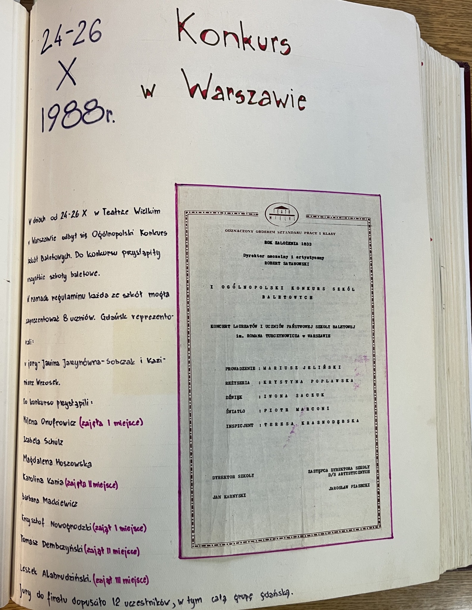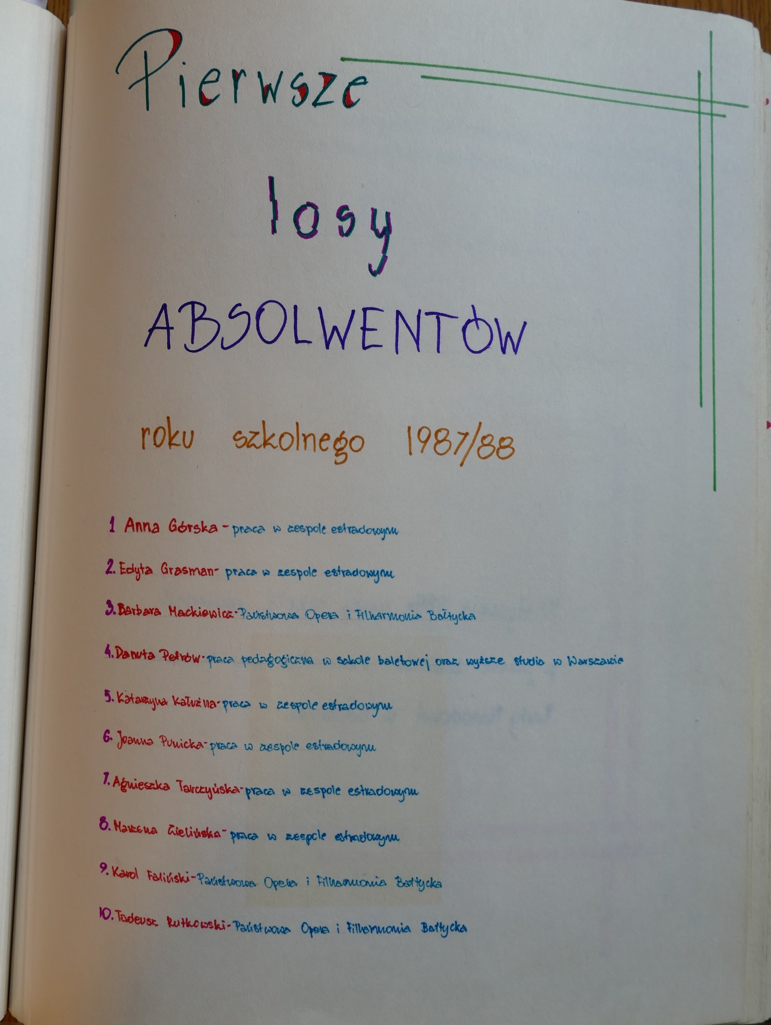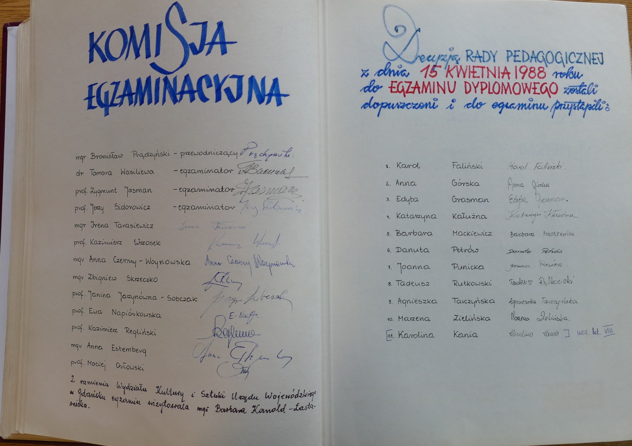 1988: Karol Faliński, Anna Górska, Edyta Grasman, Katarzyna Kałużna, Barbara Mackiewicz, Danuta Petrów, Joanna Punicka, Tadeusz Rutkowski, Agnieszka Tarczyńska, Marzena Zielińska