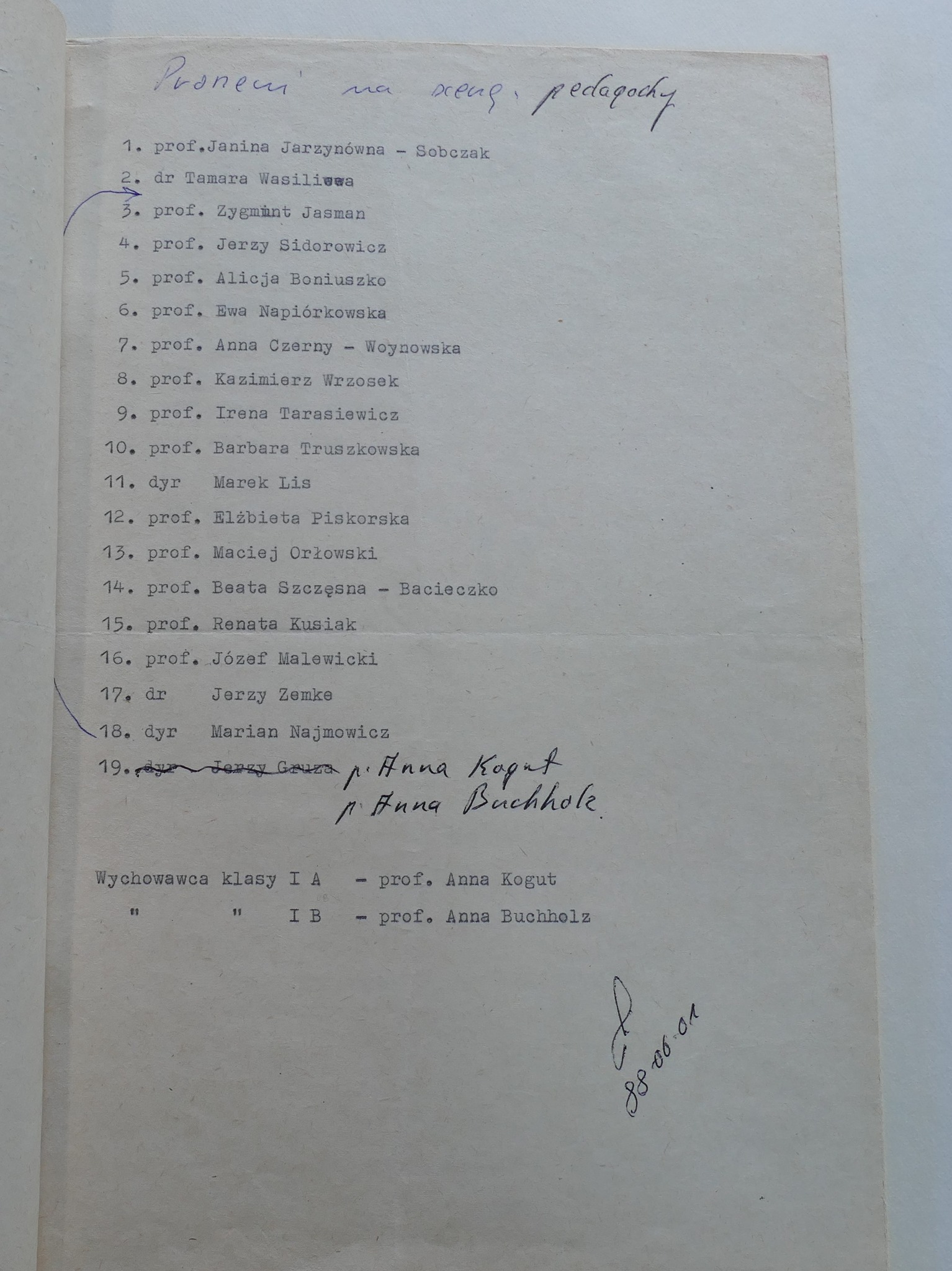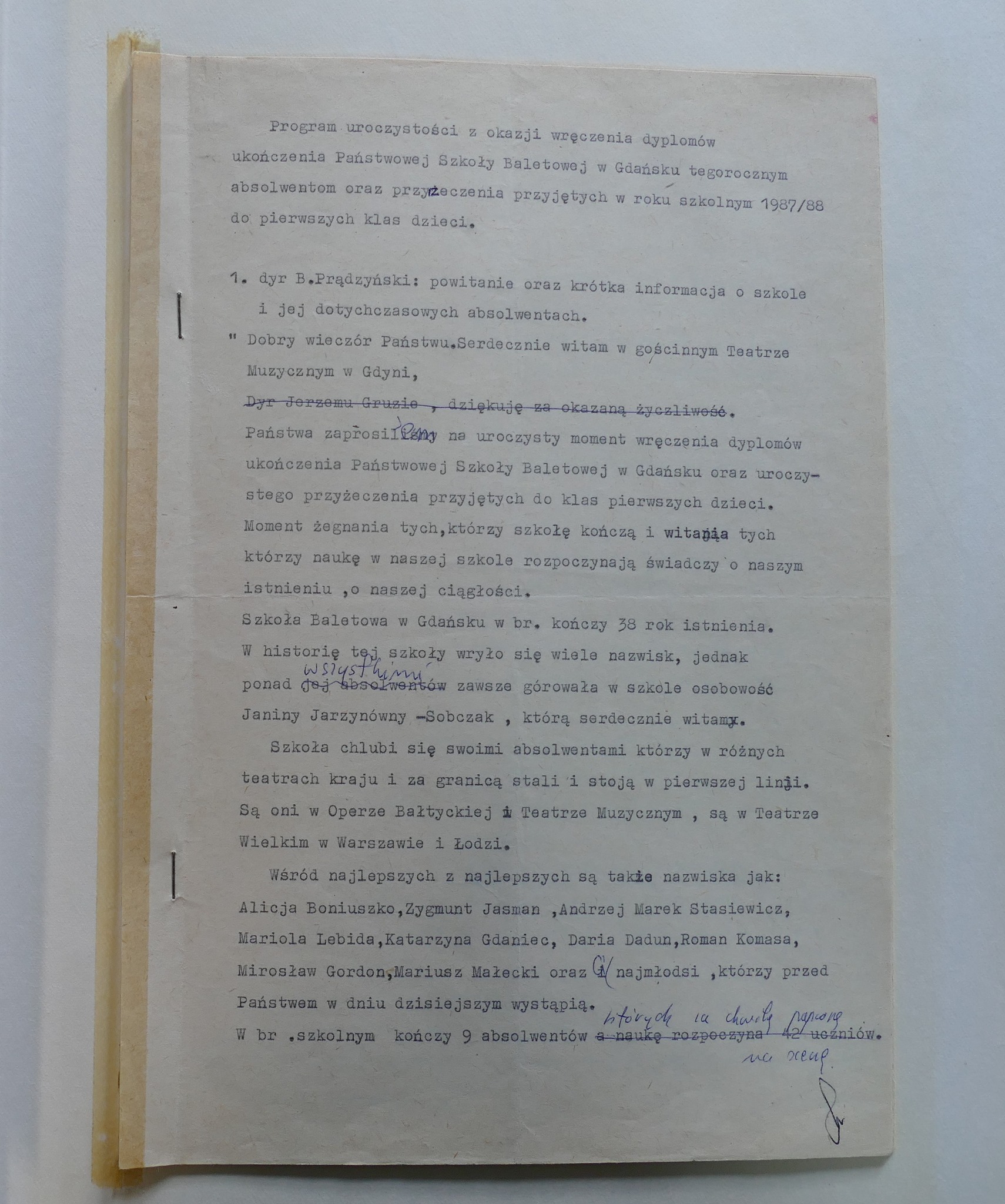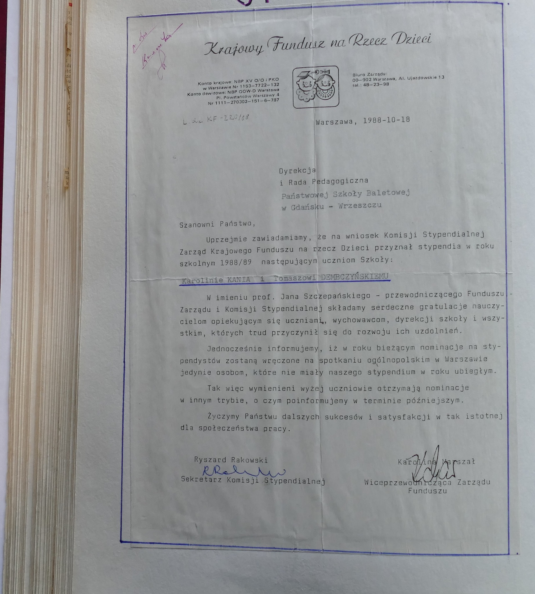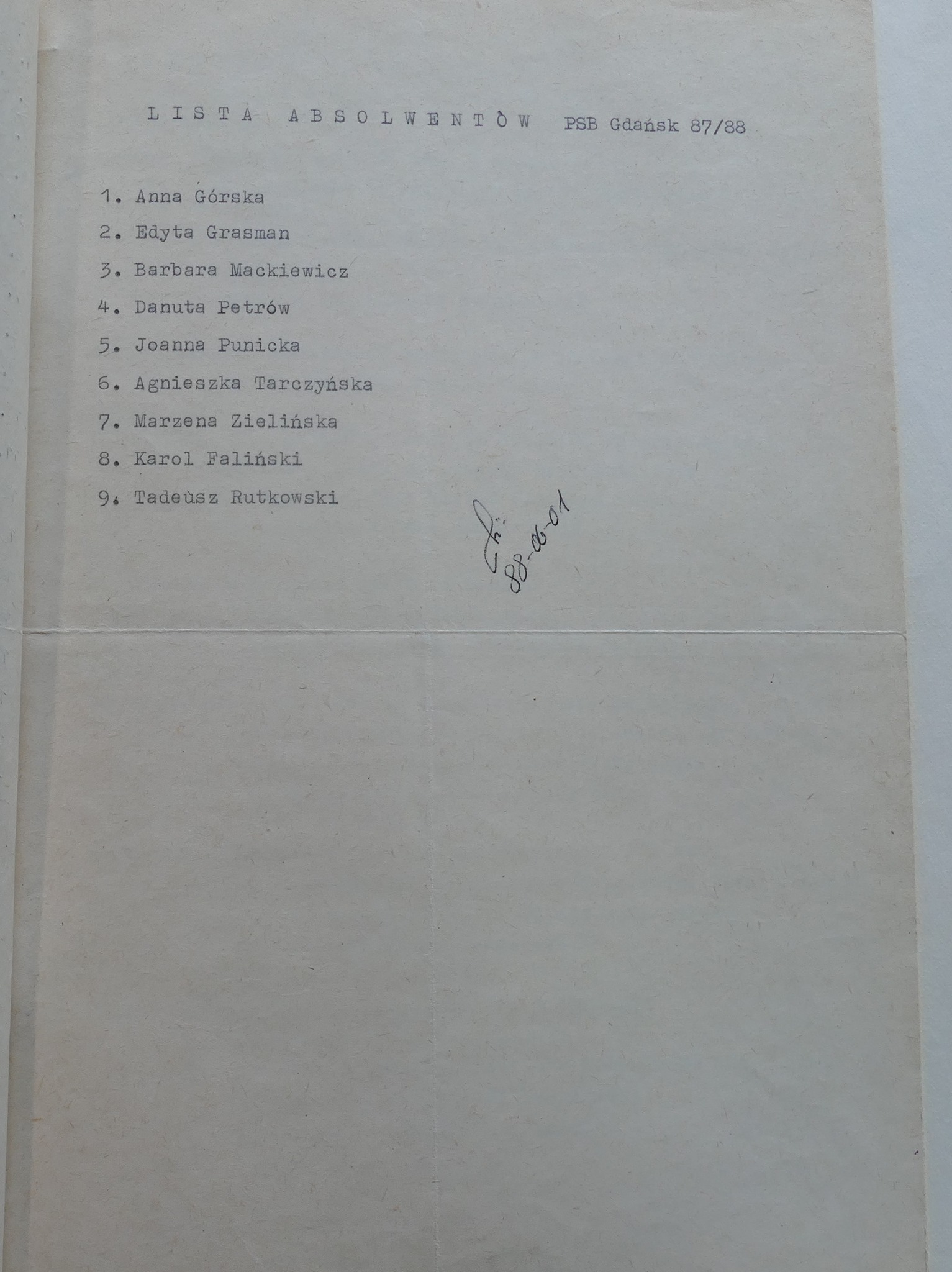 1988: Karol Faliński, Anna Górska, Edyta Grasman, Katarzyna Kałużna, Barbara Mackiewicz, Danuta Petrów, Joanna Punicka, Tadeusz Rutkowski, Agnieszka Tarczyńska, Marzena Zielińska