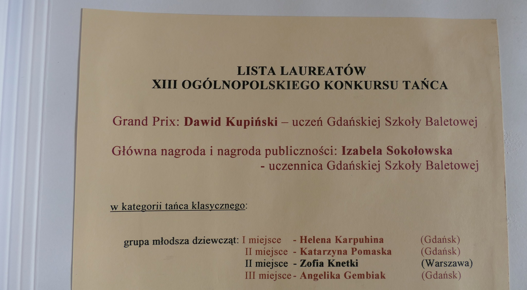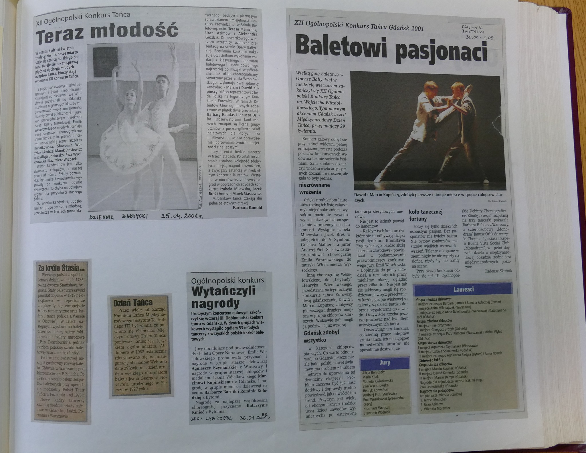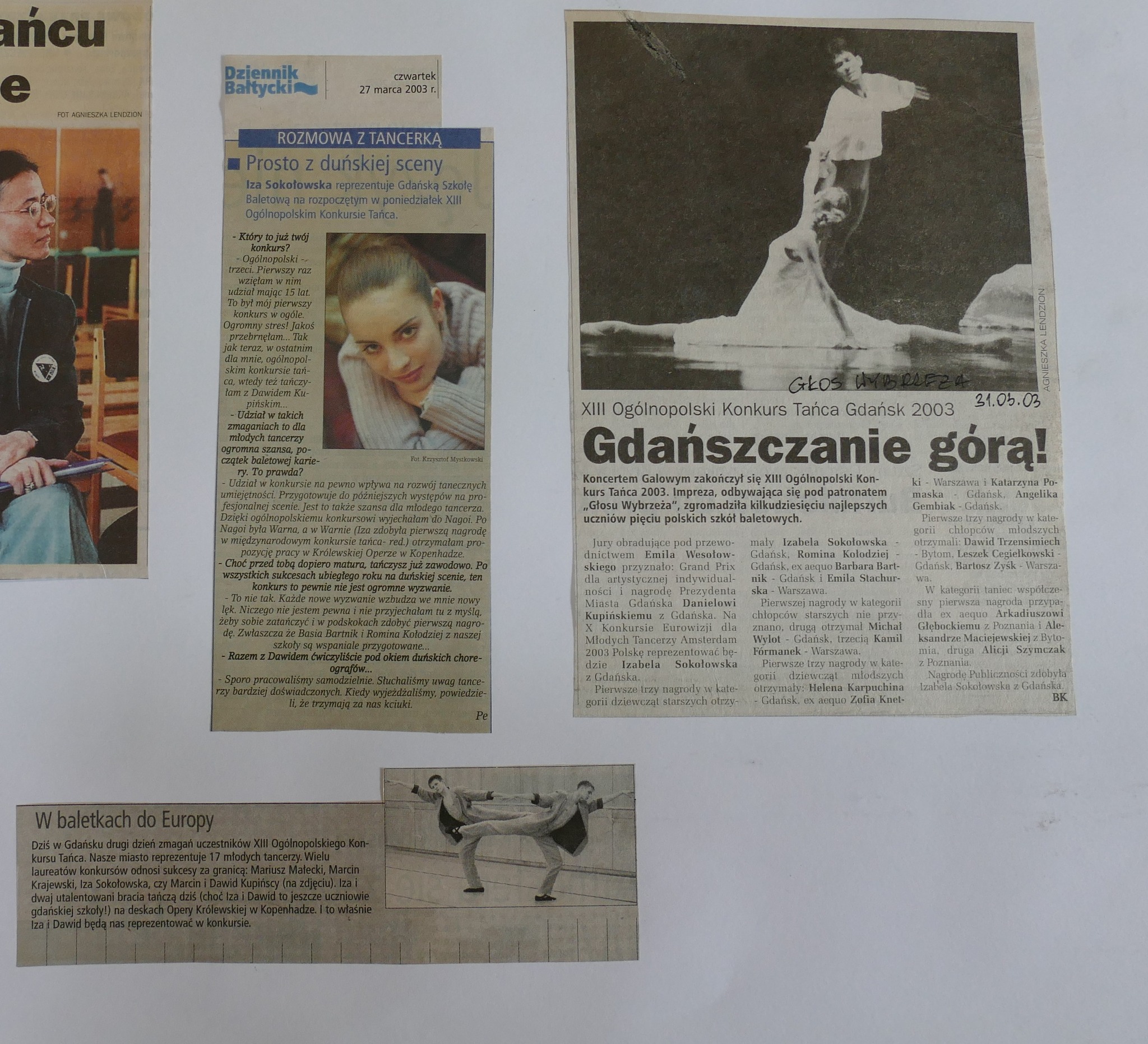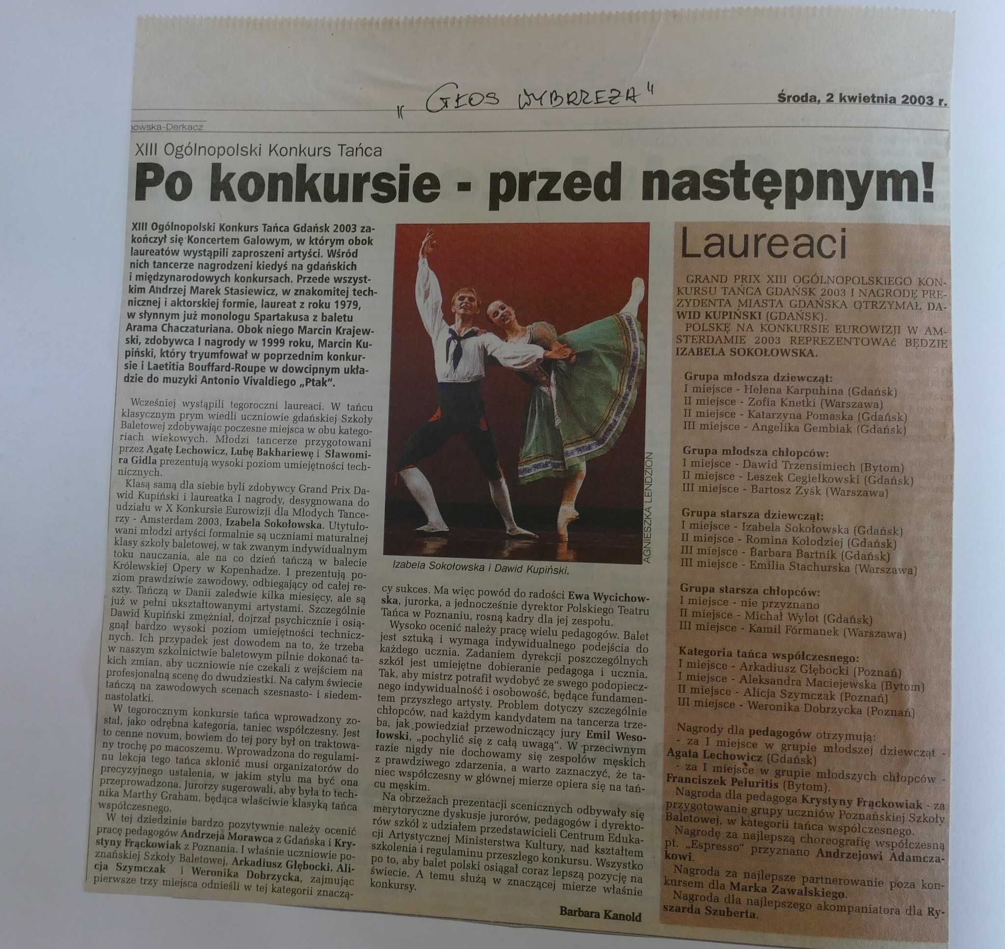 Tym, którzy uważnie śledzą, to co dzieje się podczas ogólnopolskich konkursów baletowych, dostrzegają znane sobie nazwiska. Powtarzają się one wśród laureatów kolejnych gdańskich konkursów tańca dla uczniów szkół baletowych: podczas XI Ogólnopolskiego Konkursu Tańca w 1999 roku Paulina Sałek wytańczyła I miejsce w grupie młodszej a Iza Sokołowska II miejsce. W tym samym konkursie w grupie młodszej chłopców Marcin Kupiński zdobył I miejsce, Jego brat Dawid – II, a kolega z klasy, Marcin Dempc – III miejsce. Po dwóch latach, w XII edycji gdańskiego konkursu, Iza znowu zajęła drugie miejsce, tylko w grupie starszej. Chłopcy również zmienili grupę wiekową, ale „podzielili się” nagrodami, podobnie, jak w 1999 roku. W kolejnym XIII Ogólnopolskim Konkursie Tańca, Gdańsk 2003 Izabela Sokołowska wytańczyła I miejsce w grupie starszej dziewcząt a Dawid Kupiński został – po Jacku Bresiu i Annie Sąsiadek – trzecim tancerzem z gdańskiej szkoły baletowej, który otrzymał Grand Prix konkursu.