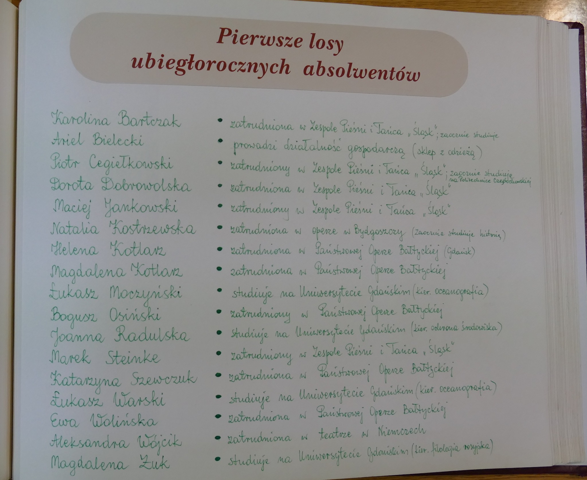 Nie znamy losów wszystkich absolwentów, ale wielu z nich wciąż tańczy lub blisko jest związanych z tańcem, sztuką. Wiemy, że Karolina Bartczak i Piotr Cegiełkowski zaraz po ukończeniu szkoły wyjechali z Gdańska i do dziś są tancerzami Zespołu Pieśni i Tańca „Śląsk”. Mikołaj Krawczyk jest aktorem (pewnie też czasem tańczącym ), ukończył Wydział Aktorski PWSFTviT w Łodzi.