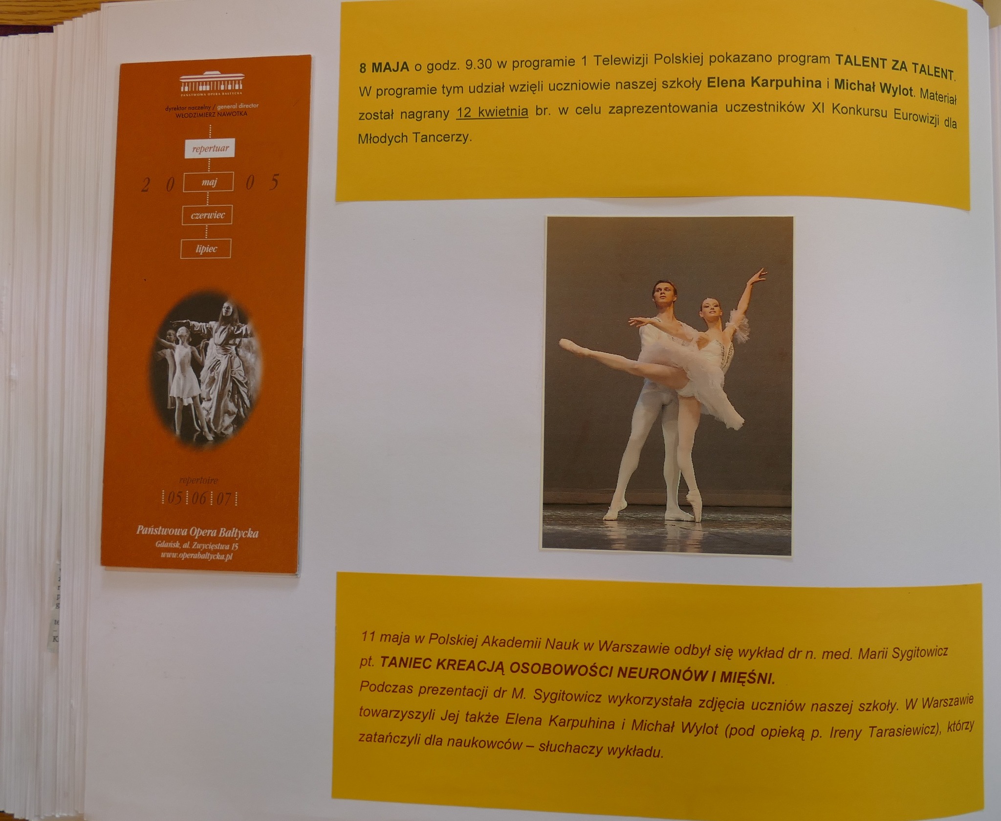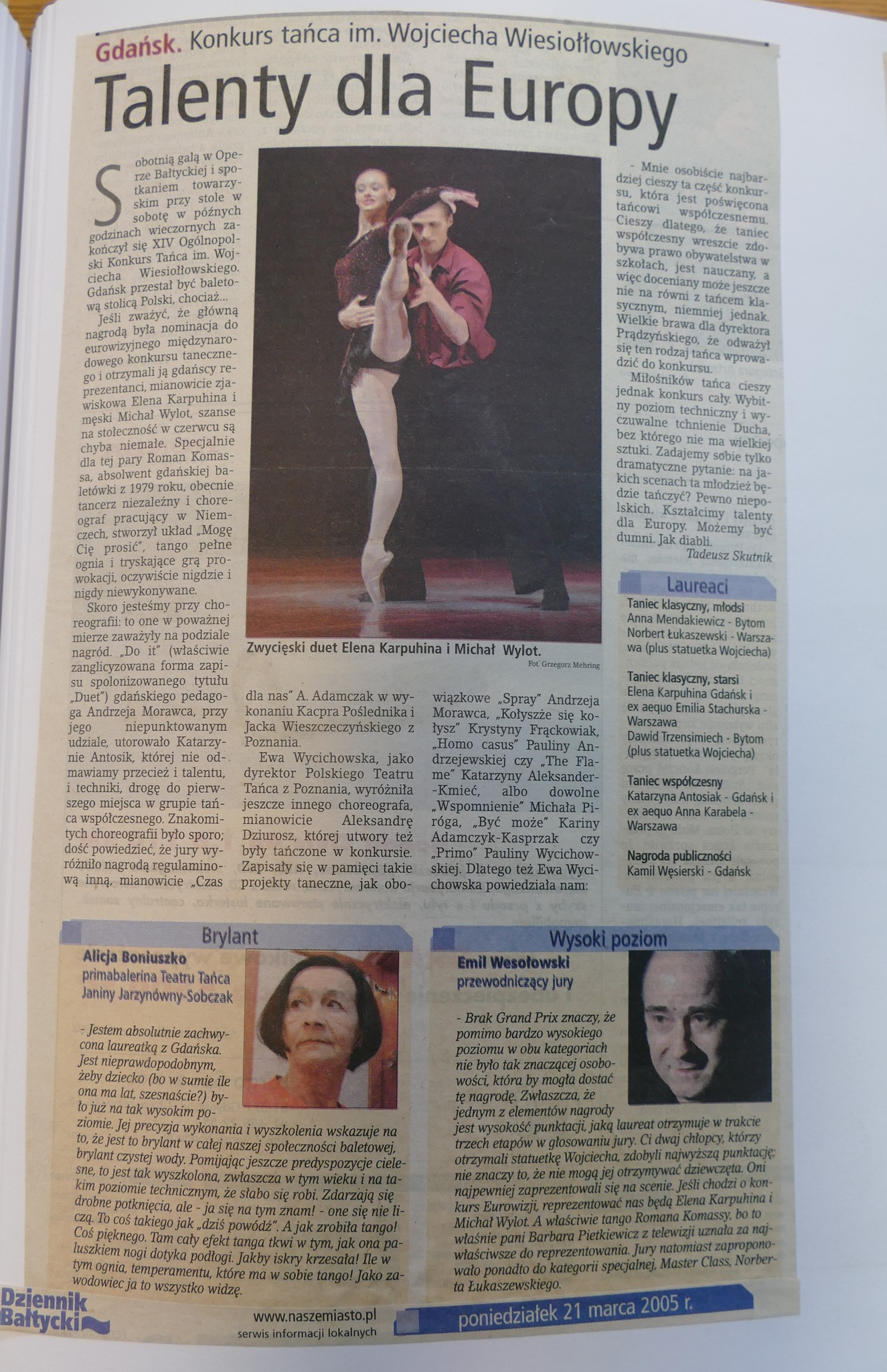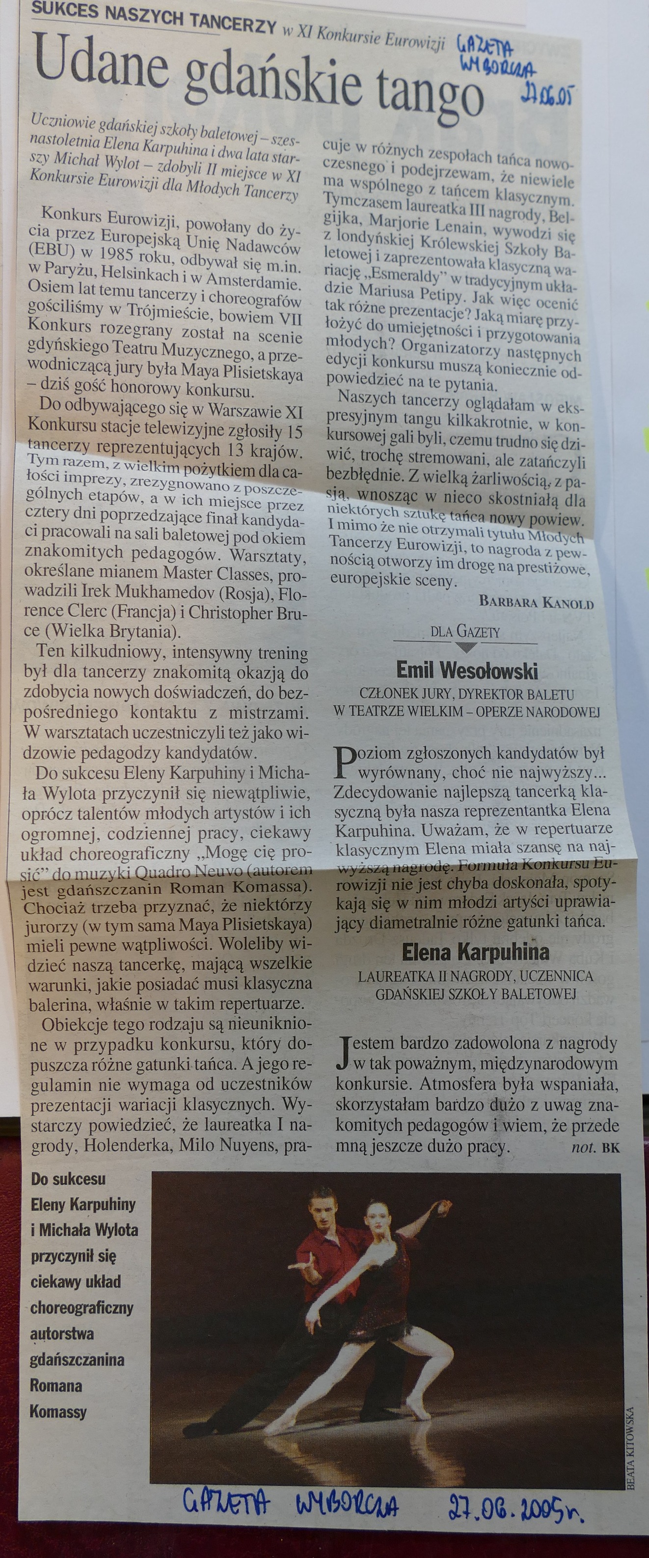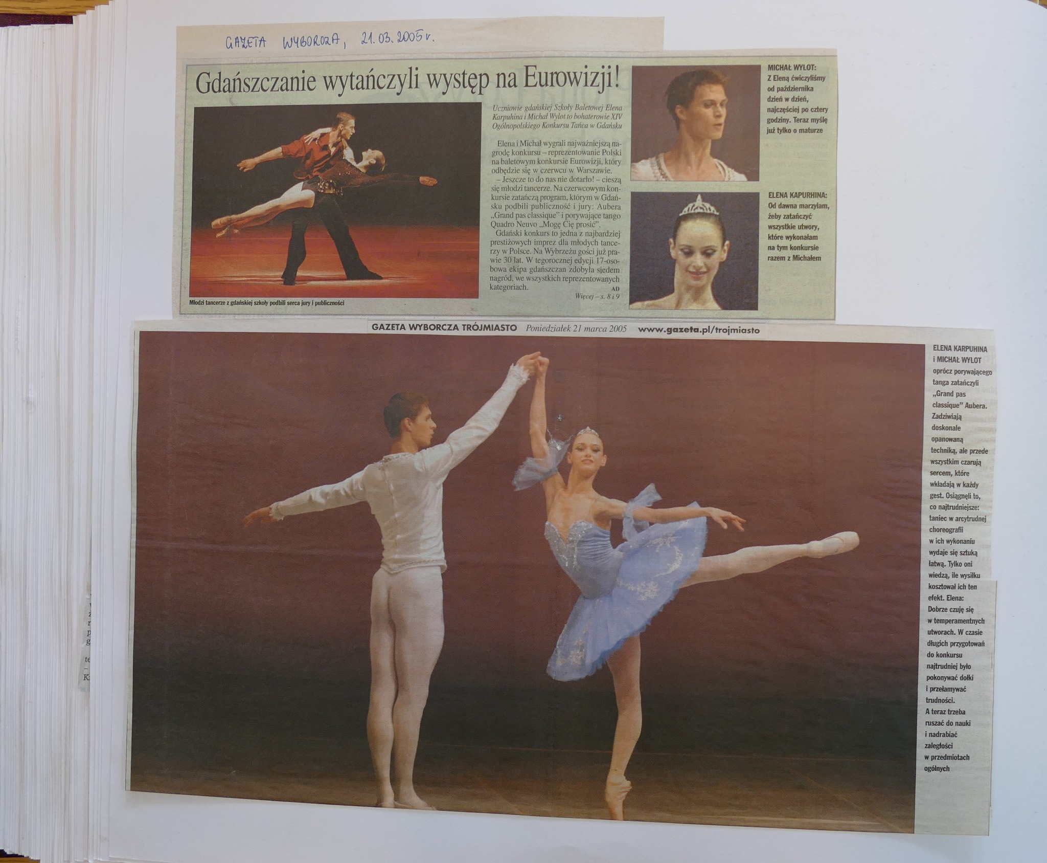 Na zdjęciach widzimy też Elenę Karpuhinę, o której szczegółowo pisać będziemy w przyszłym tygodniu. Teraz wspomnimy o Niej, bo wraz z Michałem Wylotem podczas XIV Ogólnopolskiego Konkursu Tańca w 2005 wytańczyli szczególne wyróżnienie – zostali nominowani do reprezentowana Polski podczas XI Międzynarodowego Konkursu Eurowizji dla Młodych Tancerzy. Jurorzy się nie pomylili dając szansę Elenie i Michałowi, bowiem w czerwcu 2005 podczas finału w Warszawie, młodzi gdańszczanie świetnie się zaprezentowali w wytańczyli II nagrodę.