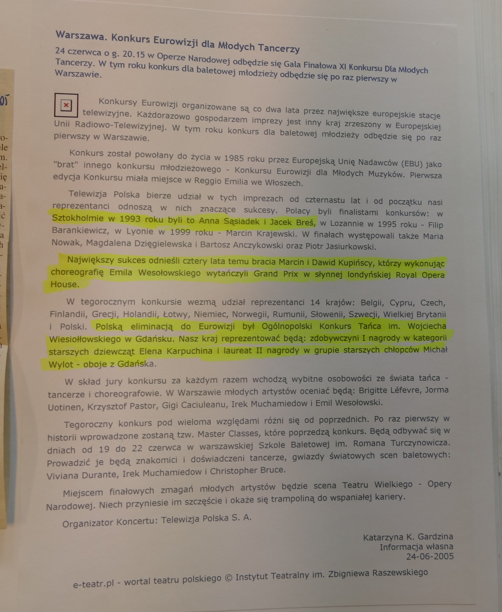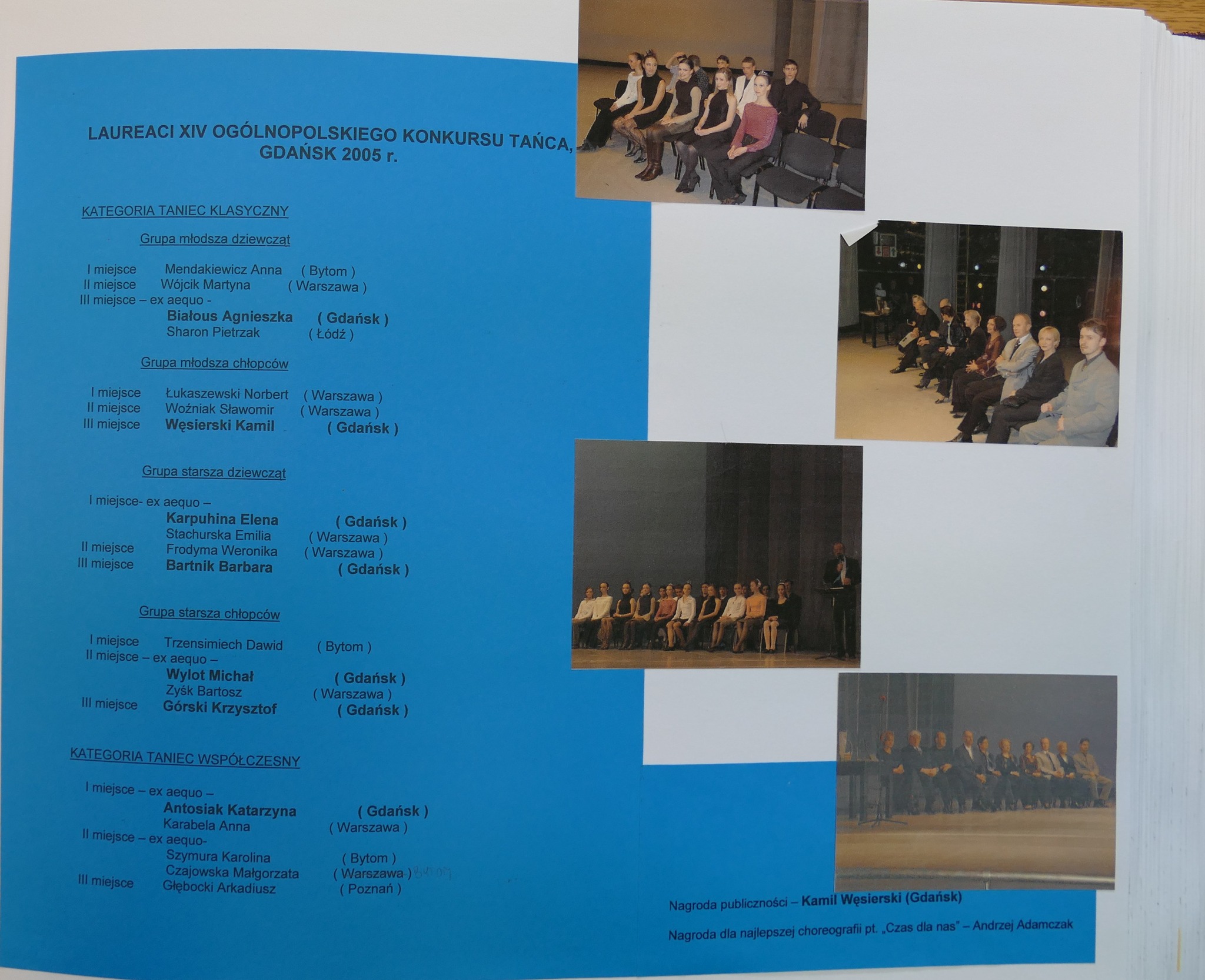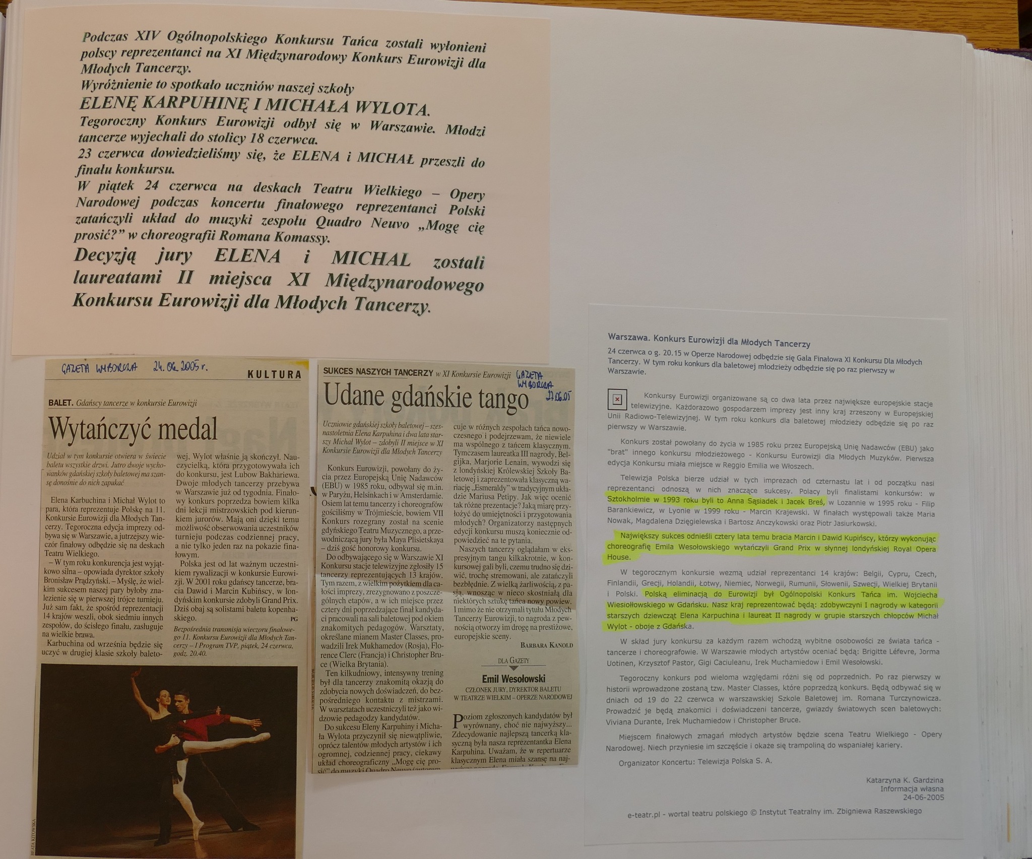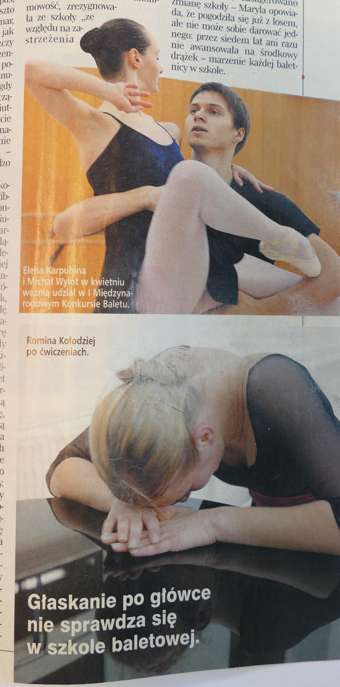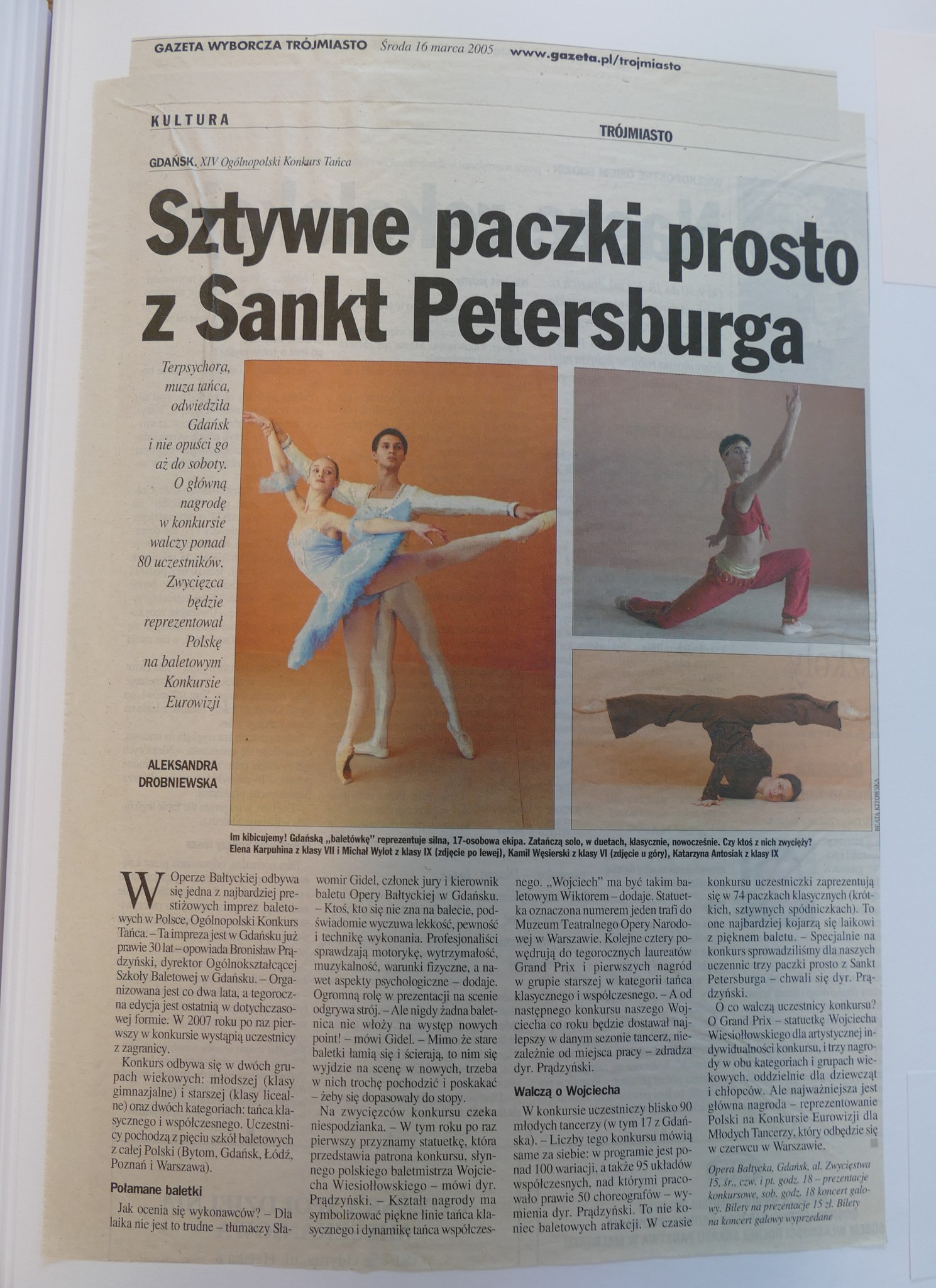 Na zdjęciach widzimy też Elenę Karpuhinę, o której szczegółowo pisać będziemy w przyszłym tygodniu. Teraz wspomnimy o Niej, bo wraz z Michałem Wylotem podczas XIV Ogólnopolskiego Konkursu Tańca w 2005 wytańczyli szczególne wyróżnienie – zostali nominowani do reprezentowana Polski podczas XI Międzynarodowego Konkursu Eurowizji dla Młodych Tancerzy. Jurorzy się nie pomylili dając szansę Elenie i Michałowi, bowiem w czerwcu 2005 podczas finału w Warszawie, młodzi gdańszczanie świetnie się zaprezentowali w wytańczyli II nagrodę.