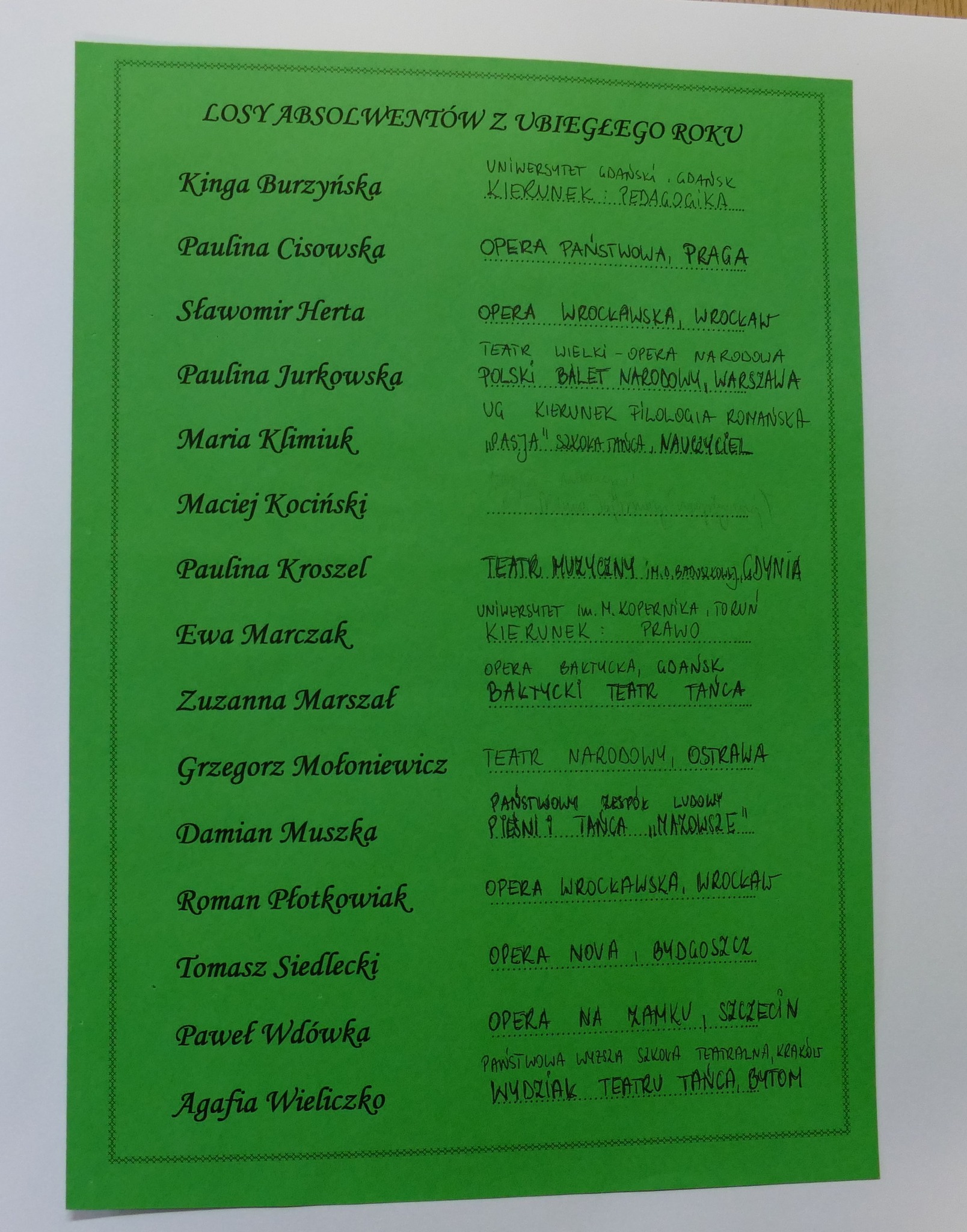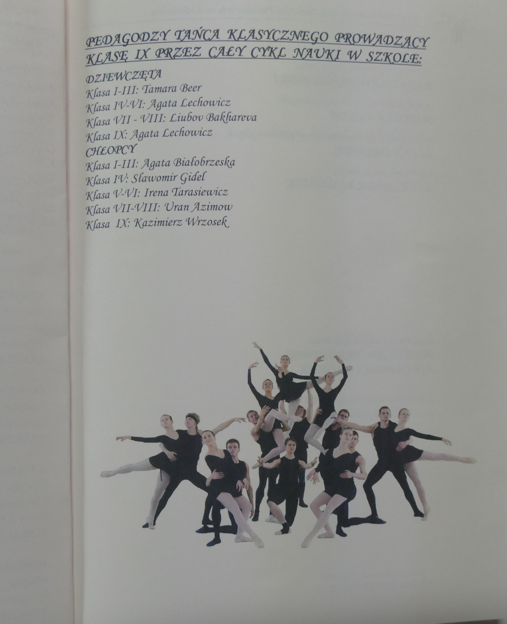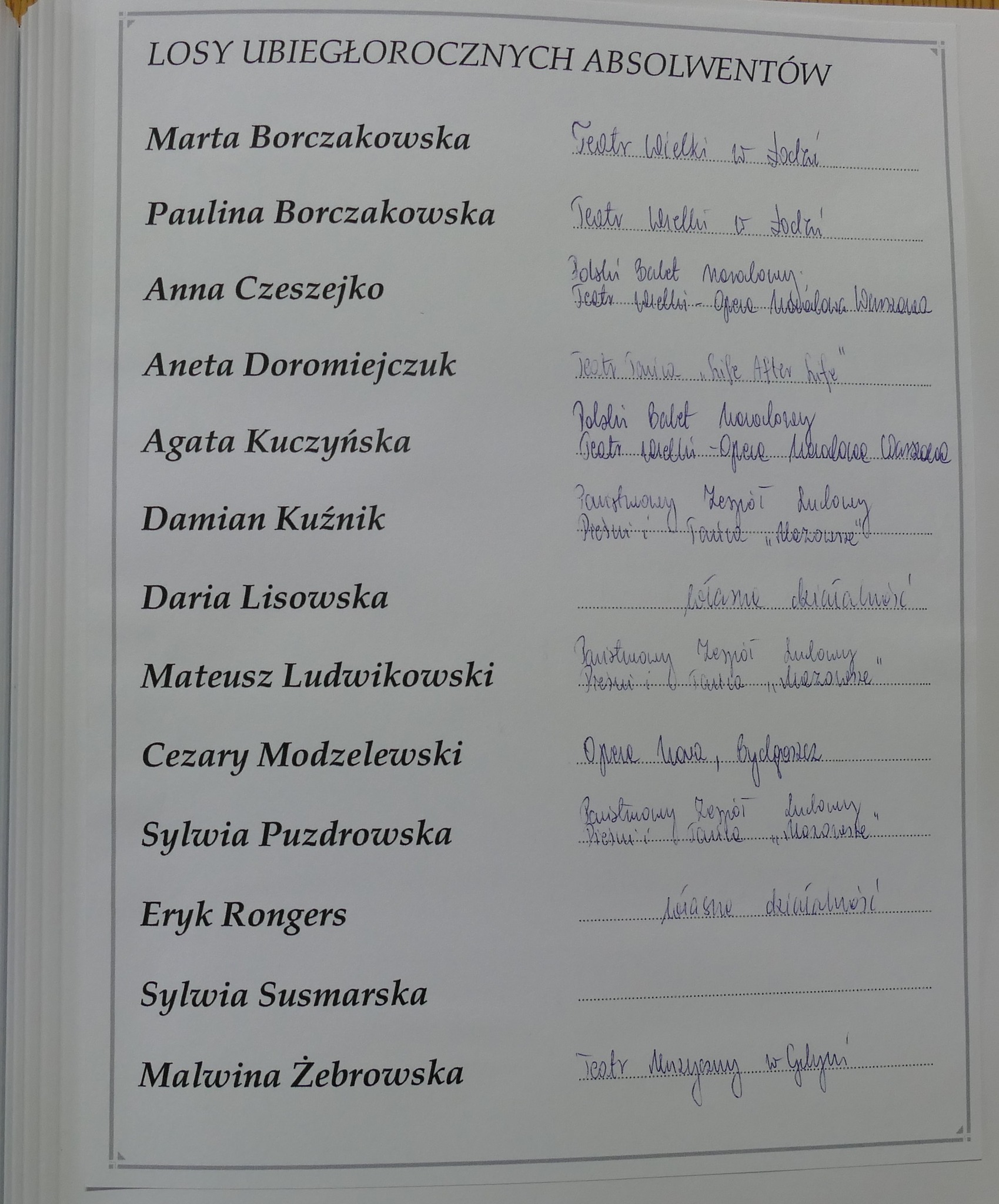 Wśród absolwentów wyżej wymienionych roczników są laureaci ogólnopolskich konkursów tańca z lat 2007 i 2009 (Paulina Cisłowska, Paulina Jurkowska, Marta Borczakowska, Agata Kuczyńska, Cezary Modzelewski). Wielu z nich wciąż tańczy: Ania Czeszejko jest solistką a Paulina Jurkowska koryfejką w Polskim Balecie Narodowym w Warszawie. Paulina Kroszel jest tancerką w Teatrze Muzycznym w Gdyni. A Grzegorz Mołoniewicz i Cezary Modzelewski osiedlili się za granicą… Zresztą Cezary przyjechał kilka lat temu do Gdańska, odwiedził szkołę i opowiedział swoim młodszym koleżankom i kolegom o tym, jak mieszka się w Japonii i jak inaczej – niż w Europie - wygląda praca w tamtejszych teatrach.