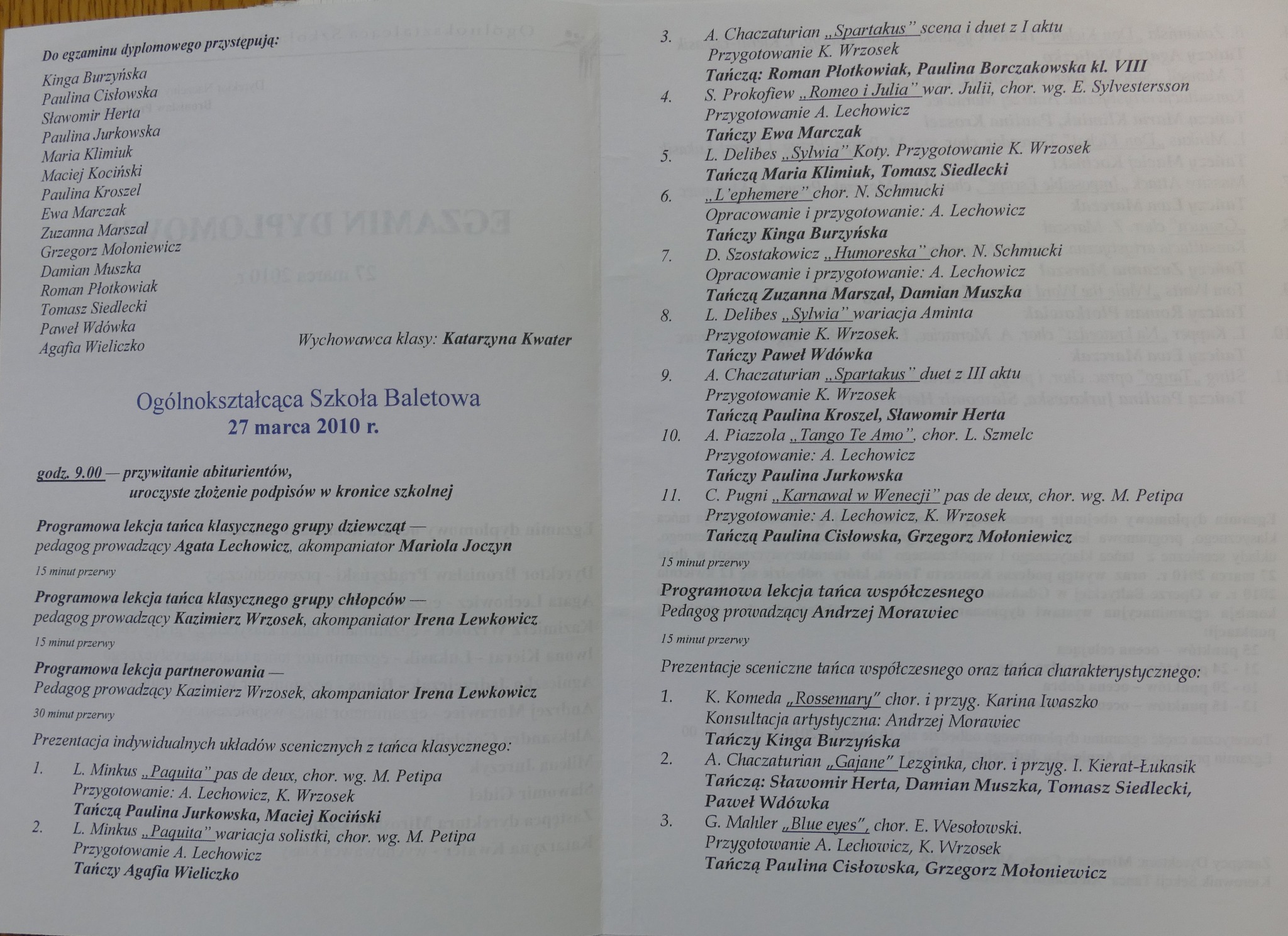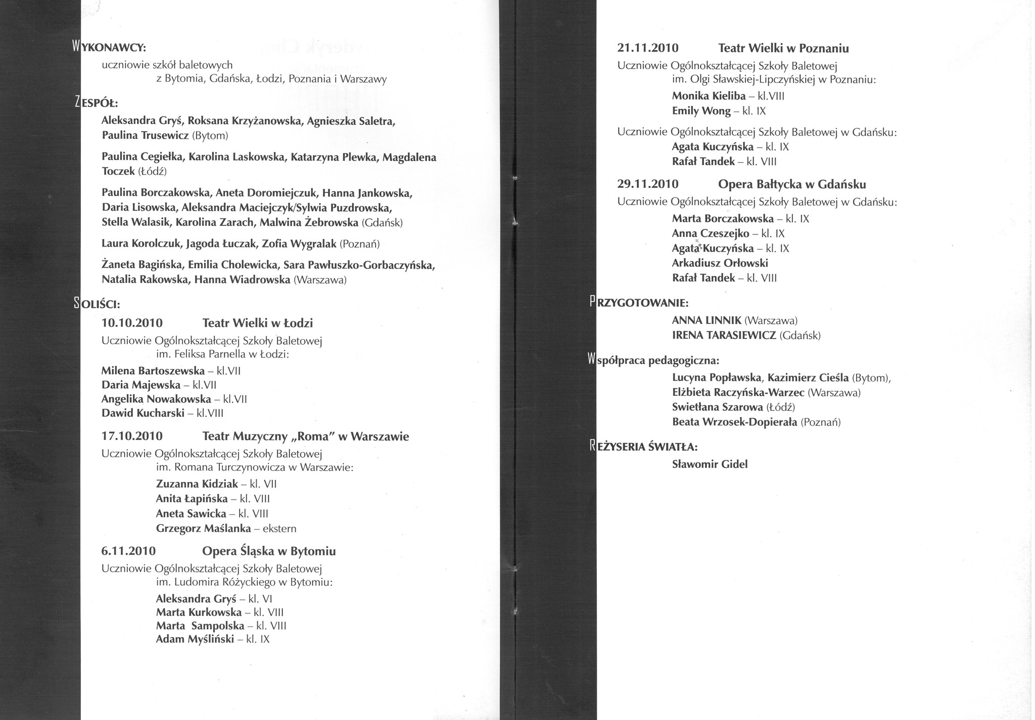 2010: Kinga Burzyńska, Paulina Cisłowska, Sławomir Herta, Paulina Jurkowska, Maria Klimiuk, Maciej Kociński, Paulina Kroszel, Ewa Marczak, Zuzanna Marszał, Grzegorz Mołoniewicz, Damian Muszka, Roman Płotkowiak, Tomasz Siedlecki, Paweł Wdówka, Agafia Wieliczko