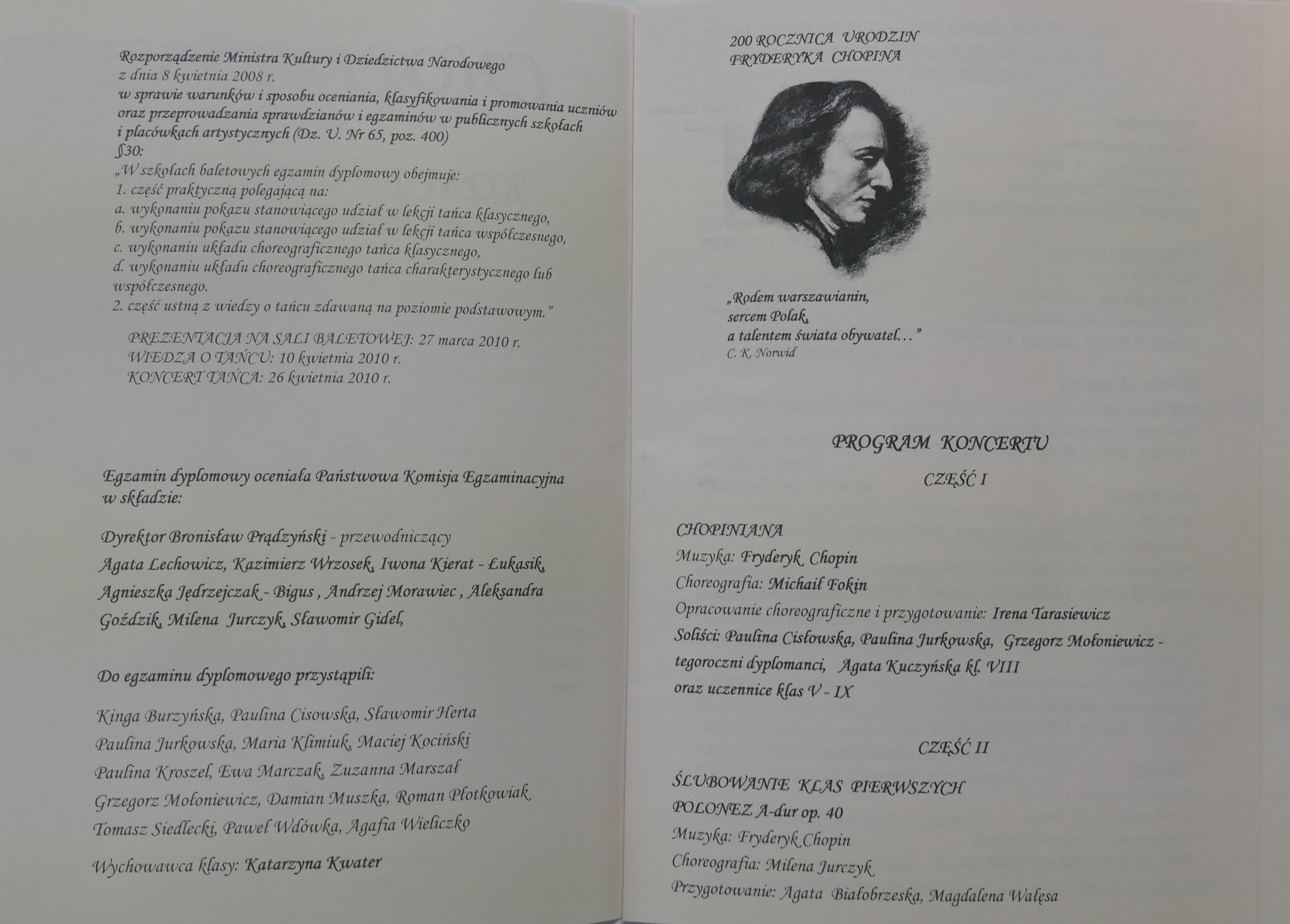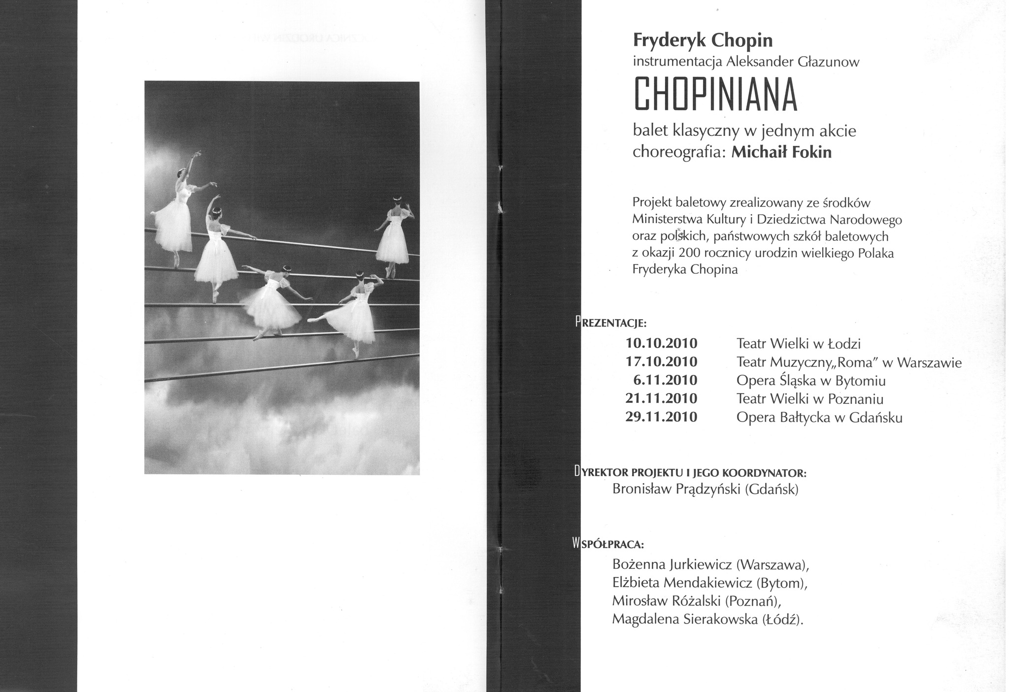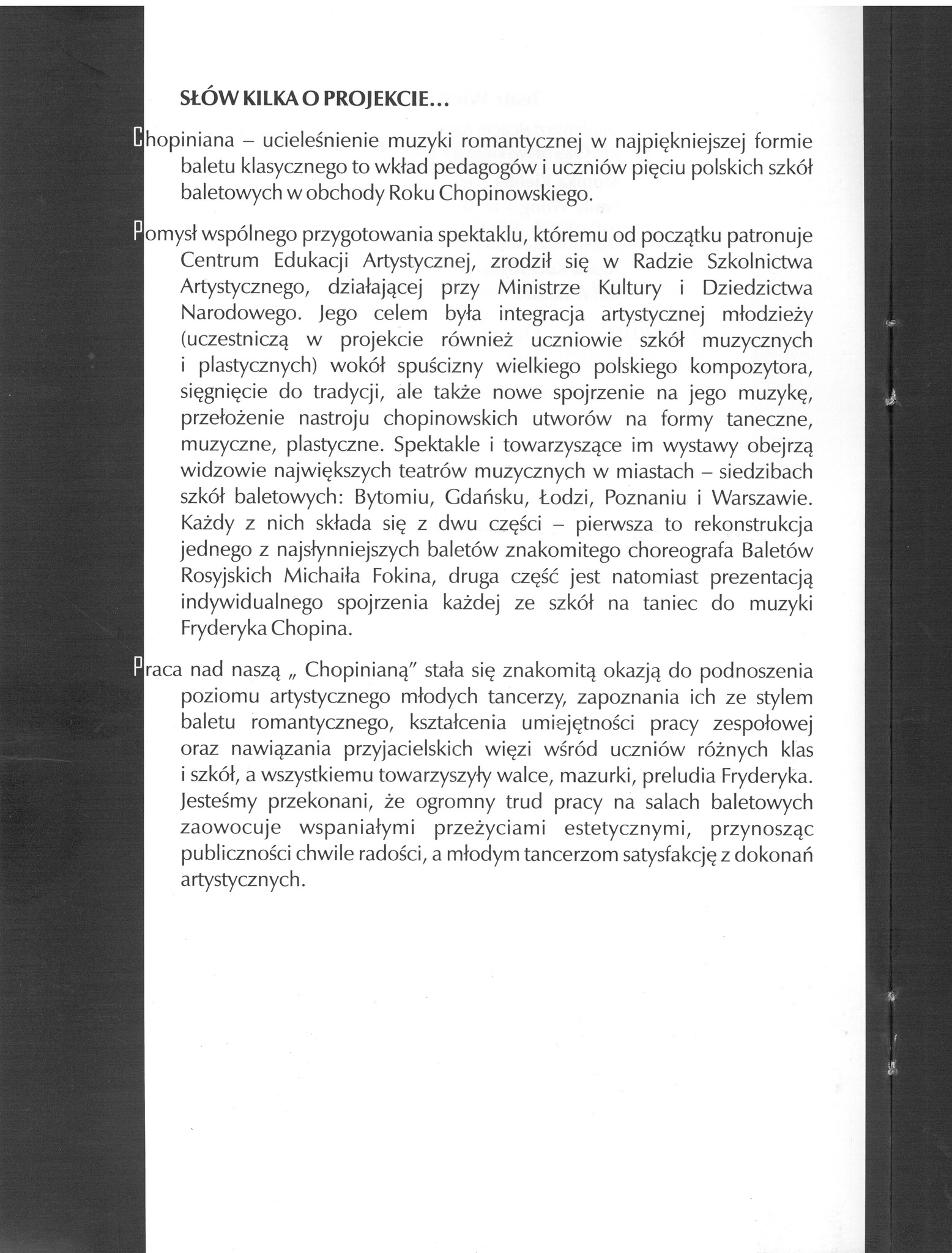 Wspomniani młodzi tancerze mieli okazję brać udział w projekcie przygotowanym na 200-lecie urodzin Fryderyka Chopina. To wspólne przedsięwzięcie wszystkich szkół baletowych: „Chopiniana” zatańczona przez uczniów ze szkół w Bytomiu, Gdańsku, Łodzi, Poznaniu i Warszawie, po kolei w każdym z tych miast... W galerii kilka zdjęć ze wspólnych prób, które odbywały się w naszej szkole…