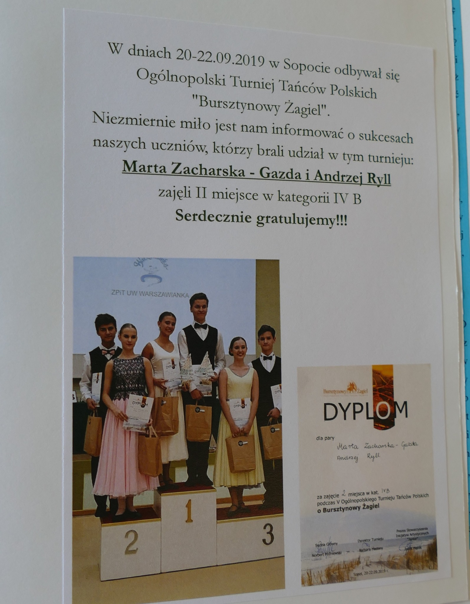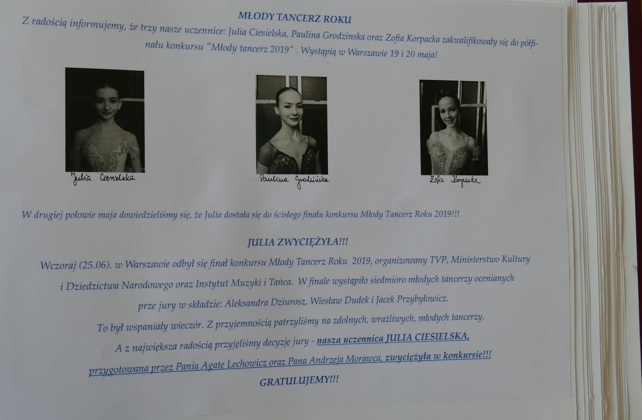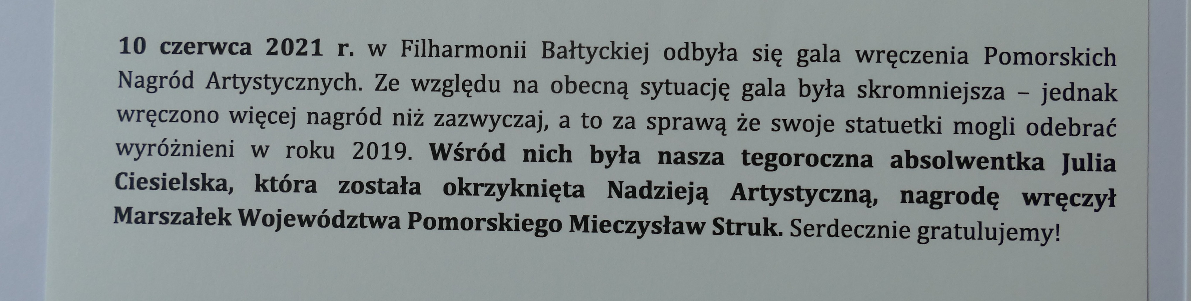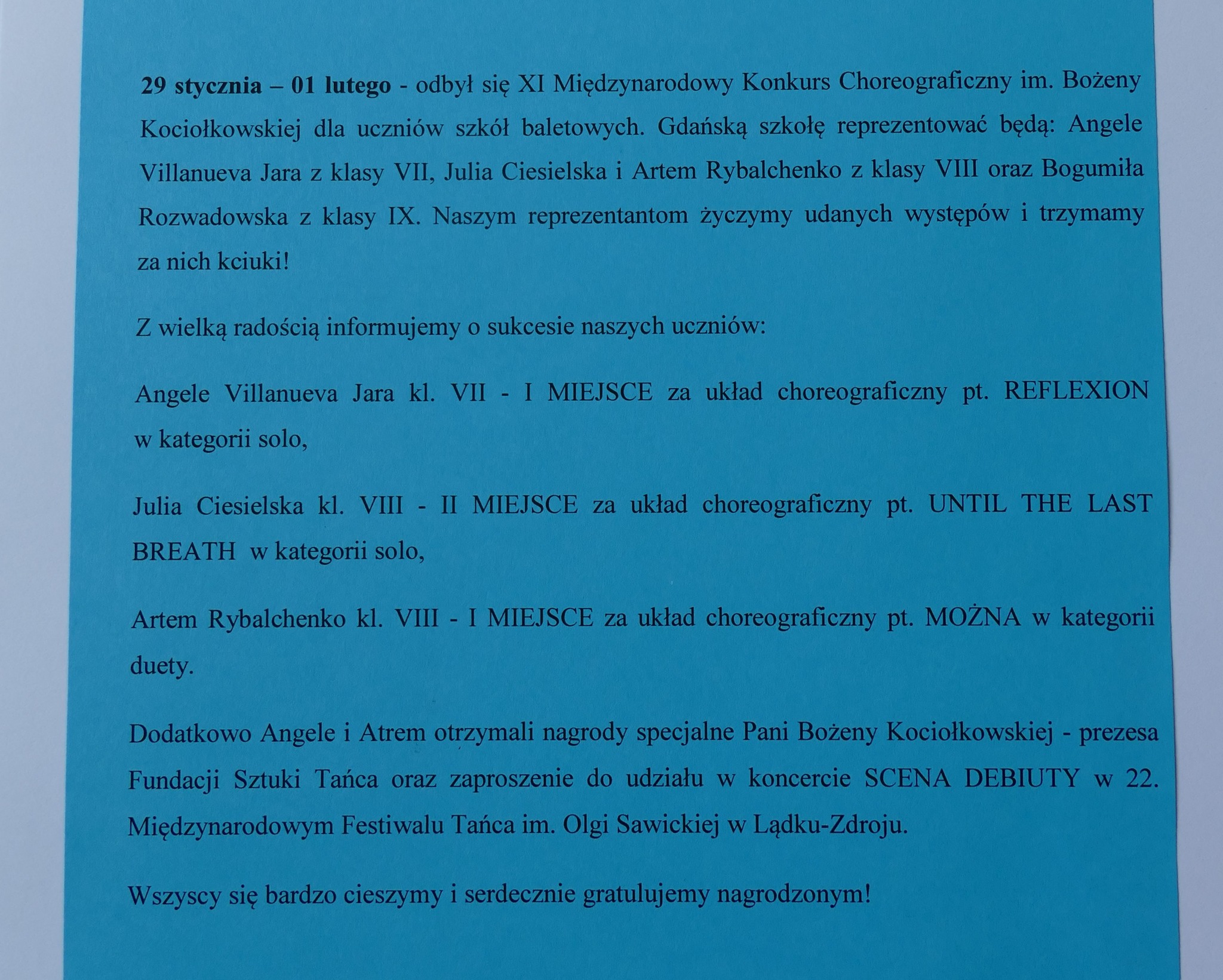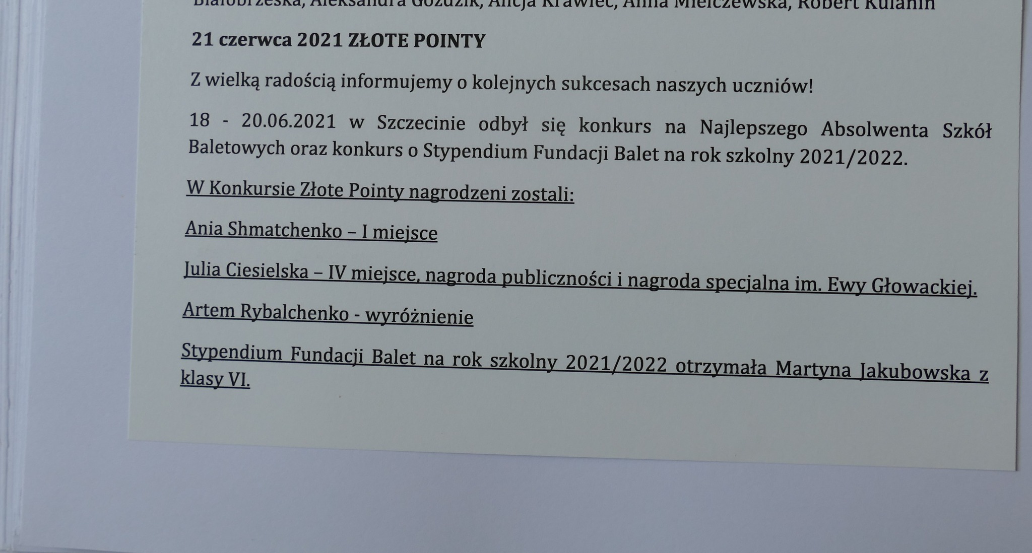 Wśród absolwentów z ww roczników jest wielu uczestników konkursów tańca – panująca pandemia spowolniła trochę działania szkoły. Ale nasi uczniowie się nie poddali – dzielnie ćwiczyli w domach i dbali o swój rozwój. Niesamowitą radość sprawili nam Julia Ciesielska i Artem Rybalchenko, którzy w dwóch kolejnych edycjach konkursu Młody Tancerz Roku, zdobyli główną nagrodę. Julia w 2019 a Artem w 2021 roku. Na marginesie możemy dodać, że w następnej edycji, w 2023 roku, znowu główny tytuł zdobył nasz uczeń… Ale o Nim napiszemy za czas jakiś….