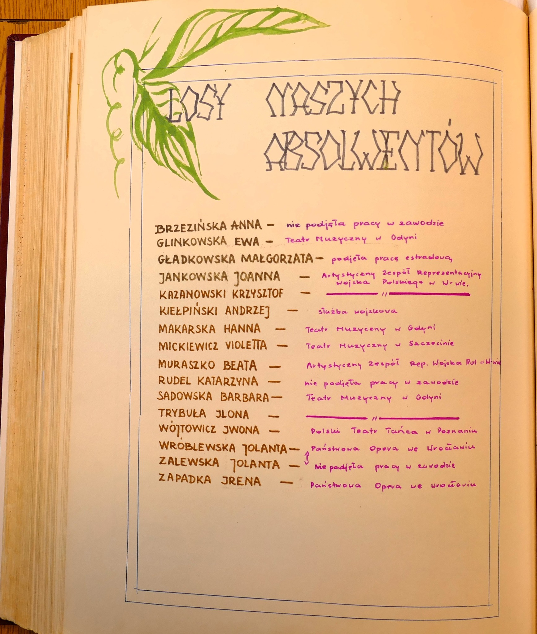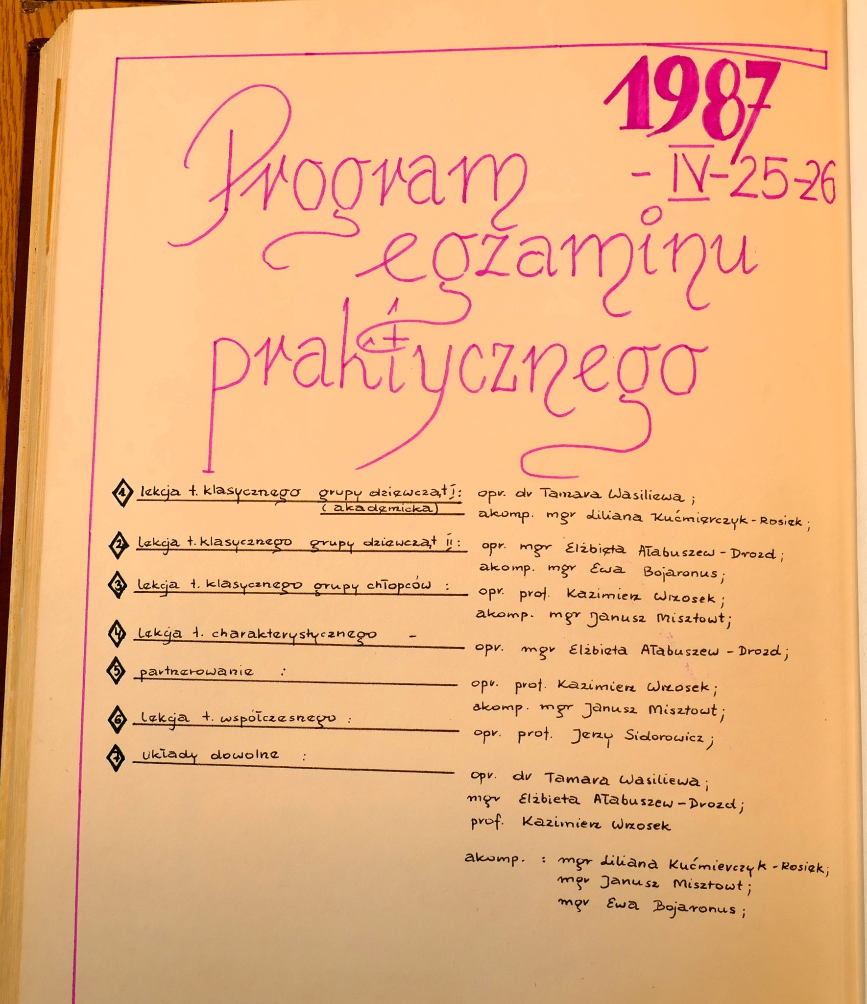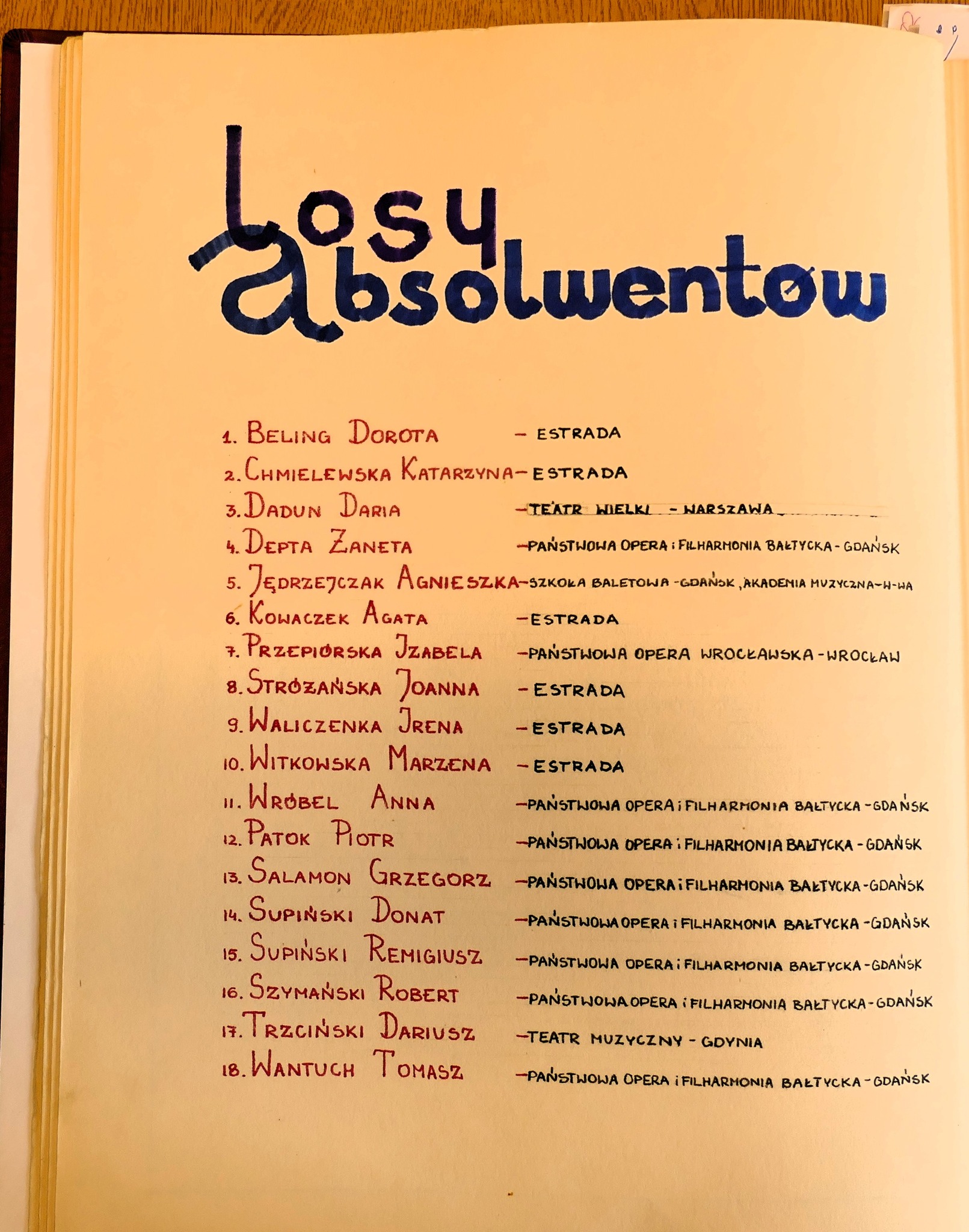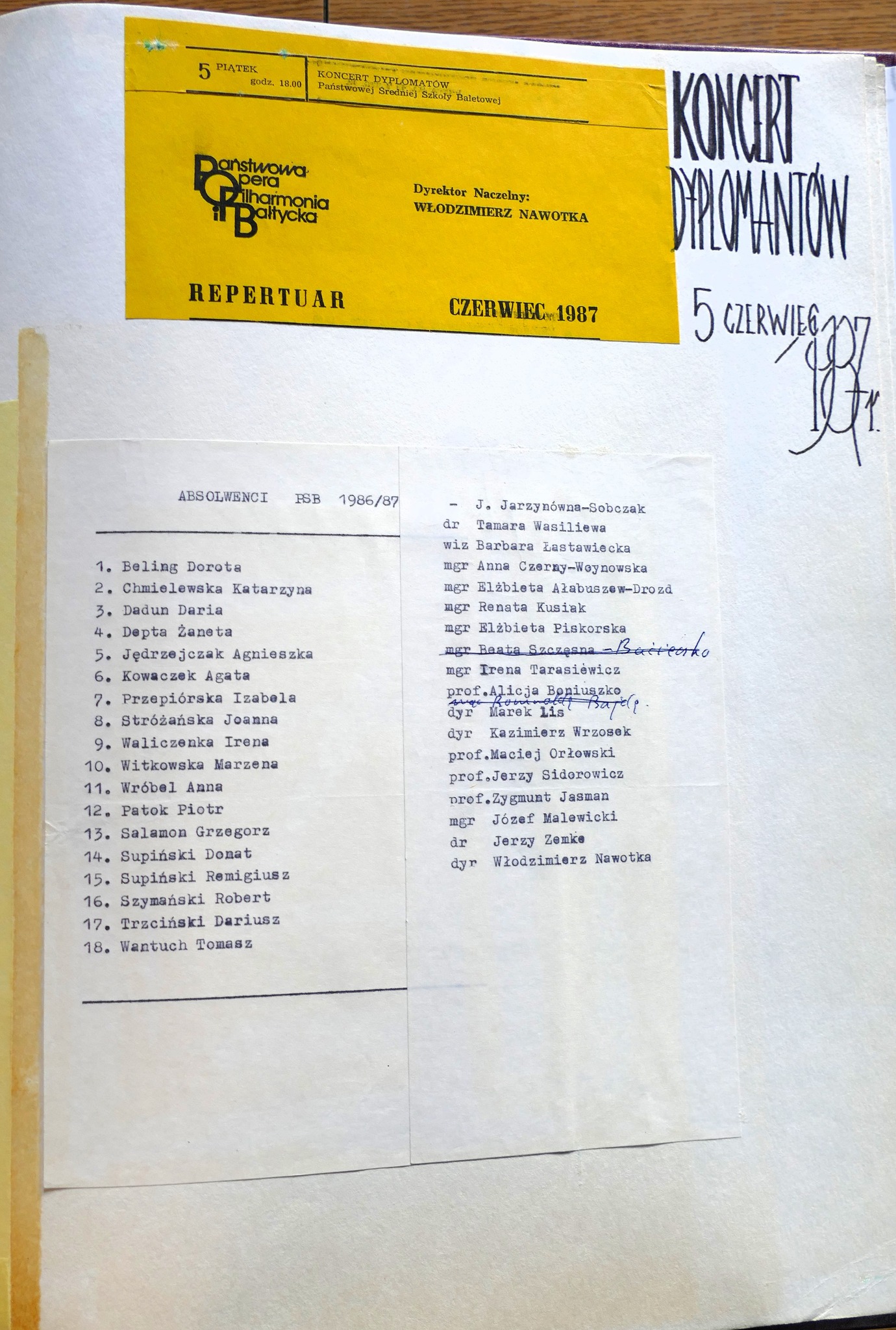 1986: Anna Brzezińska, Ewa Glinkowska, Małgorzata Gładkowska, Joanna Jankowska, Krzysztof Kazanowski, Andrzej Kiełpiński, Hanna Makarska, Violetta Mickiewicz, Beata Muraszko, Katarzyna Rudel, Barbara Sadowska, Ilona Trybuła, Iwona Wójtowicz, Jolanta Wróblewska, Jolanta Zalewska, Irena Zapadka