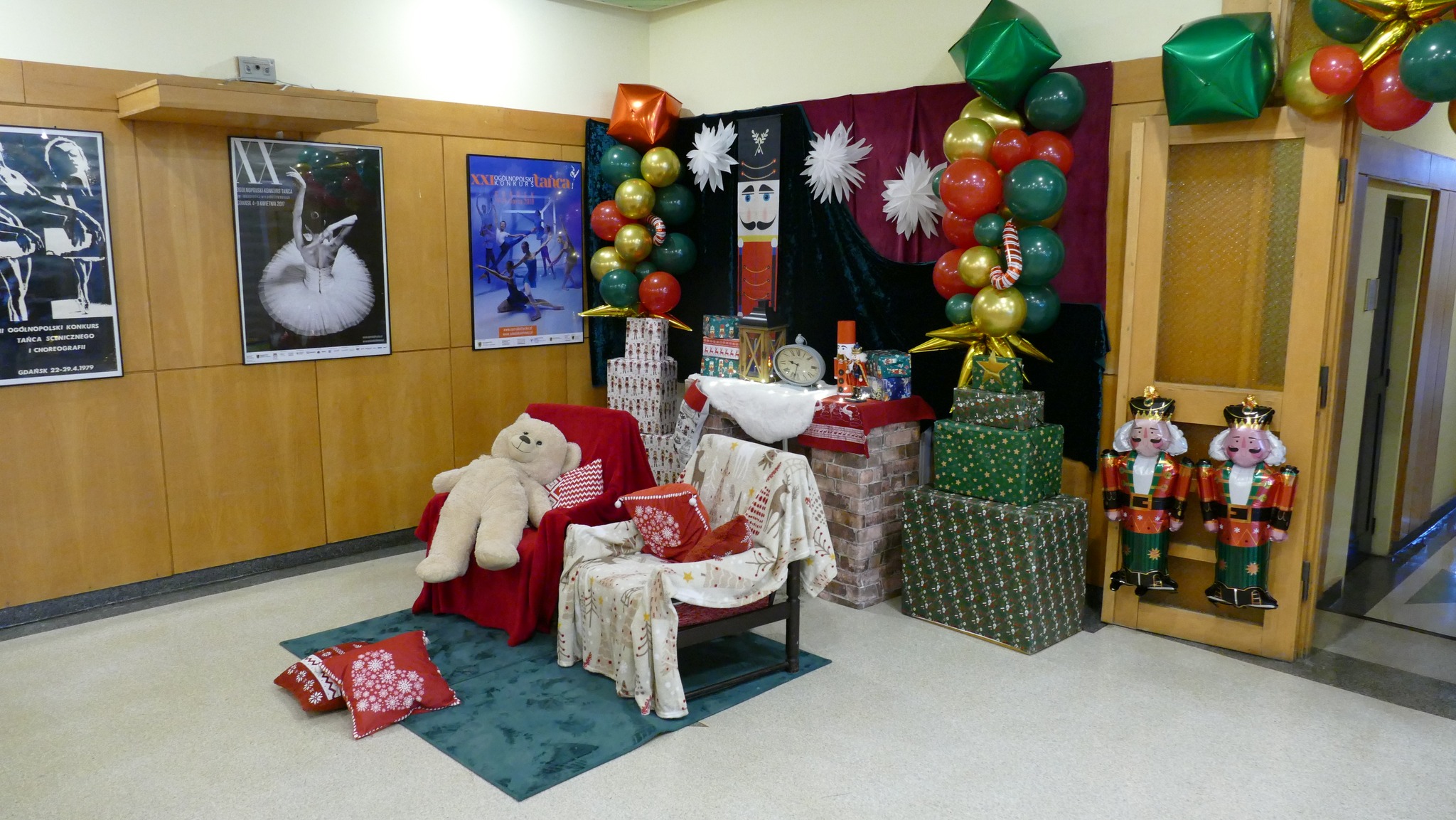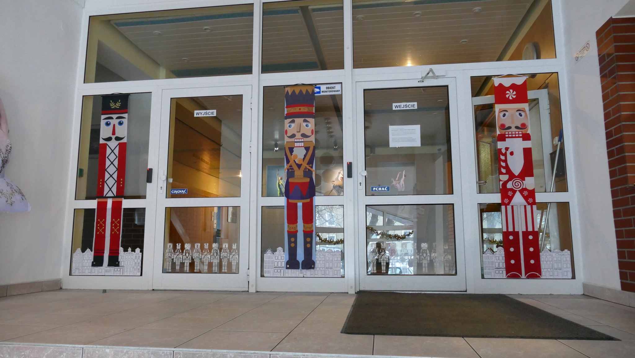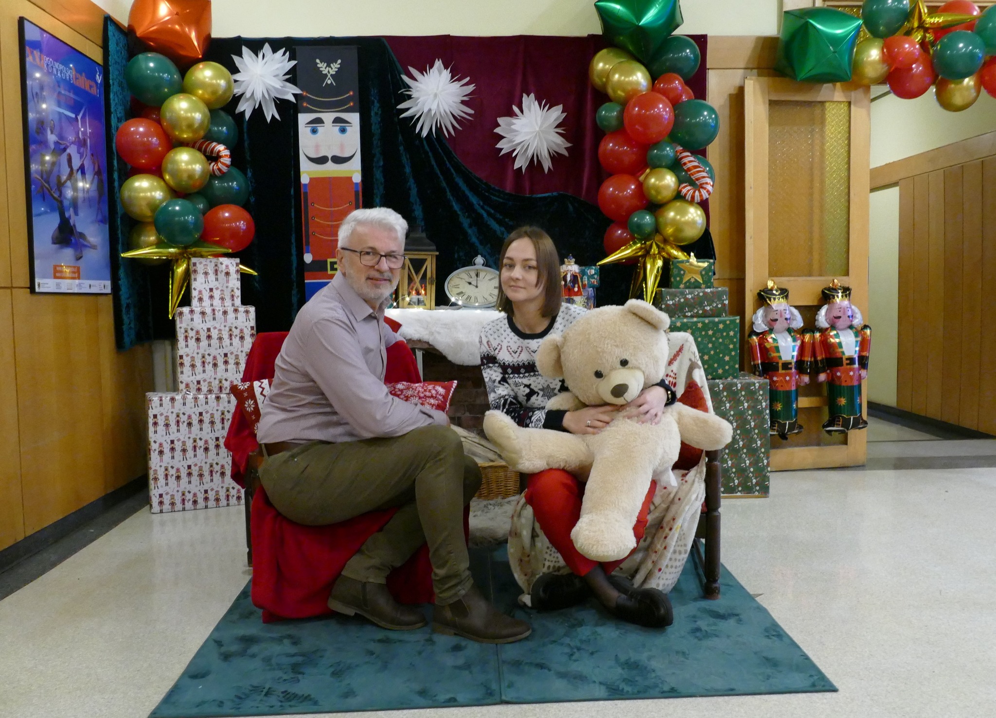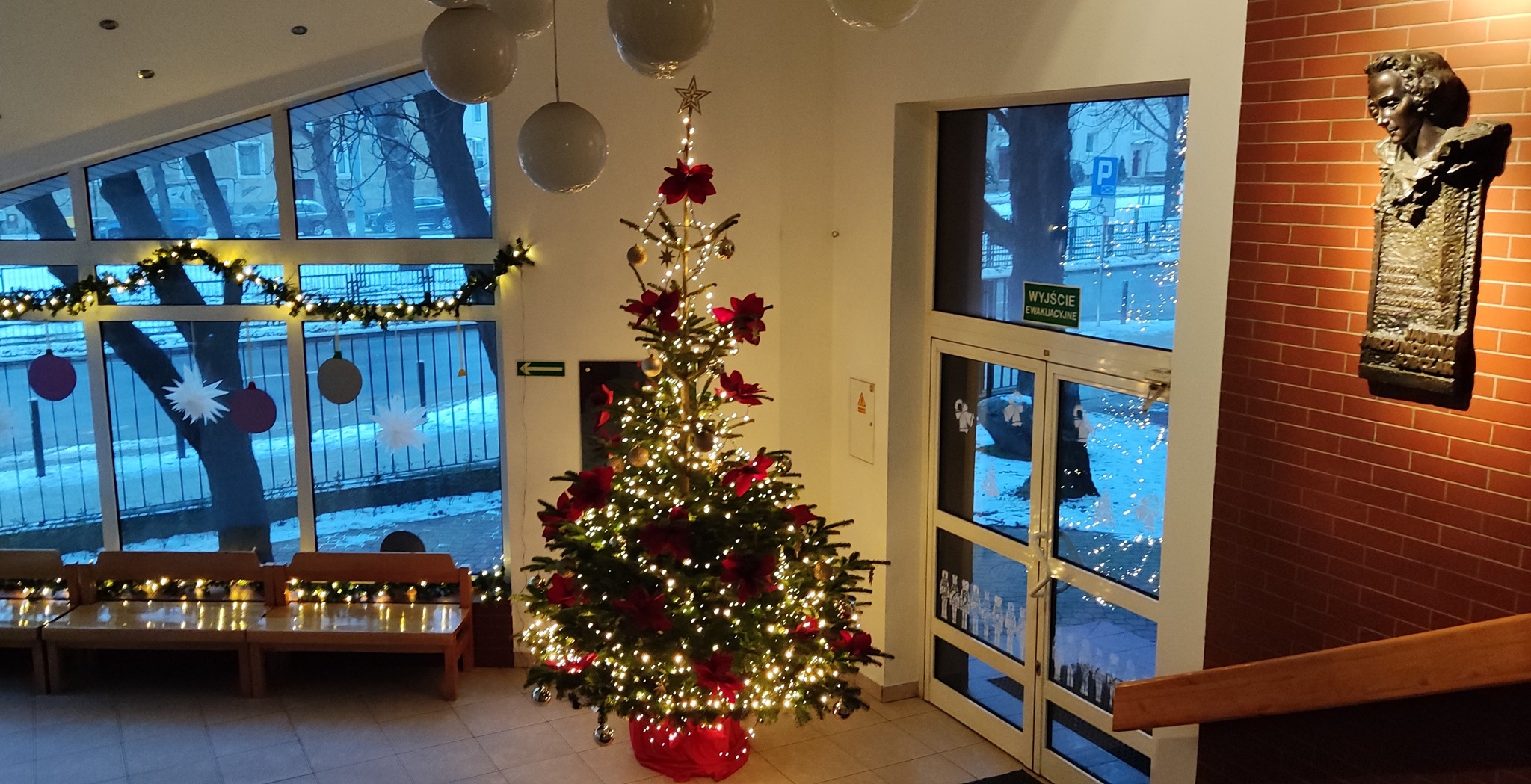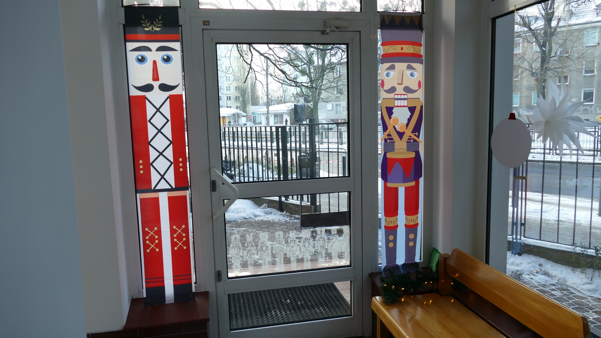 Nauczycielka plastyki, Pani Asia, przygotowała klimatyczny wystrój wejścia do szkoły i holu, w stylu - a jakżeby to inaczej - "Dziadka do orzechów". A także urocze stanowisko do zdjęć, z którego można wciąż korzystać. A już na progu szkoły, wchodzących wita rozświetlone drzewko świąteczne