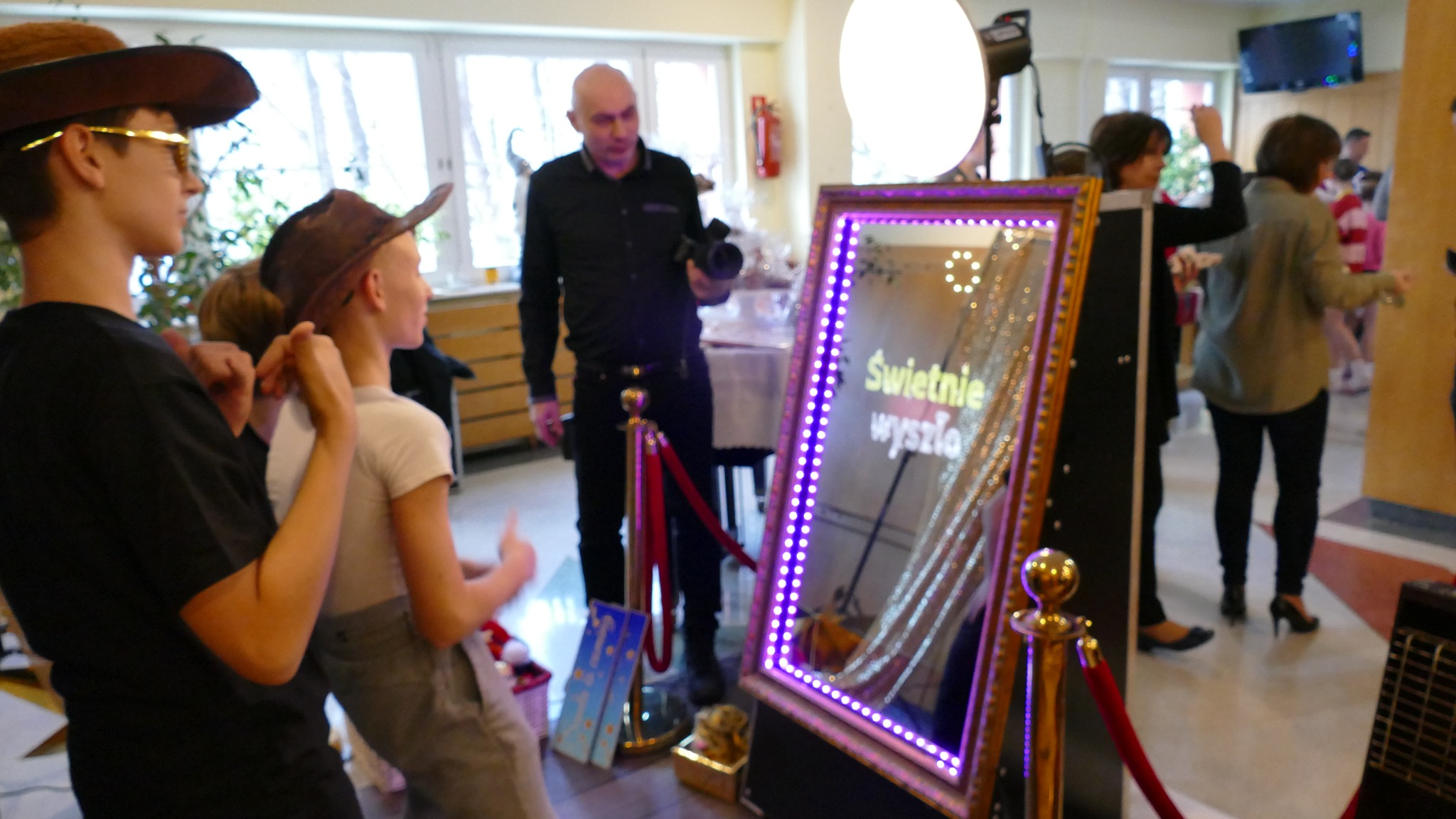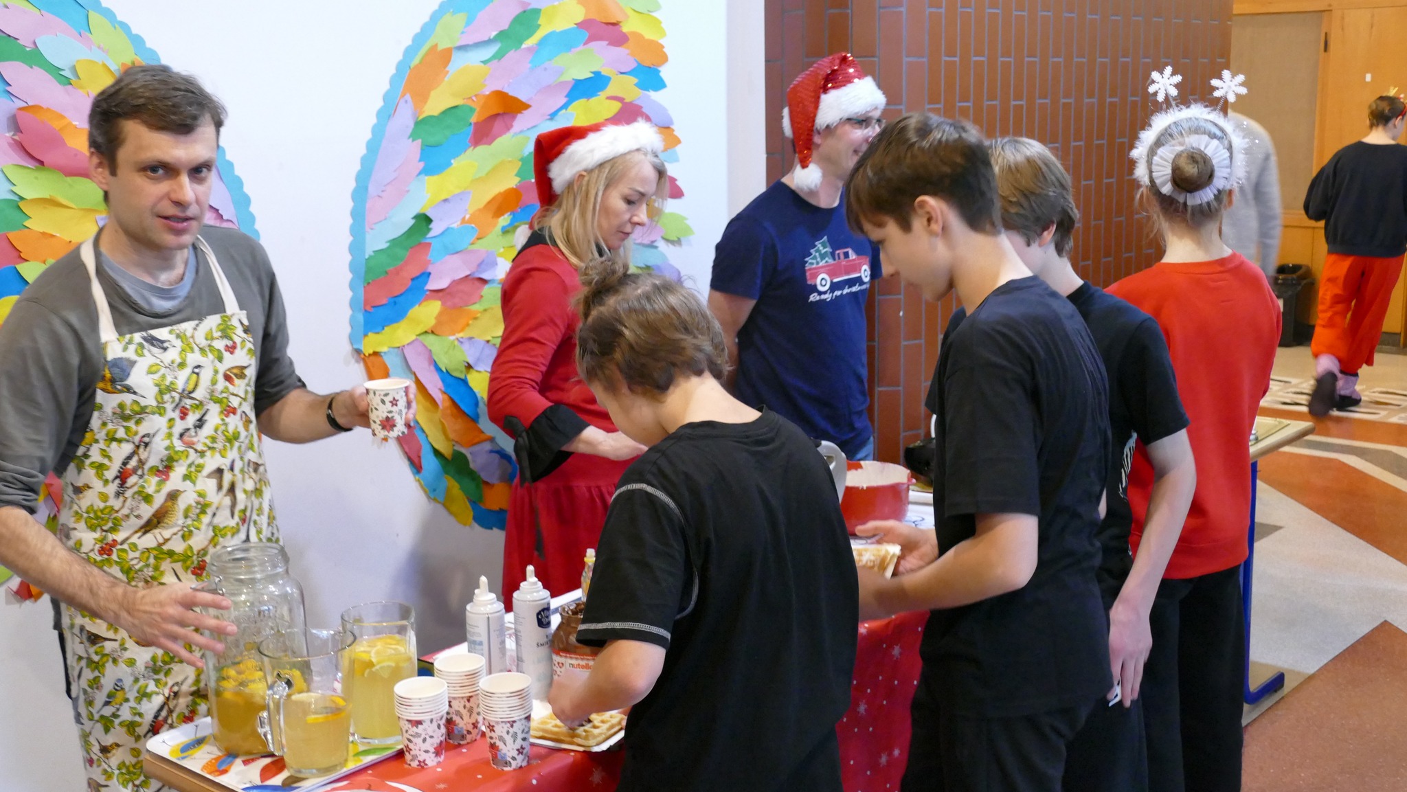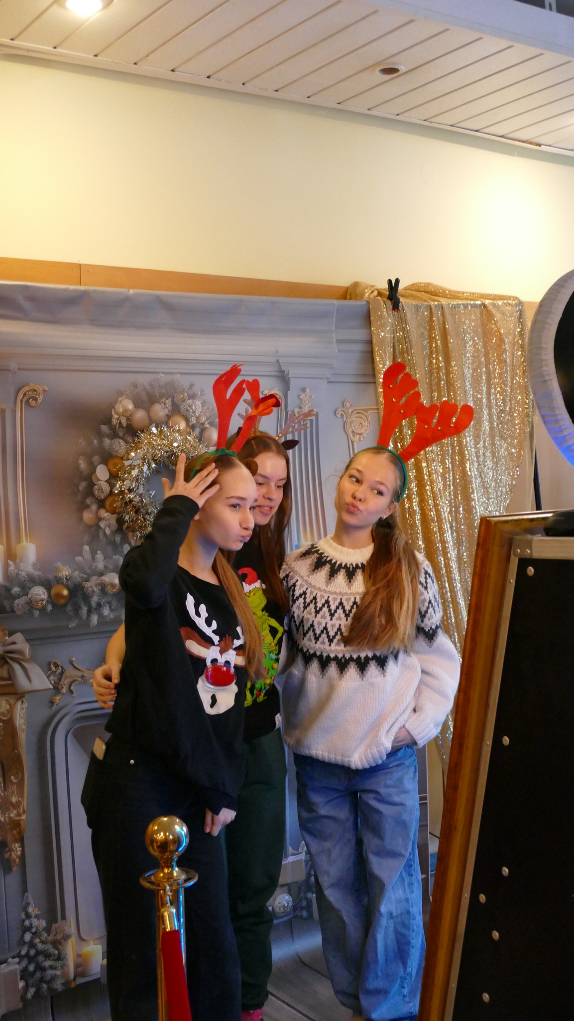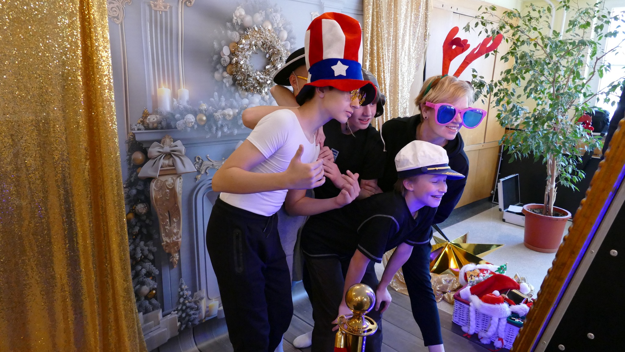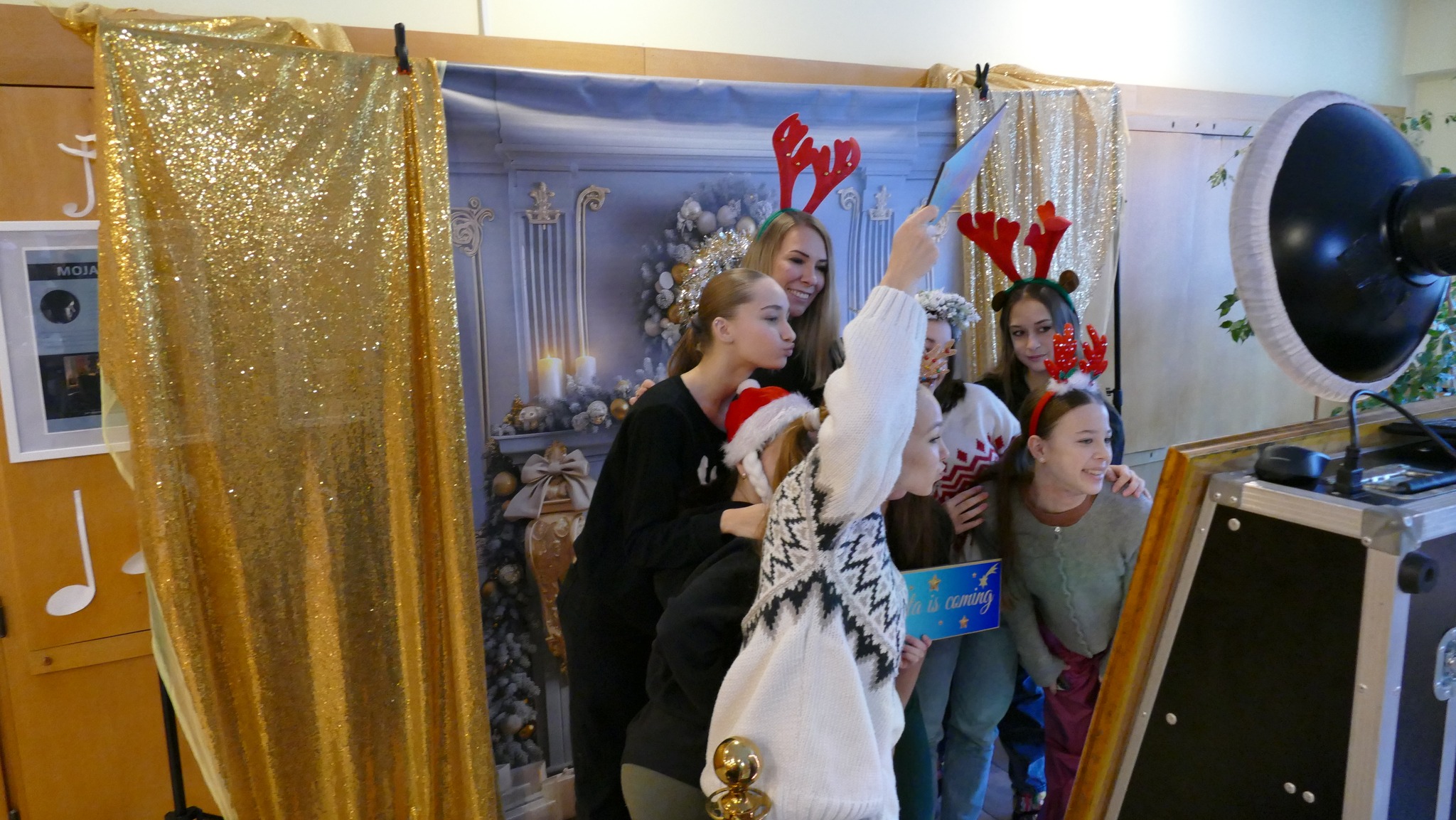 Były i stroiki świąteczne, i aniołki, i słodkości. Była nastrojowa muzyka podczas przerw przygotowana przez Panią Justynę, opiekunkę Samorządu Uczniowskiego. Było też fotolustro wraz z potrzebnymi akcesoriami: czapkami Świętego Mikołaja, opaskami z gałązkami choinki i z rogami reniferów, zabawne okulary i wiele, wiele innych...