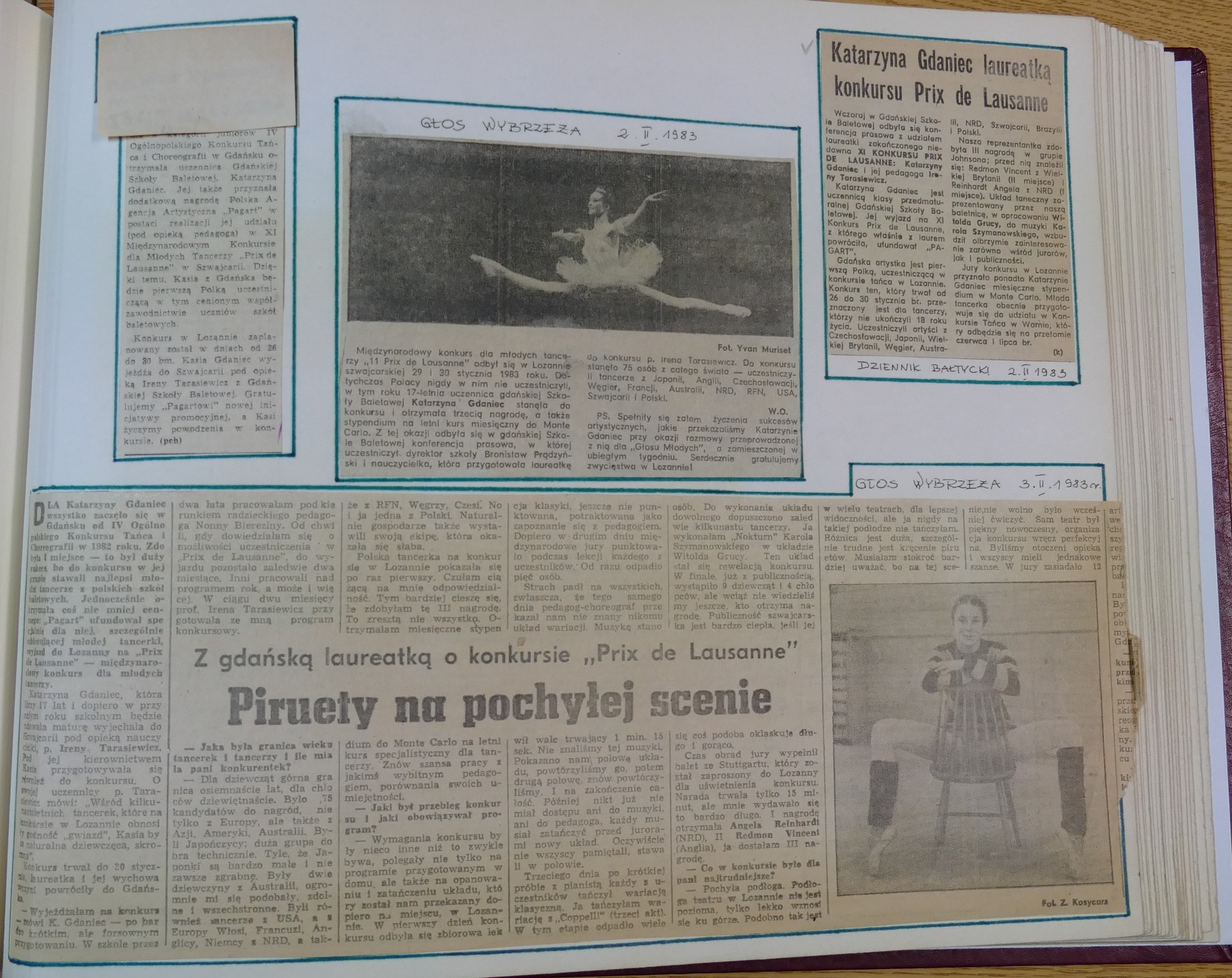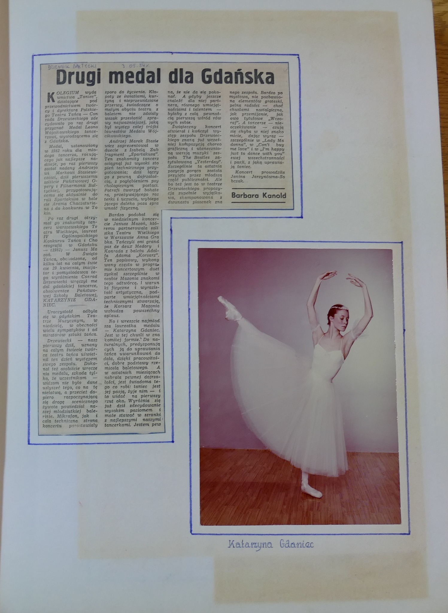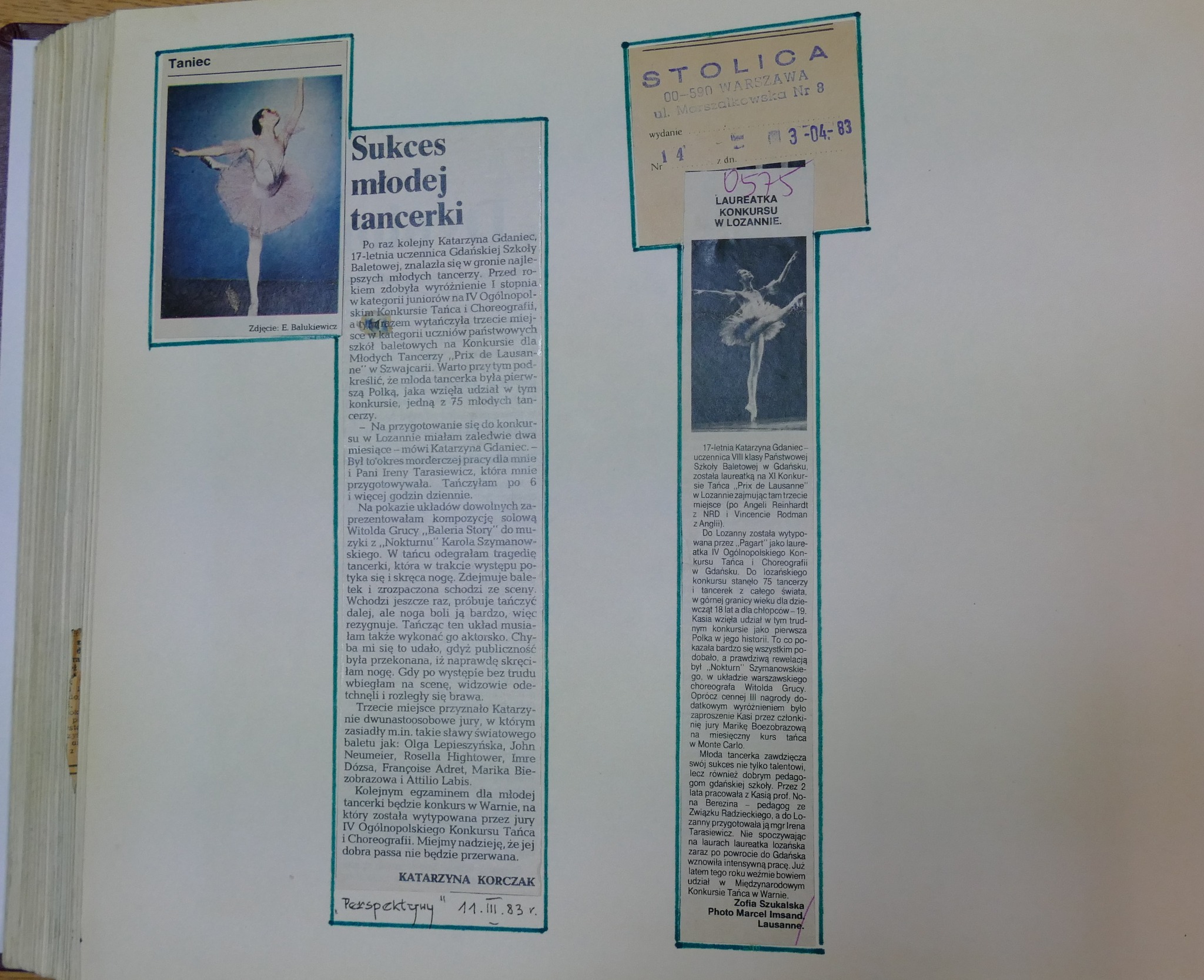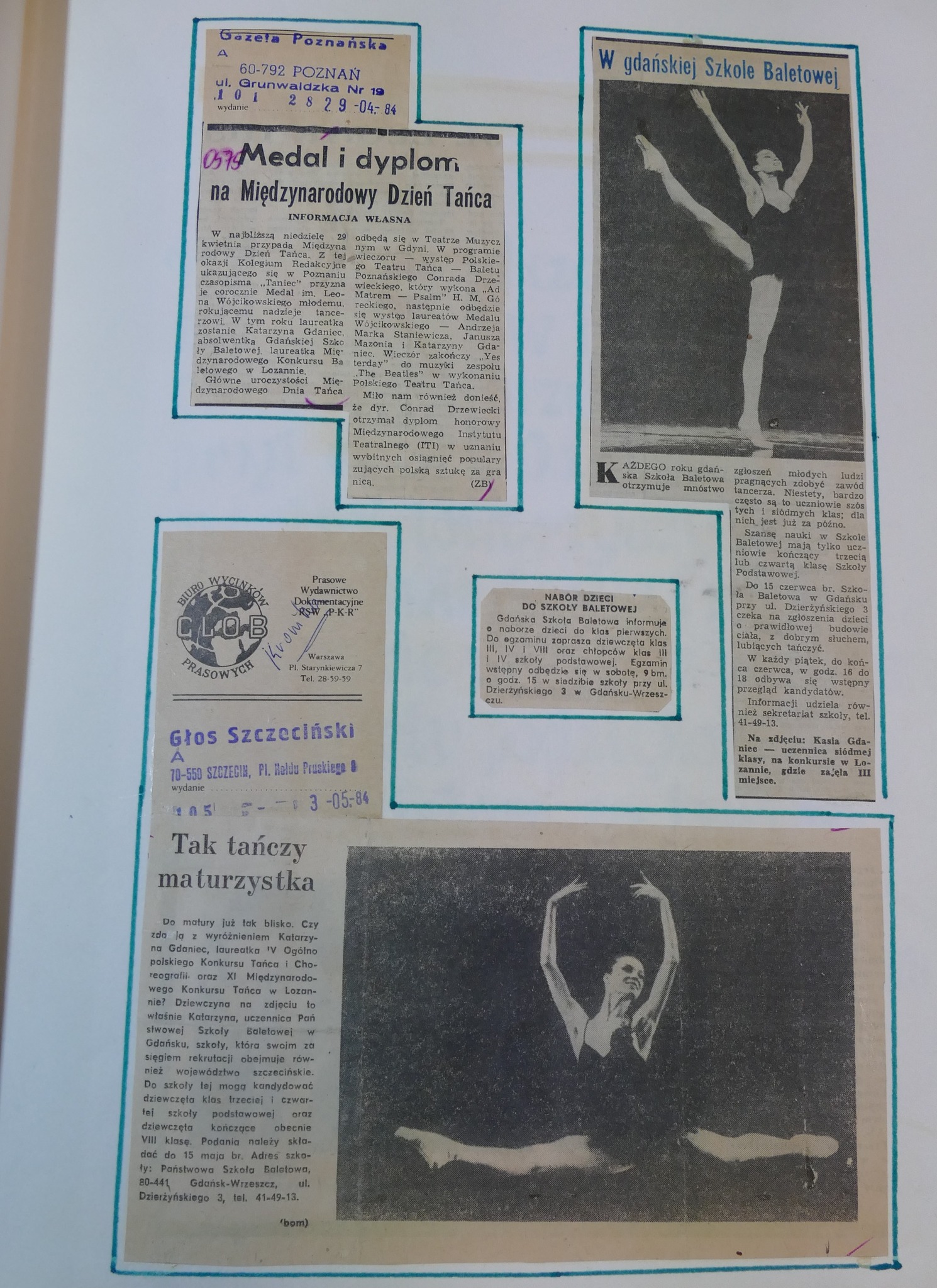 Jednak w kronikach szkolnych z tego okresu najczęściej przewija się nazwisko Katarzyny Gdaniec. Nie ma w tym nic dziwnego – pani Kasia to pierwsza Polka, która wzięła udział w XI Międzynarodowym Konkursie dla Młodych Tancerzy „Prix de Lausanne” w Szwajcarii. Tam wytańczyła III nagrodę – a muszą Państwo wiedzieć, że to szalenie trudny konkurs. Katarzyna Gdaniec zdobyła tam także stypendium: letni kurs w Monte Carlo, w szkole Mariki Bezobrazowej. To ogromny międzynarodowy sukces. Ponadto Pani Kasia jako uczennica VII klasy zdobyła I wyróżnienie IV Ogólnopolskiego Konkursu Tańca i Choreografii oraz nagrodę specjalną (wspomniany wyjazd do Lozanny). W 1984 wyróżniono Ją Medalem im. L. Wójcikowskiego dla najwybitniejszego młodego tancerza. O tych sukcesach pisano w gazetach. A my w kronikach mamy zachowane wycinki – zapraszamy do galerii.