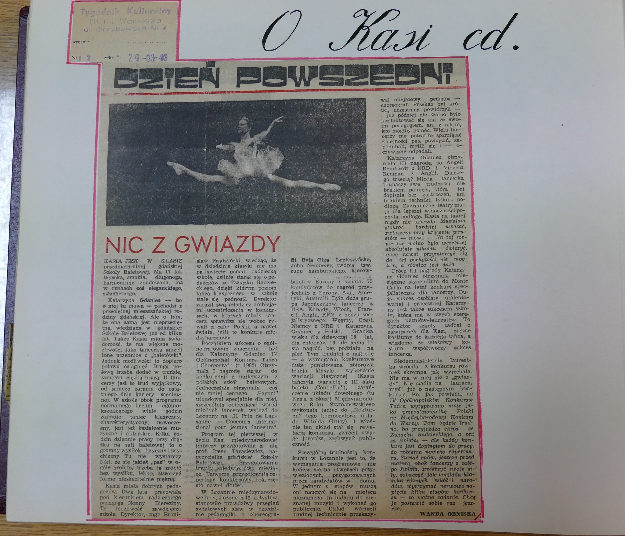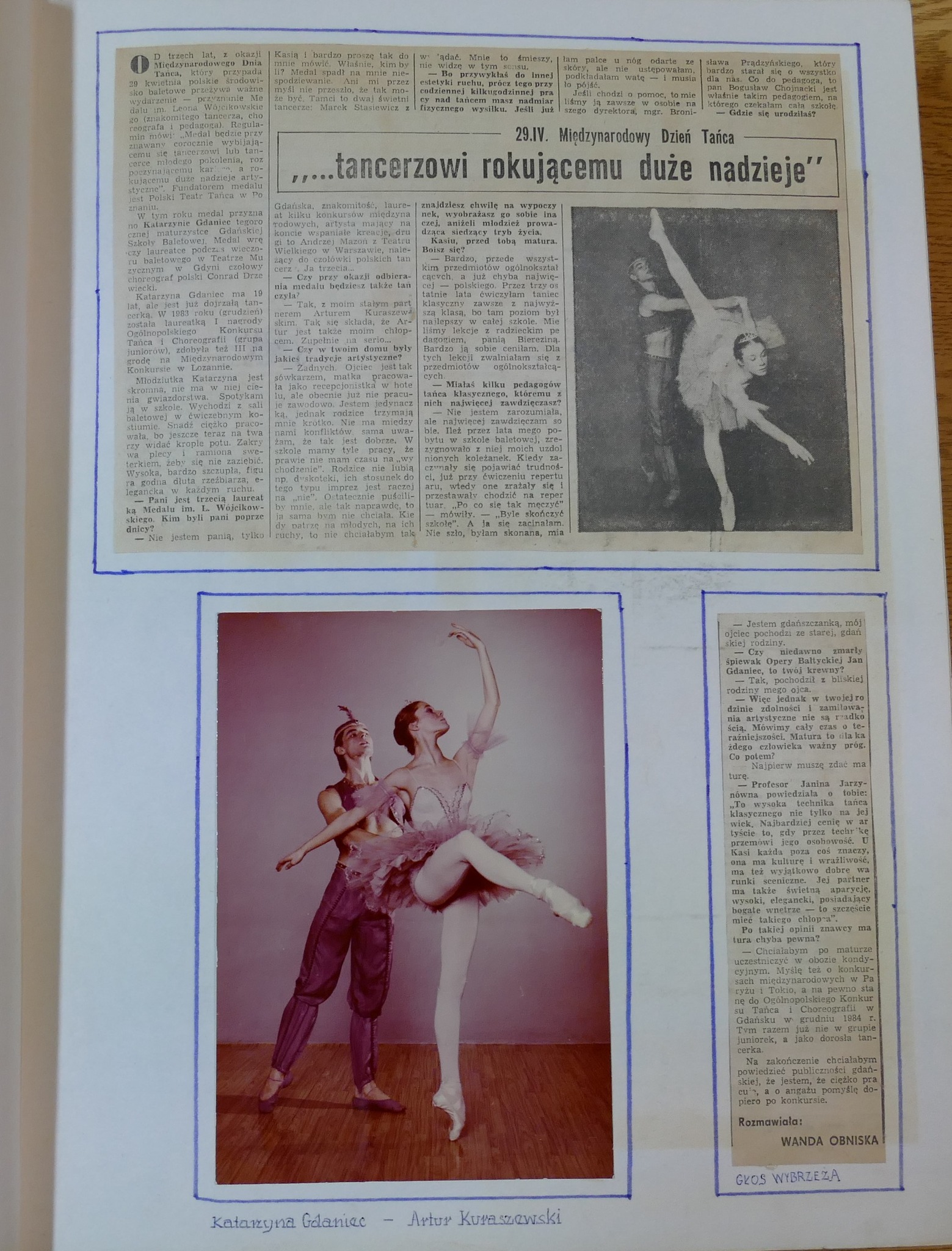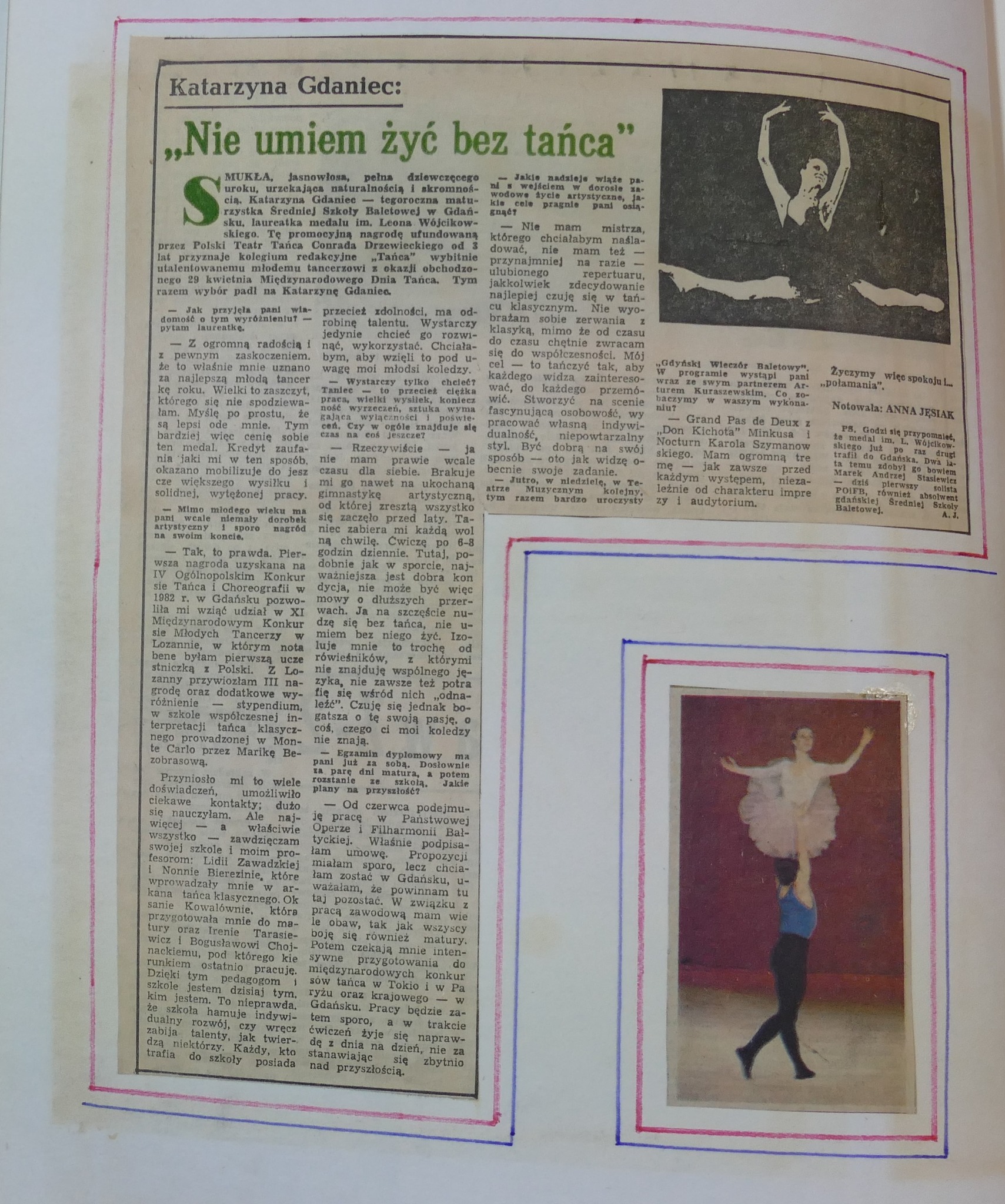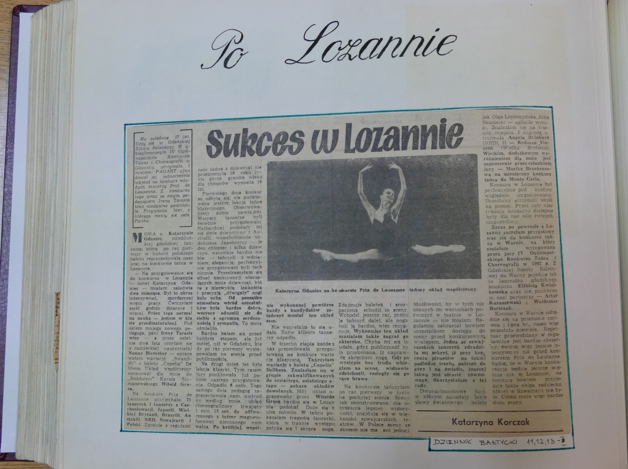 Jednak w kronikach szkolnych z tego okresu najczęściej przewija się nazwisko Katarzyny Gdaniec. Nie ma w tym nic dziwnego – pani Kasia to pierwsza Polka, która wzięła udział w XI Międzynarodowym Konkursie dla Młodych Tancerzy „Prix de Lausanne” w Szwajcarii. Tam wytańczyła III nagrodę – a muszą Państwo wiedzieć, że to szalenie trudny konkurs. Katarzyna Gdaniec zdobyła tam także stypendium: letni kurs w Monte Carlo, w szkole Mariki Bezobrazowej. To ogromny międzynarodowy sukces. Ponadto Pani Kasia jako uczennica VII klasy zdobyła I wyróżnienie IV Ogólnopolskiego Konkursu Tańca i Choreografii oraz nagrodę specjalną (wspomniany wyjazd do Lozanny). W 1984 wyróżniono Ją Medalem im. L. Wójcikowskiego dla najwybitniejszego młodego tancerza. O tych sukcesach pisano w gazetach. A my w kronikach mamy zachowane wycinki – zapraszamy do galerii.