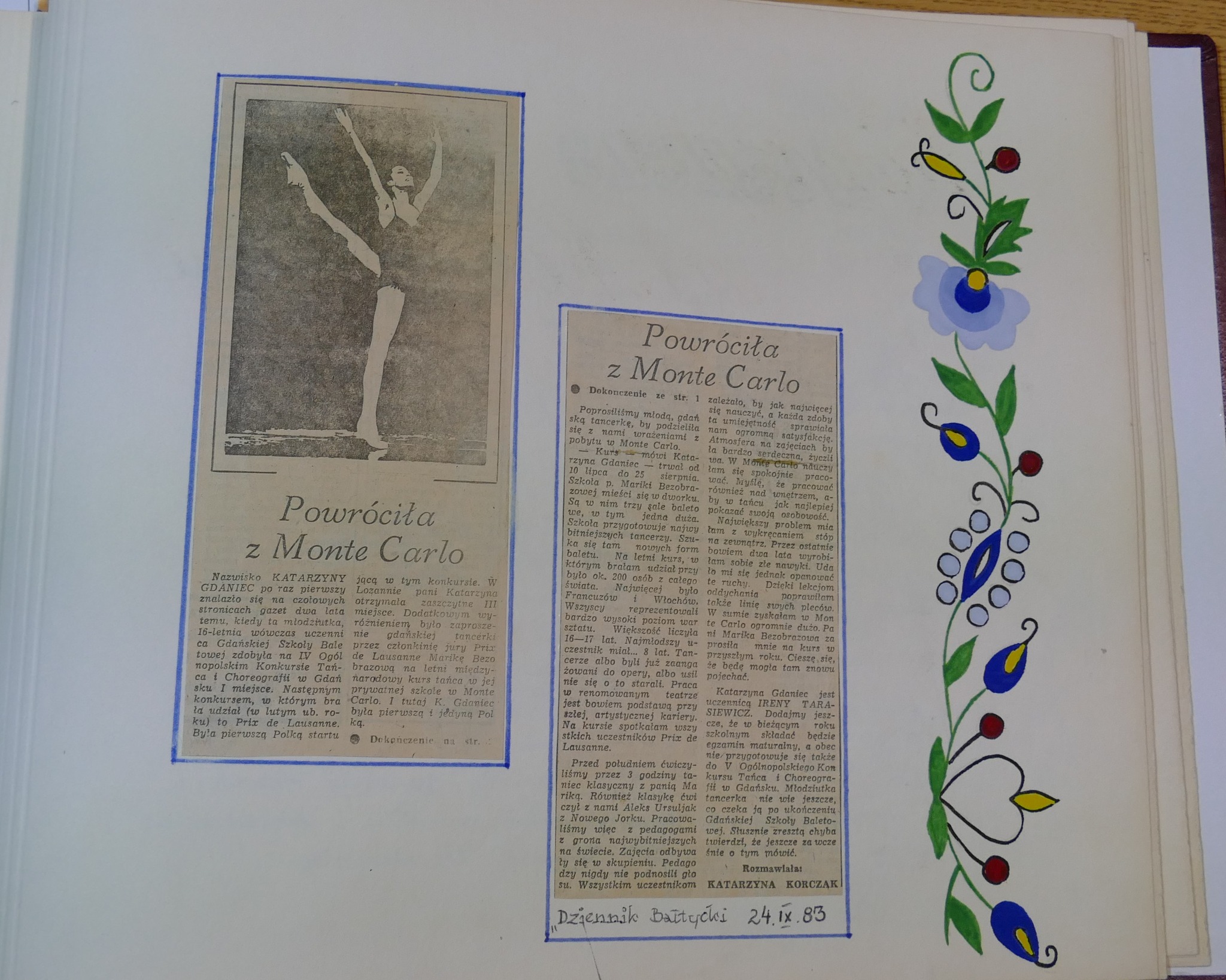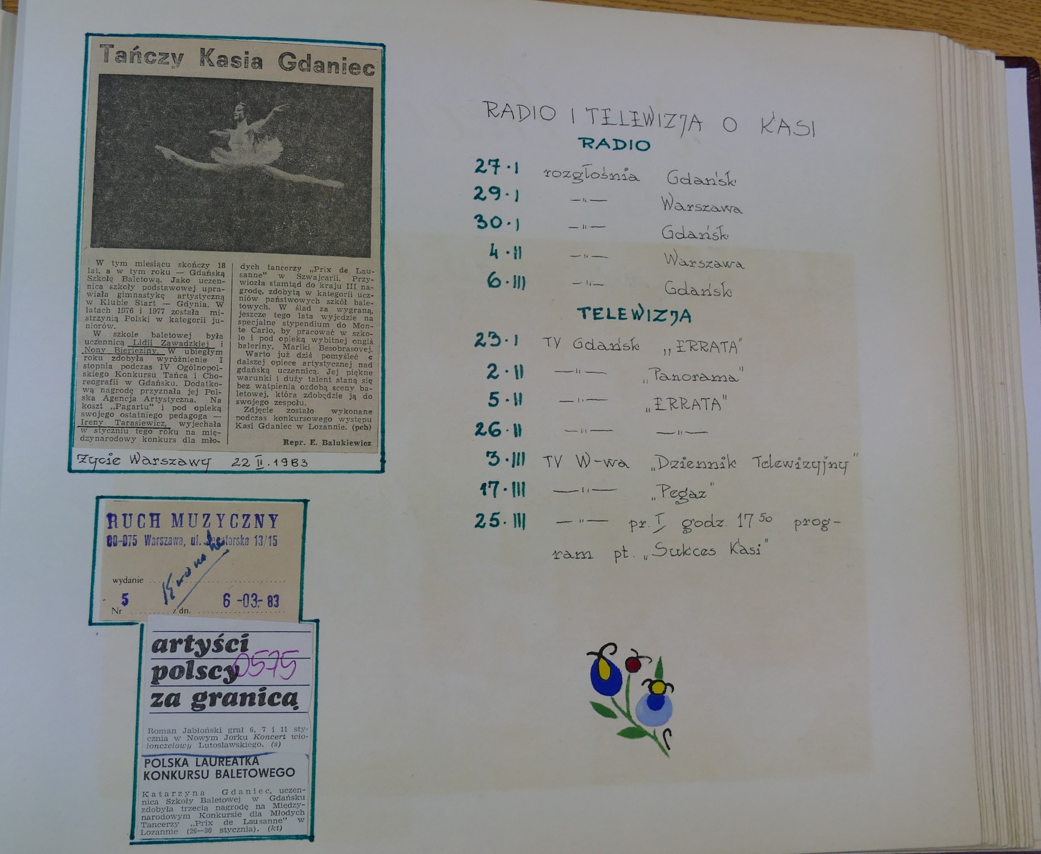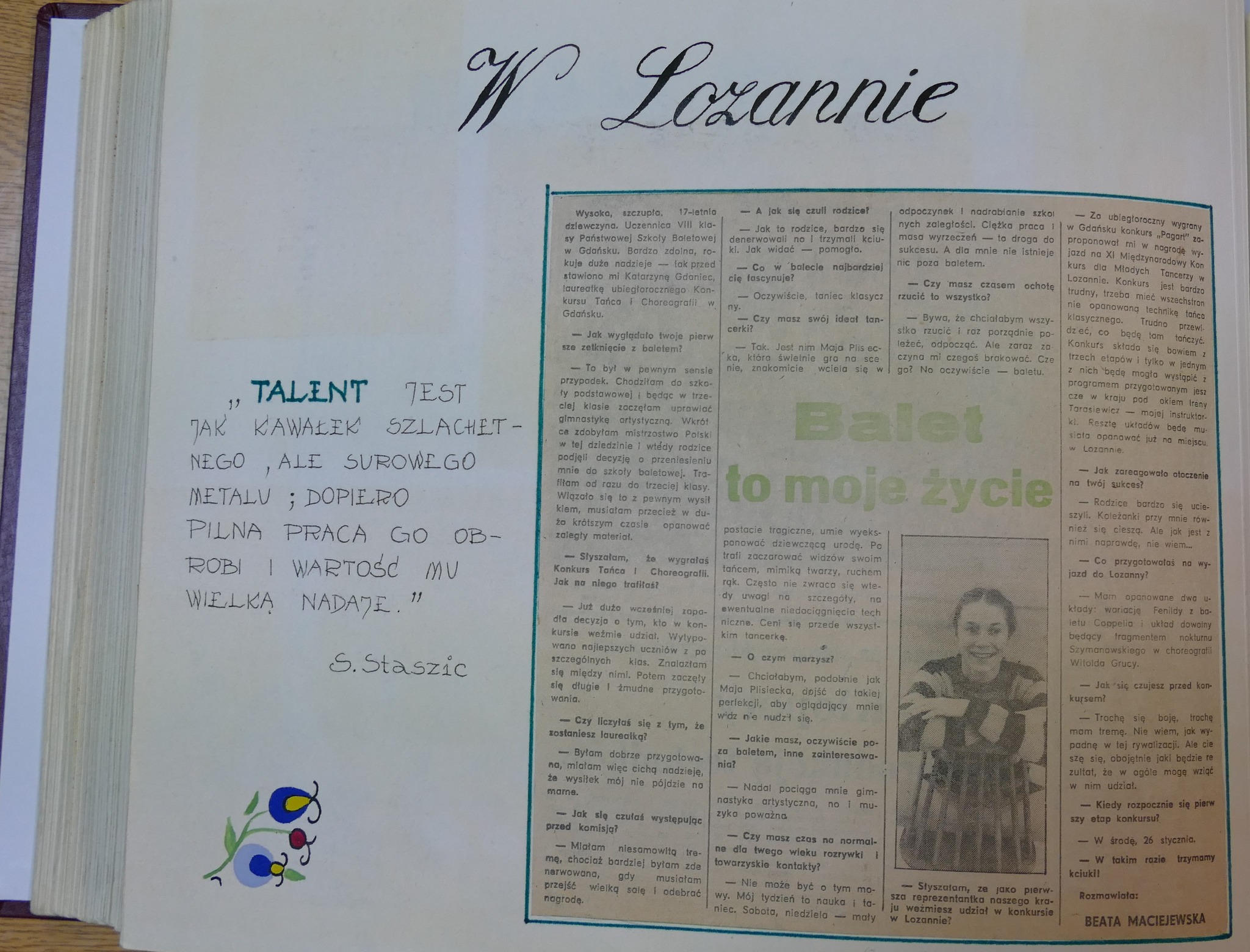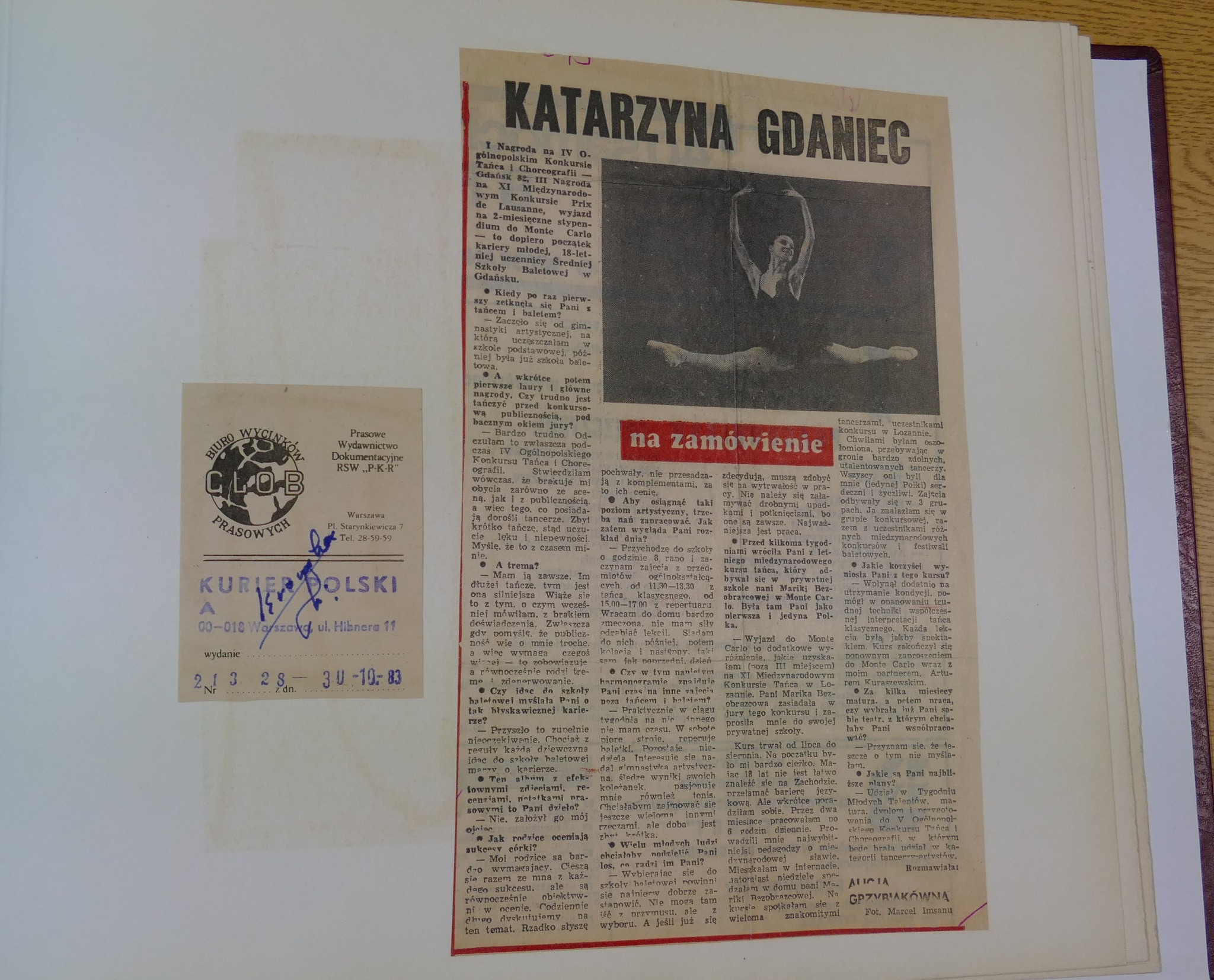Jednak w kronikach szkolnych z tego okresu najczęściej przewija się nazwisko Katarzyny Gdaniec. Nie ma w tym nic dziwnego – pani Kasia to pierwsza Polka, która wzięła udział w XI Międzynarodowym Konkursie dla Młodych Tancerzy „Prix de Lausanne” w Szwajcarii. Tam wytańczyła III nagrodę – a muszą Państwo wiedzieć, że to szalenie trudny konkurs. Katarzyna Gdaniec zdobyła tam także stypendium: letni kurs w Monte Carlo, w szkole Mariki Bezobrazowej. To ogromny międzynarodowy sukces. Ponadto Pani Kasia jako uczennica VII klasy zdobyła I wyróżnienie IV Ogólnopolskiego Konkursu Tańca i Choreografii oraz nagrodę specjalną (wspomniany wyjazd do Lozanny). W 1984 wyróżniono Ją Medalem im. L. Wójcikowskiego dla najwybitniejszego młodego tancerza. O tych sukcesach pisano w gazetach. A my w kronikach mamy zachowane wycinki – zapraszamy do galerii.