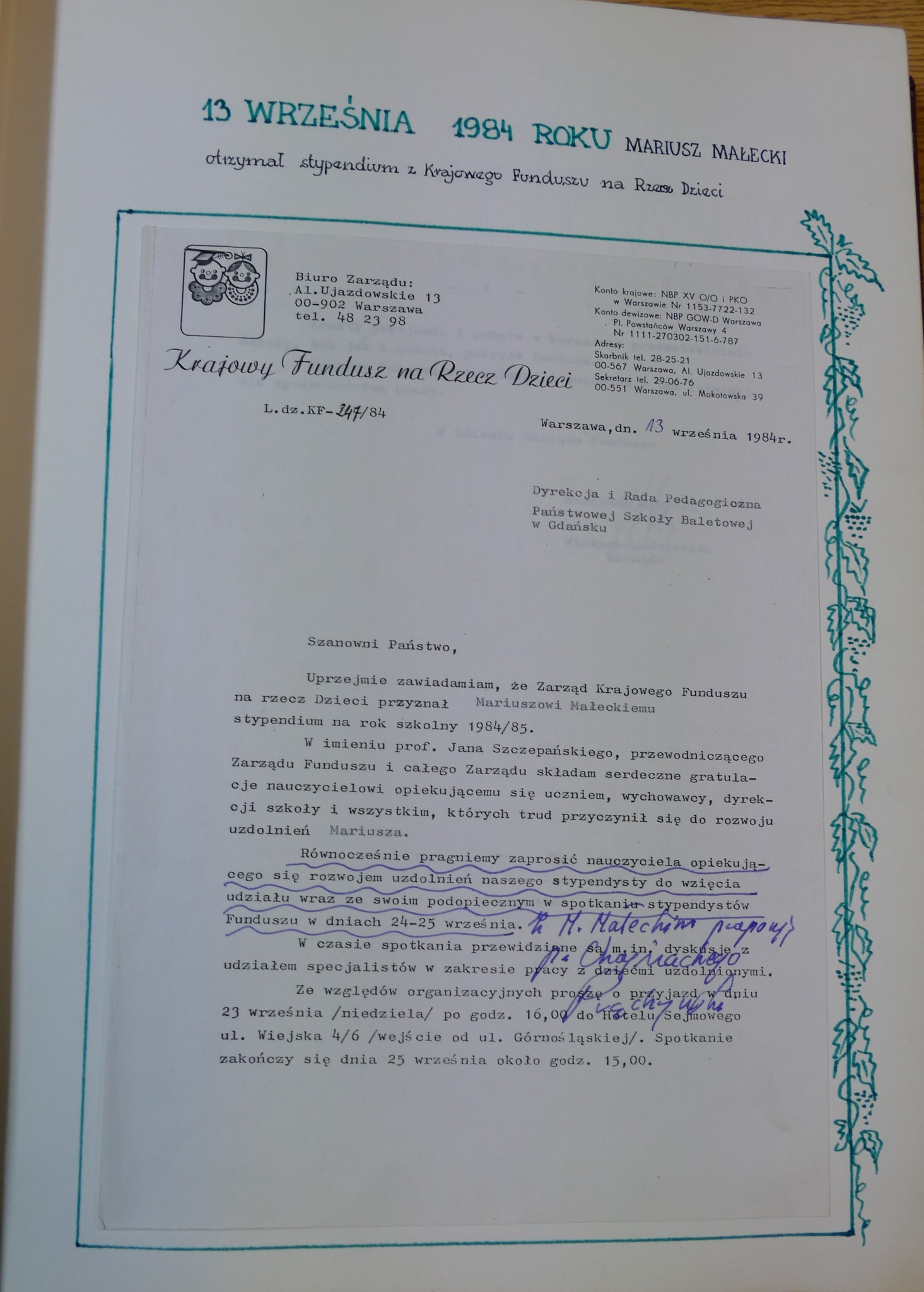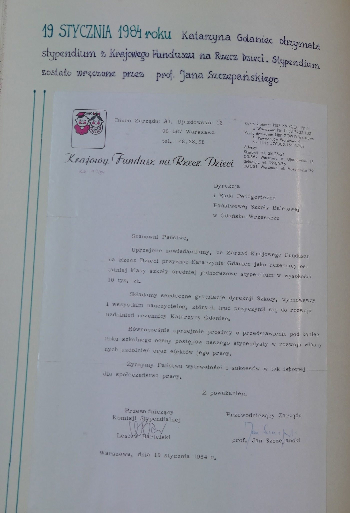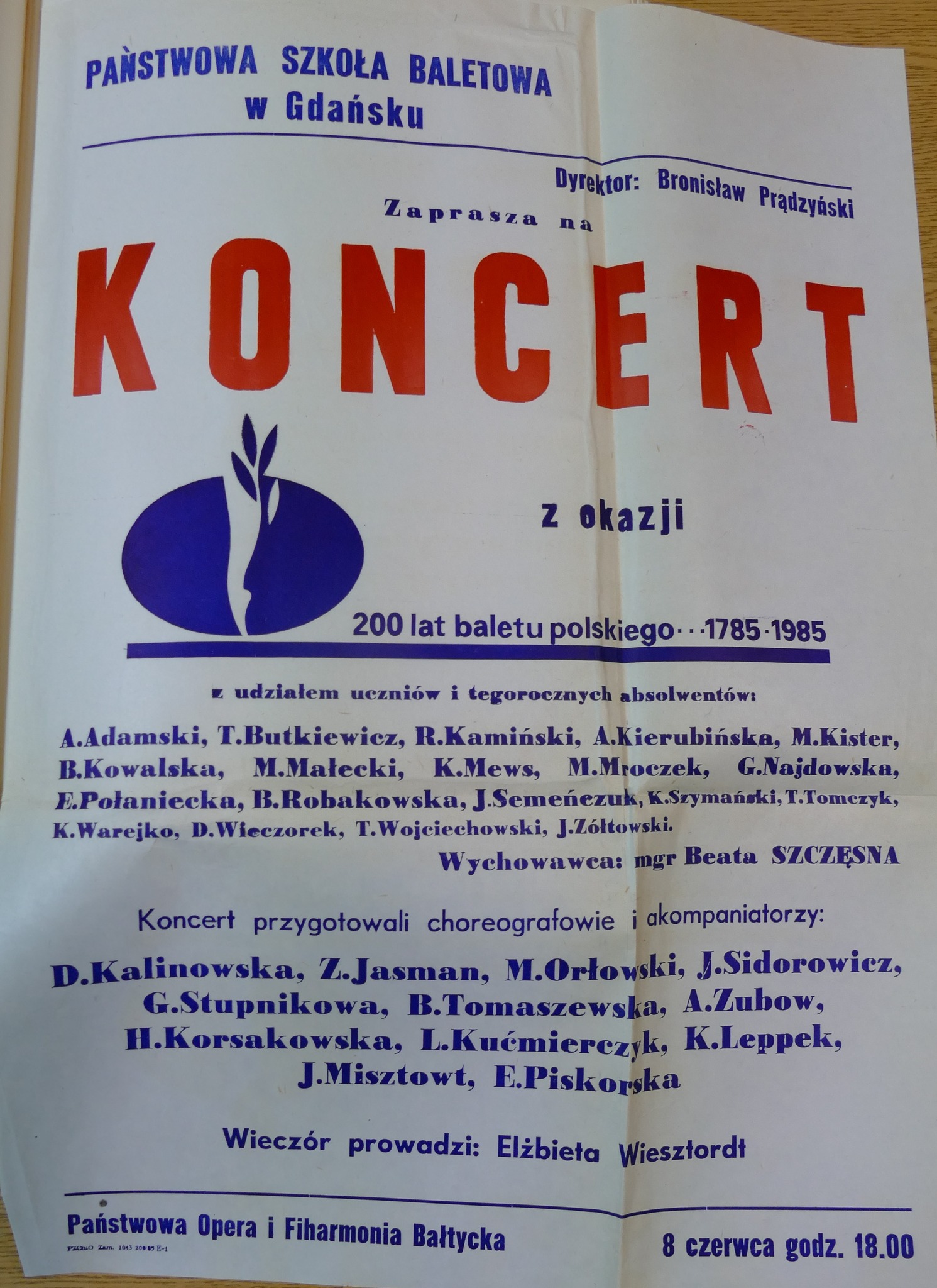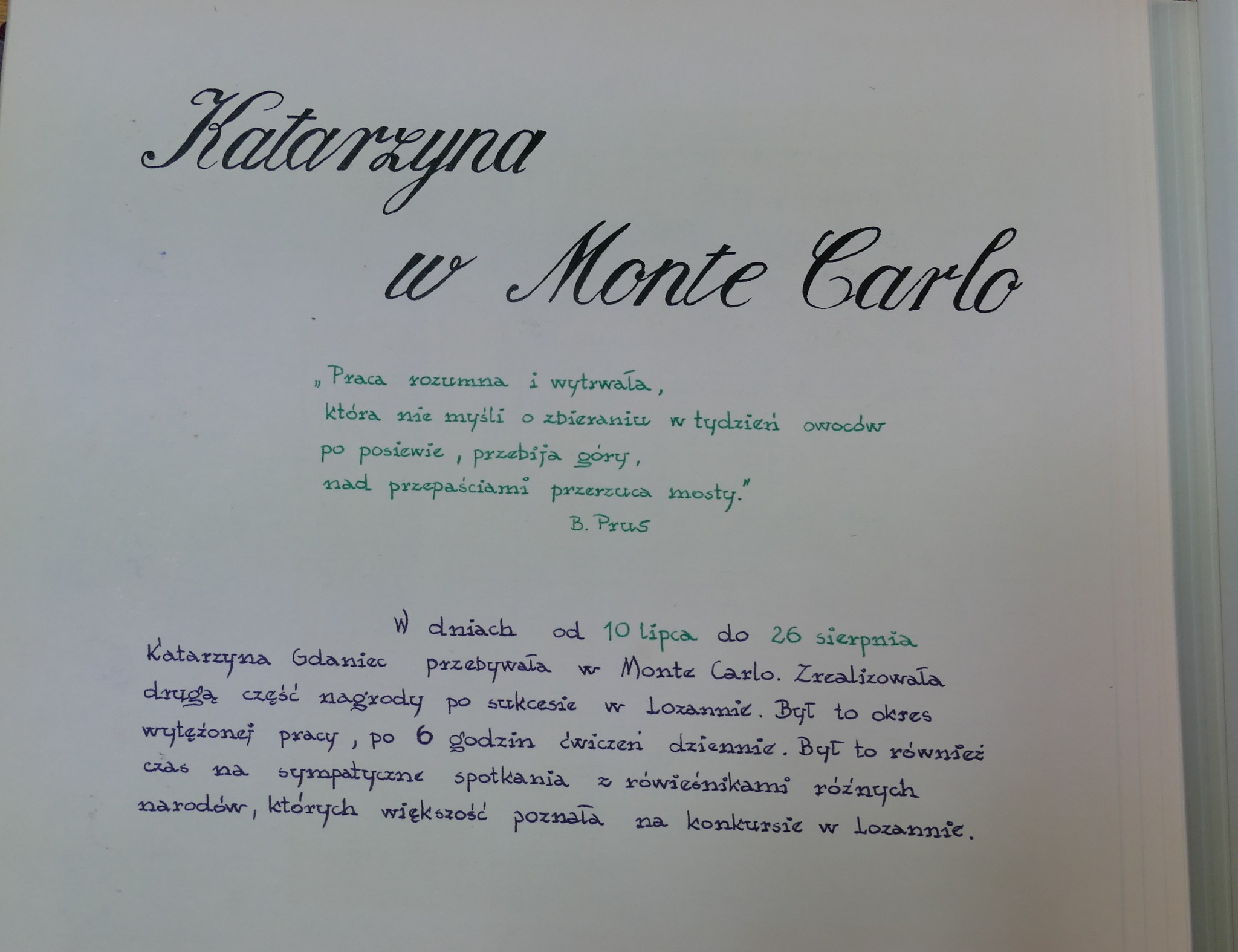 Jednak w kronikach szkolnych z tego okresu najczęściej przewija się nazwisko Katarzyny Gdaniec. Nie ma w tym nic dziwnego – pani Kasia to pierwsza Polka, która wzięła udział w XI Międzynarodowym Konkursie dla Młodych Tancerzy „Prix de Lausanne” w Szwajcarii. Tam wytańczyła III nagrodę – a muszą Państwo wiedzieć, że to szalenie trudny konkurs. Katarzyna Gdaniec zdobyła tam także stypendium: letni kurs w Monte Carlo, w szkole Mariki Bezobrazowej. To ogromny międzynarodowy sukces. Ponadto Pani Kasia jako uczennica VII klasy zdobyła I wyróżnienie IV Ogólnopolskiego Konkursu Tańca i Choreografii oraz nagrodę specjalną (wspomniany wyjazd do Lozanny). W 1984 wyróżniono Ją Medalem im. L. Wójcikowskiego dla najwybitniejszego młodego tancerza. O tych sukcesach pisano w gazetach. A my w kronikach mamy zachowane wycinki – zapraszamy do galerii.