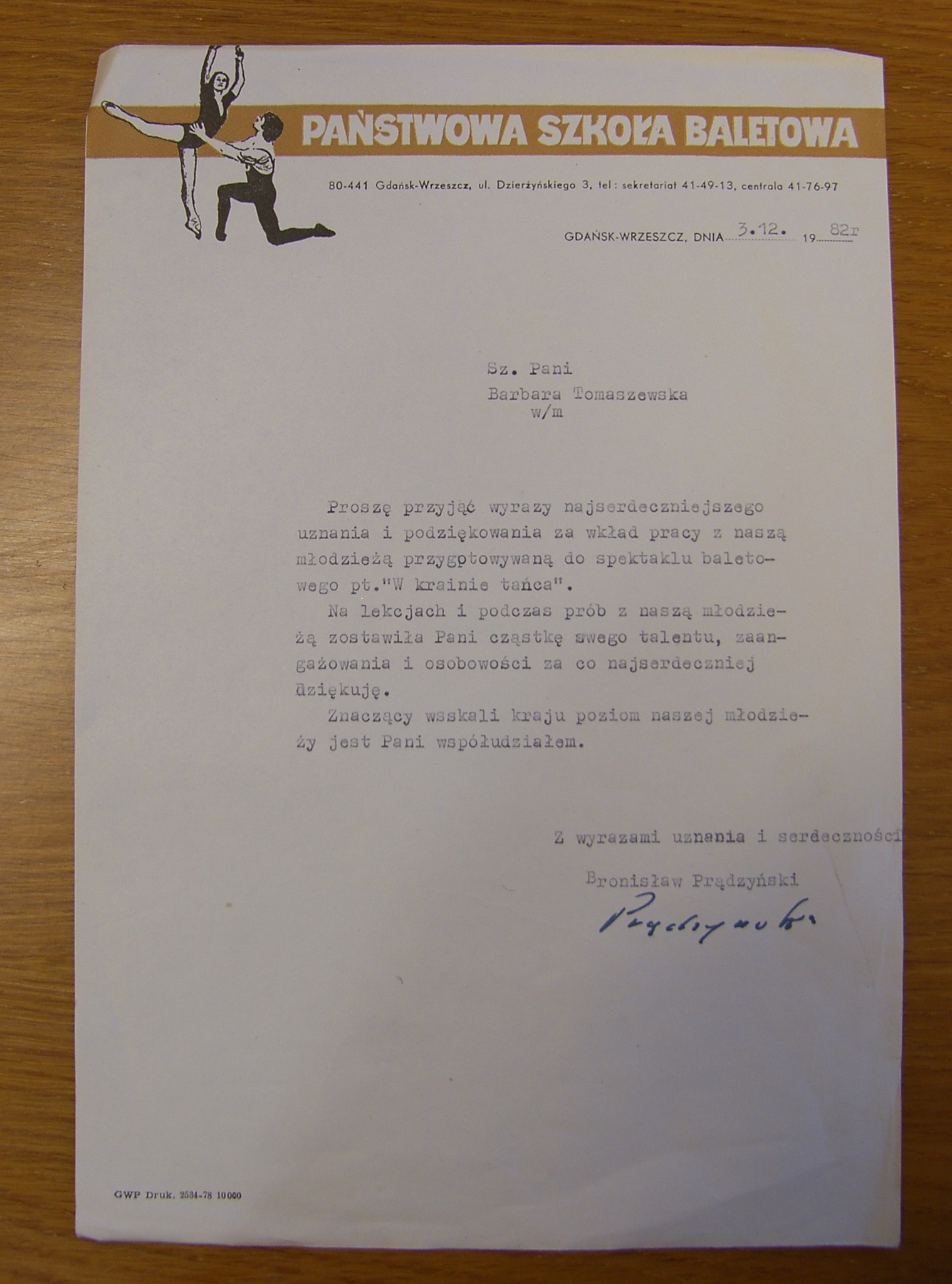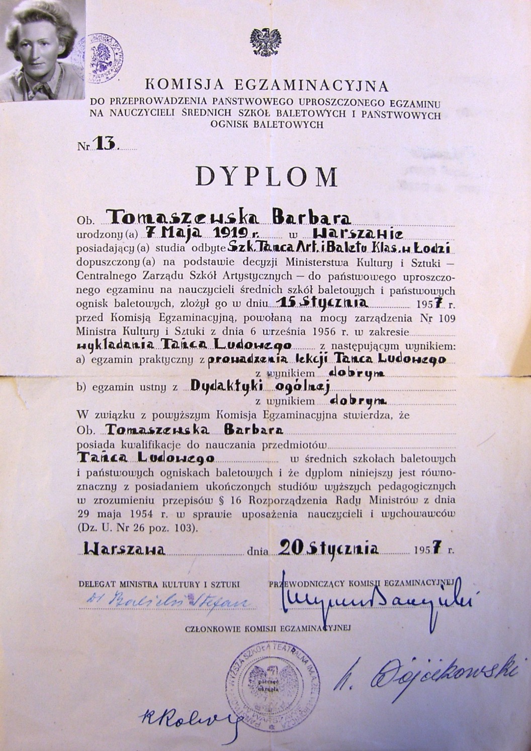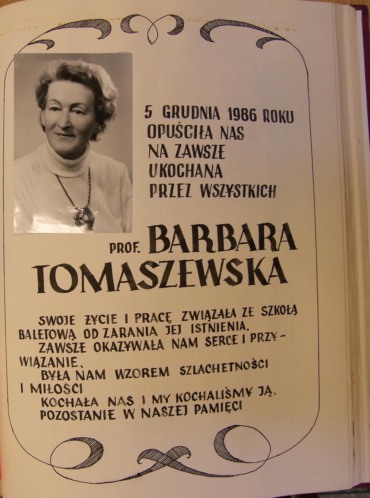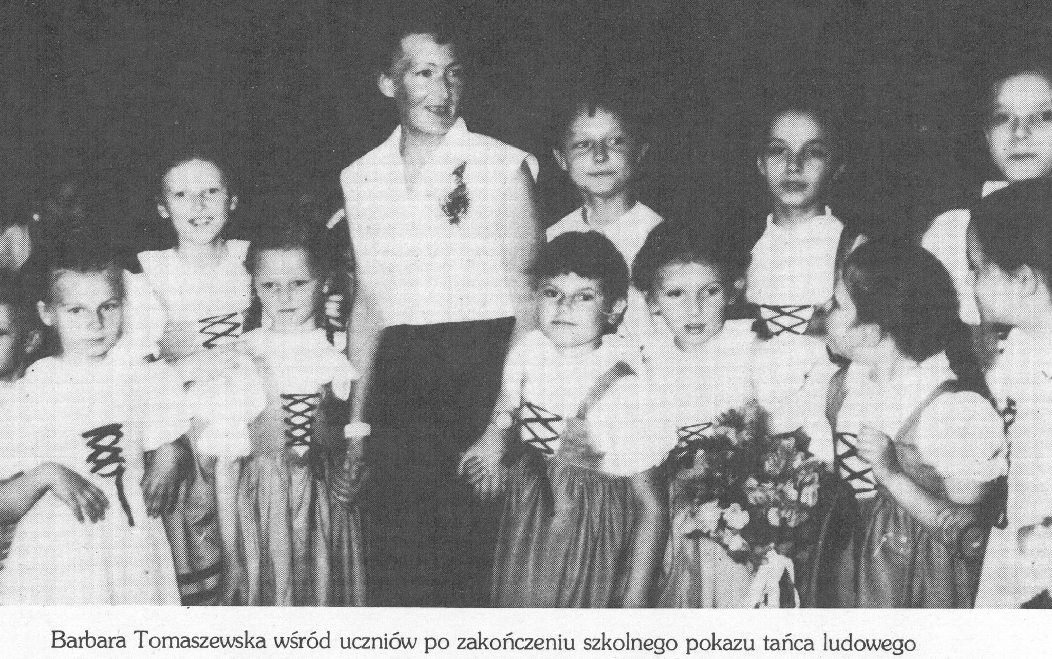 W publikacji przygotowanej na 35-lecie istnienia szkoły, Janina Jarzynówna-Sobczak wspomina pedagogów, którzy współpracowali z Nią w pierwszych latach istnienia szkoły: „Nieco później dołączyła do nas Barbara Tomaszewska, wykładowczyni tańca ludowego, wszechstronnie znająca swój przedmiot, poszukująca w polskim folklorze coraz to nowych wartości”.
