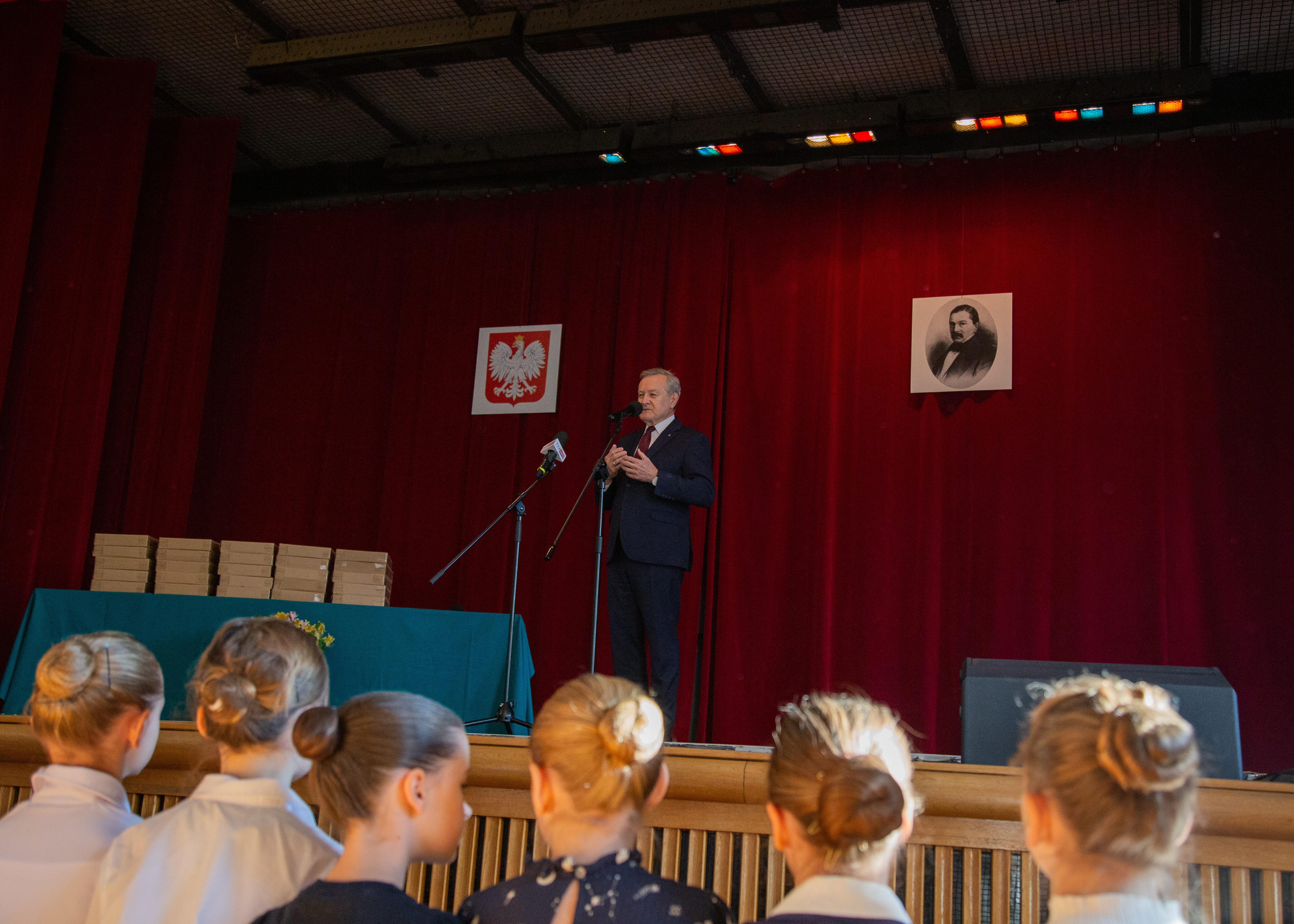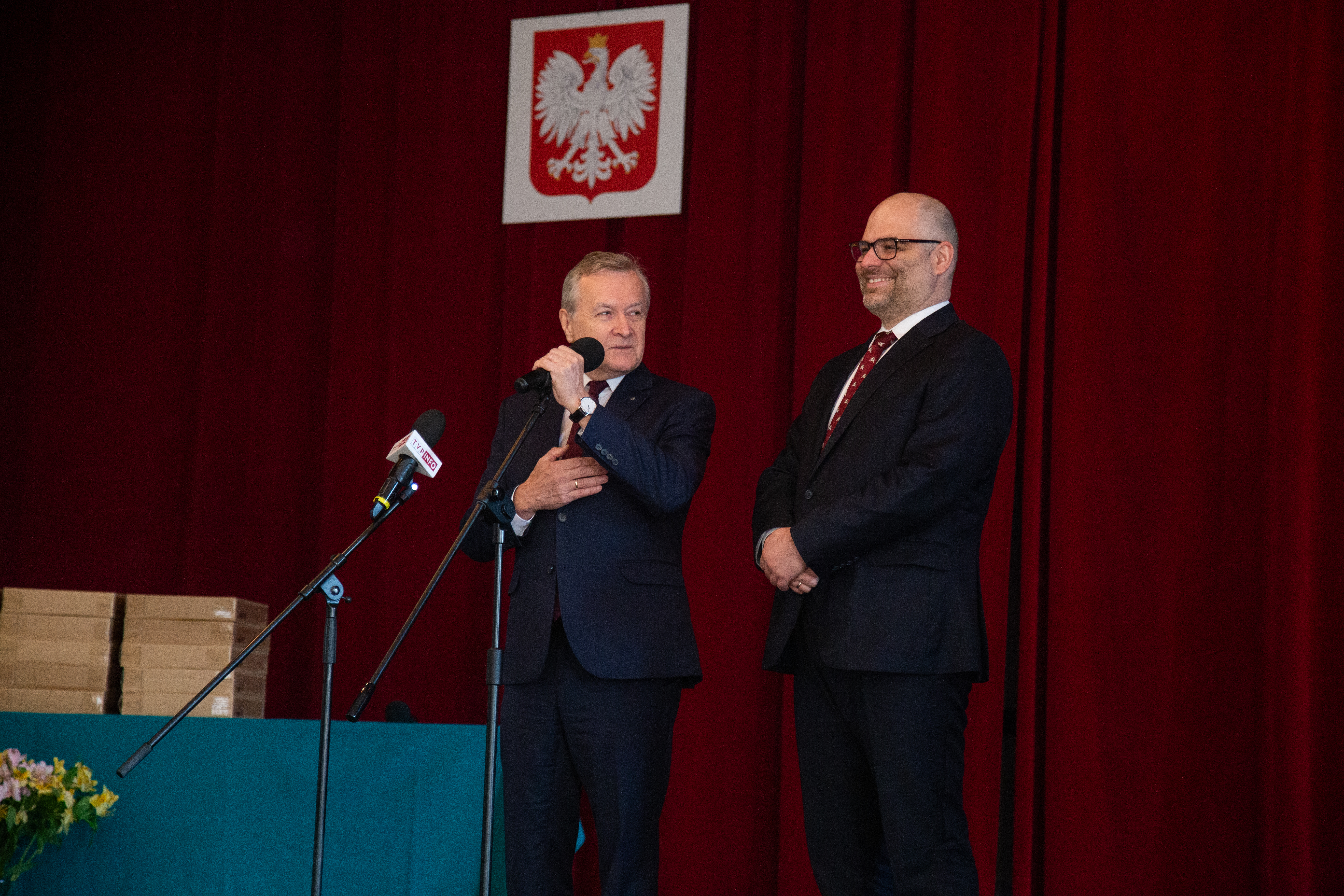 „Życzę wszystkim uczniom, żebyście mieli marzenia i wiedzieli, jak je spełnić. Korzystając z nowych technologii – komputerów czy laptopów – zawsze pamiętajcie o tym, że prawdziwe życie toczy się poza rzeczywistością cyfrową. Ona jedynie pomaga w funkcjonowaniu w rzeczywistości realnej” – powiedział minister kultury i dziedzictwa kulturowego prof. Piotr Gliński podczas uroczystego przekazania laptopów uczniom kl. I naszej szkoły w ramach programu „Laptop dla ucznia”.