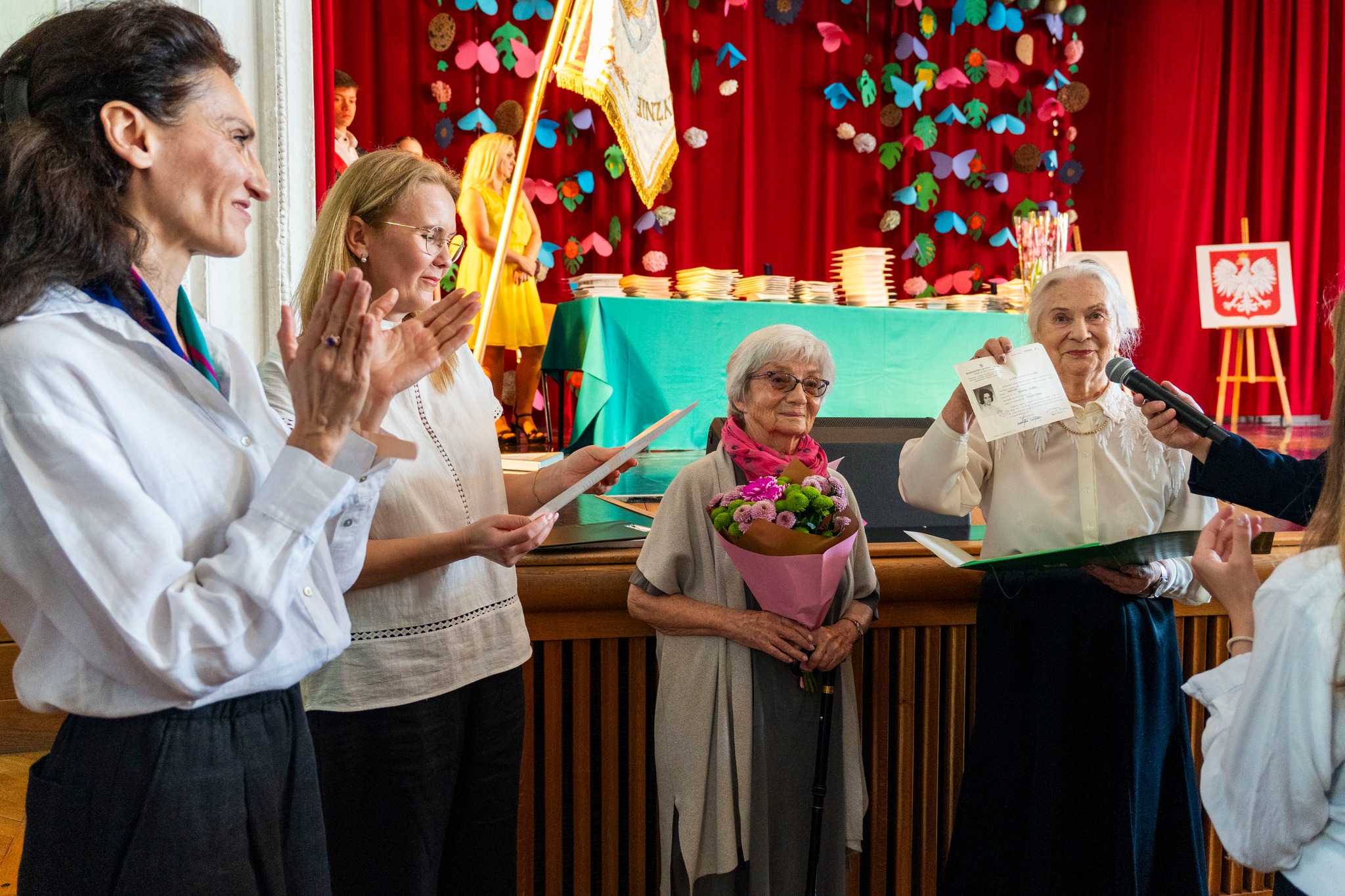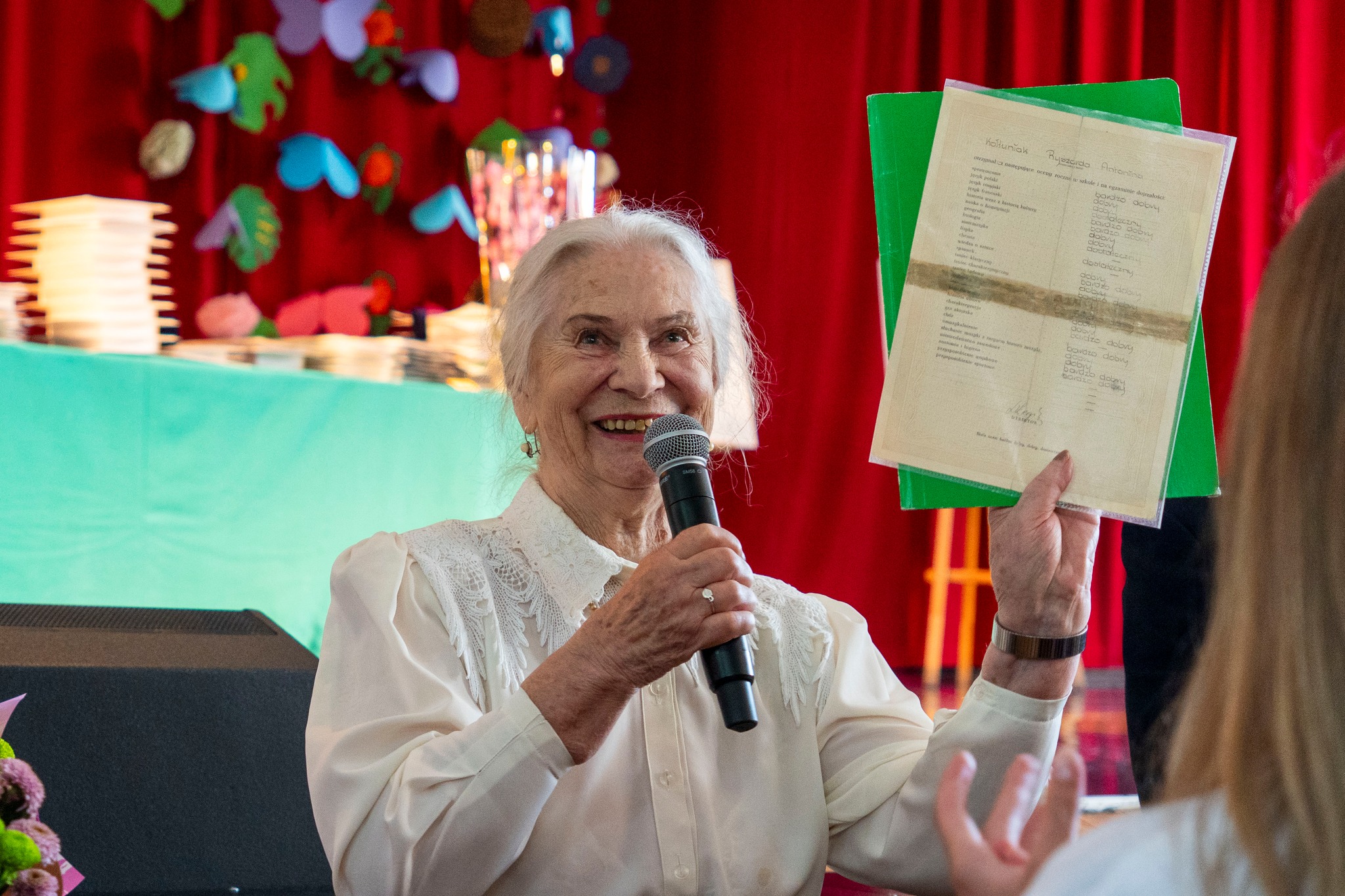 W części oficjalnej uroczystego zakończenia roku szkolnego 2024/2025 mieliśmy zaszczyt gościć Panią Ryszardę Gozdowską, pierwszą powojenną absolwentkę naszej szkoły, która przekazała na pamiątkę szkole swoje świadectwo maturalne.