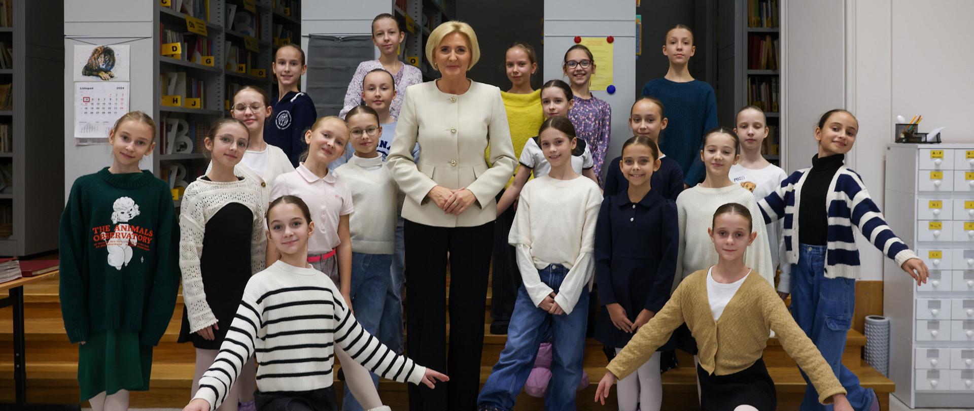 Wizytę Małżonki Prezydenta RP, Pani Agaty Kornhauser-Dudy, rozpoczęła próba tańca przed zbliżającą się premierą spektaklu „Kopciuszek”. Pierwsza Dama odwiedziła także sale, w których odbywa się nauka różnych technik tanecznych. W szkolnej bibliotece zaś uczestniczyła w zajęciach rękodzielnictwa. Z uczennicami drugiej klasy naszej szkoły Pani Prezydentowa rozmawiała o wartościach płynących z czytania książek, także tych, które znajdują się poza kanonem lektur.
