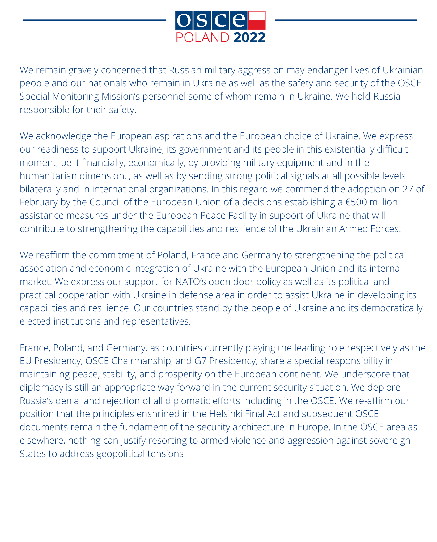 “The crisis triggered by Russia’s actions against Ukraine is the most serious challenge to the European security since the fall of the Berlin Wall. We condemn in the strongest possible words the unprovoked and unjustified military aggression of the Russian Federation against Ukraine,” emphasised Minister Rau. Referring to the application for EU membership signed by Ukraine’s president, he further highlighted that “Warsaw supports the European aspirations of Ukraine”.