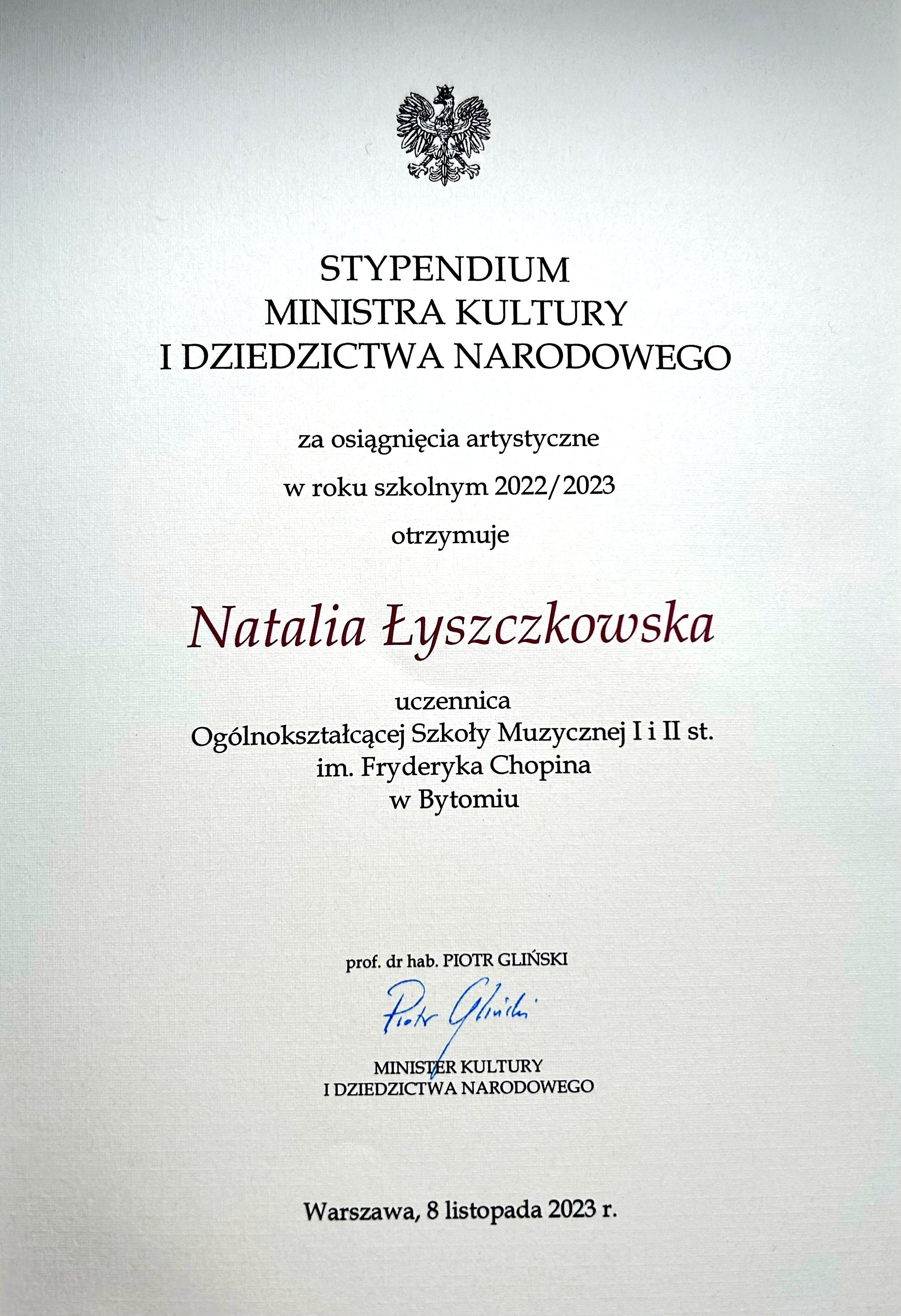 Natalia Łyszczkowska z klasy wiolonczeli p. Beaty Krzanowskiej otrzymała Stypendium Ministra Kultury i Dziedzictwa Narodowego za osiągnięcia artystyczne w roku szkolnym 2022/2023.